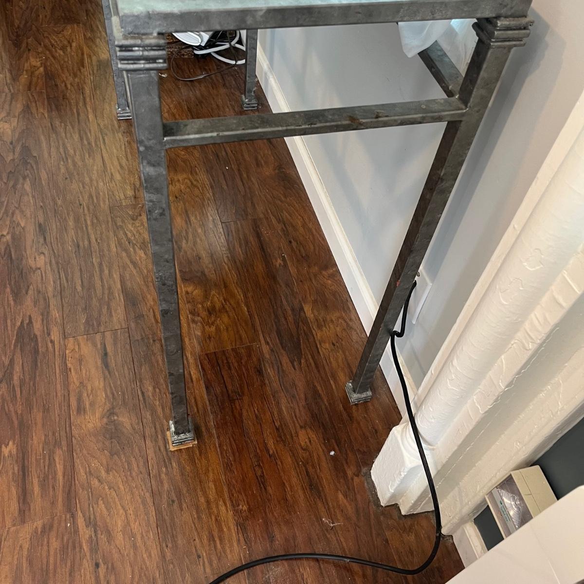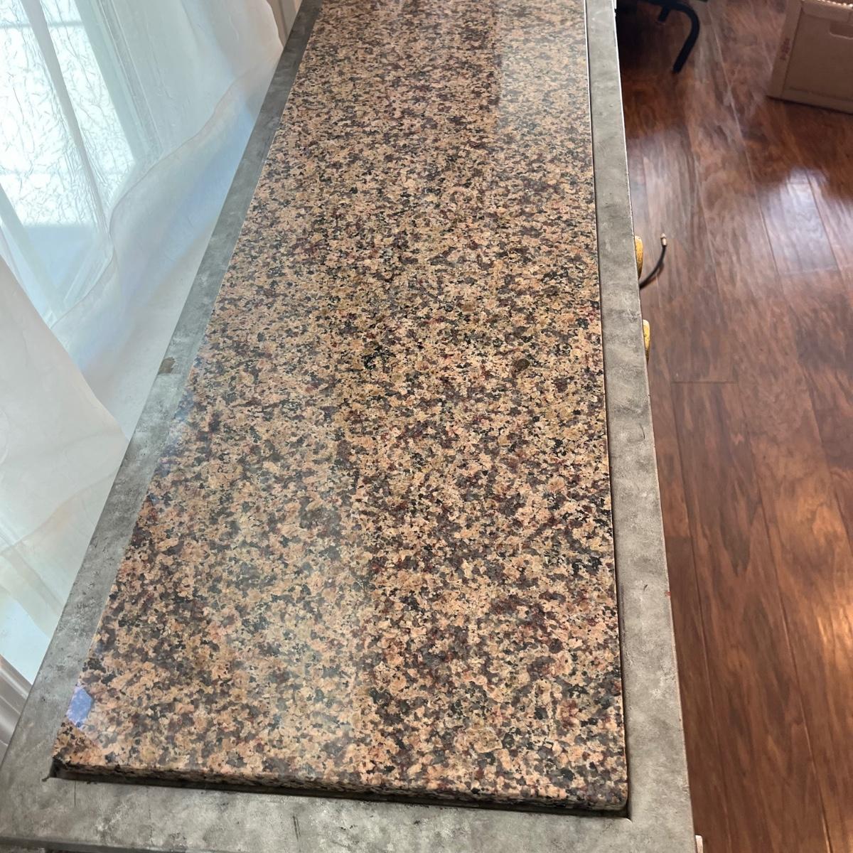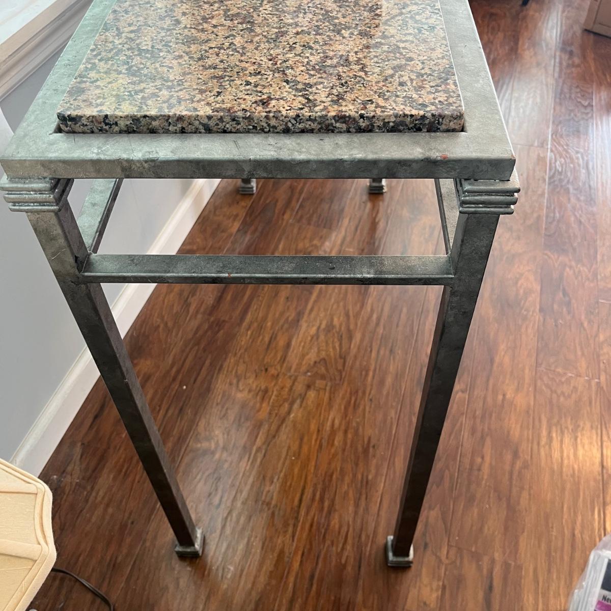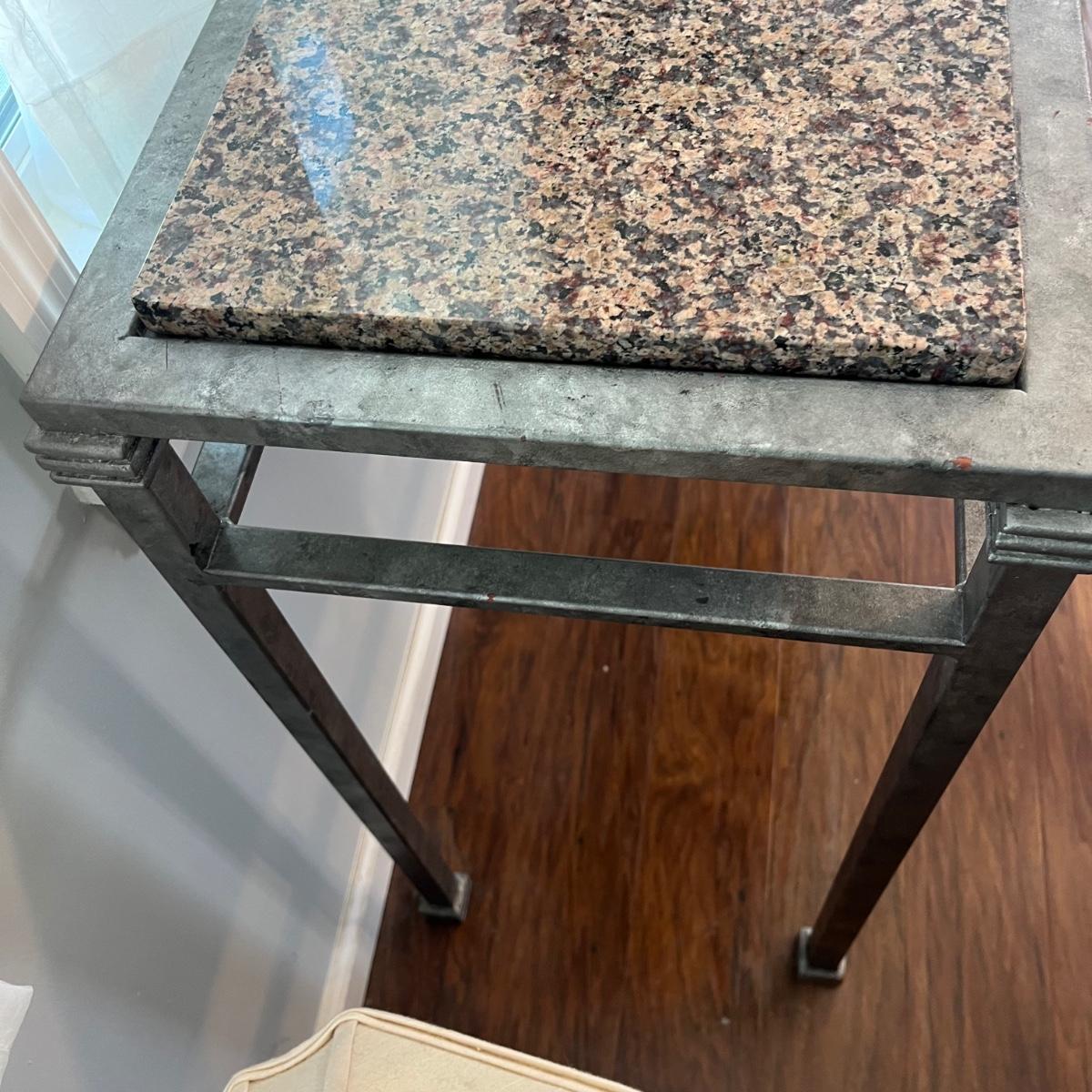 Lot includes a narrow metal table with a stone piece set on top. Table measures 15” x 39” x 32”H.