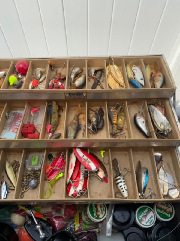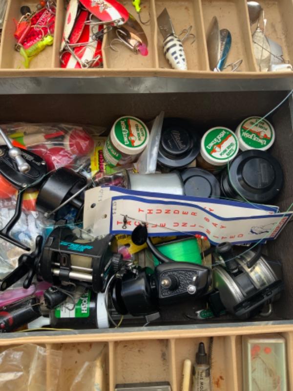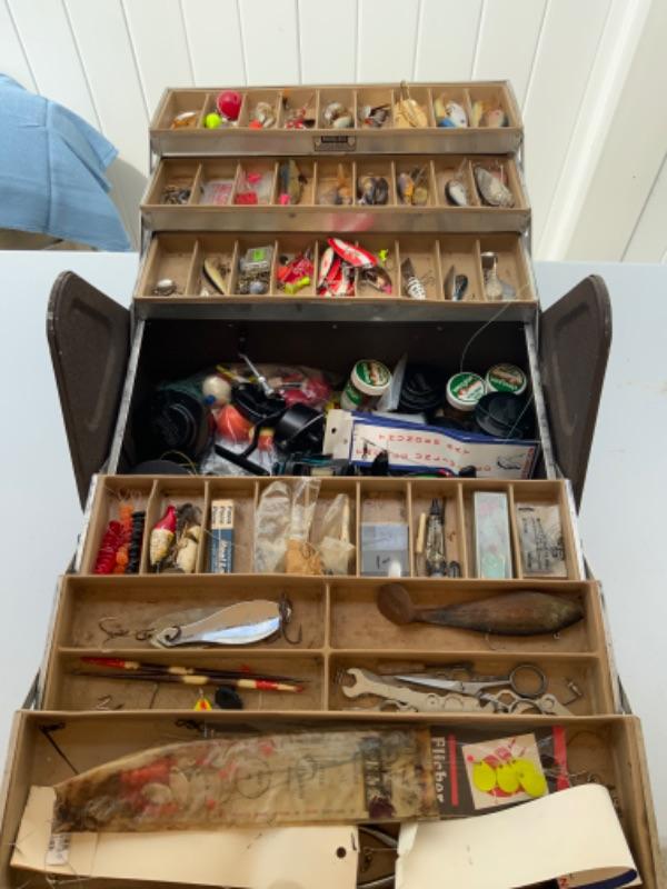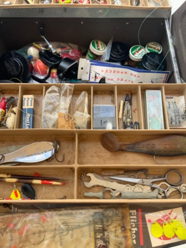 Metal tacklebox stocked full of fishing tackle lot 2631