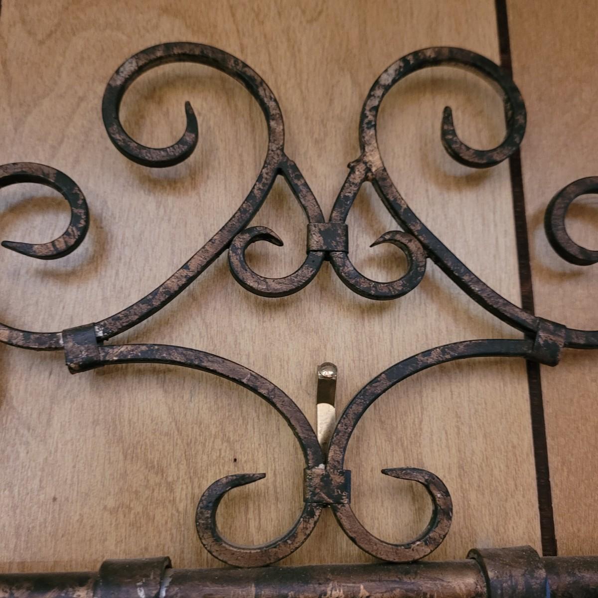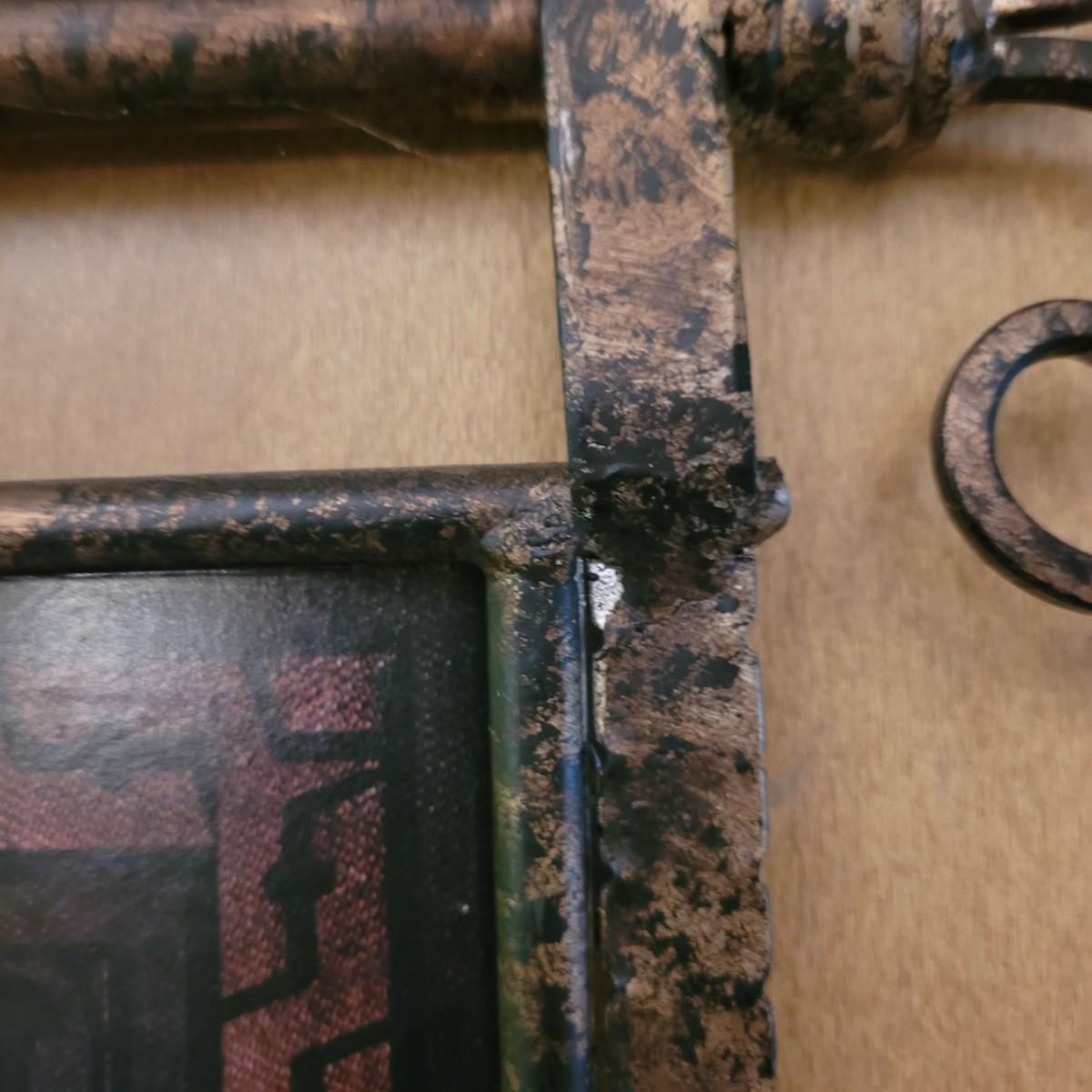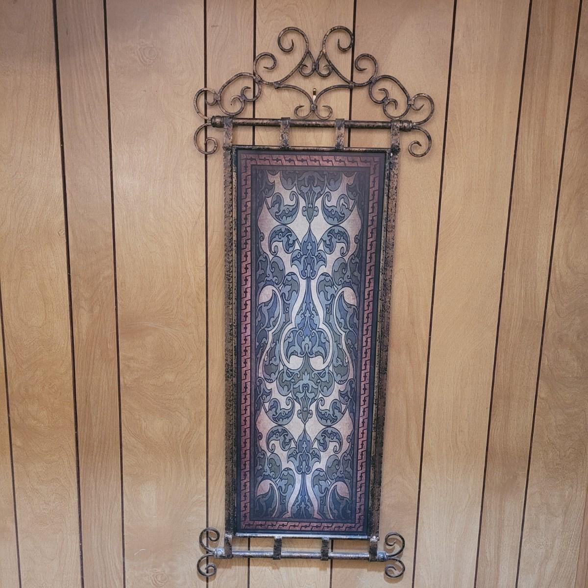 This wrought iron framed tapestry style artwork replicates an art nouveau style. Measures approximately 20” x 48.” Shipping available. Shipping art can be costly. We suggest contacting our preferred local shipping provider, Postage Express, with dimensions and getting an estimate before bidding: (828) 670-5501 or postageexpress@yahoo.com.