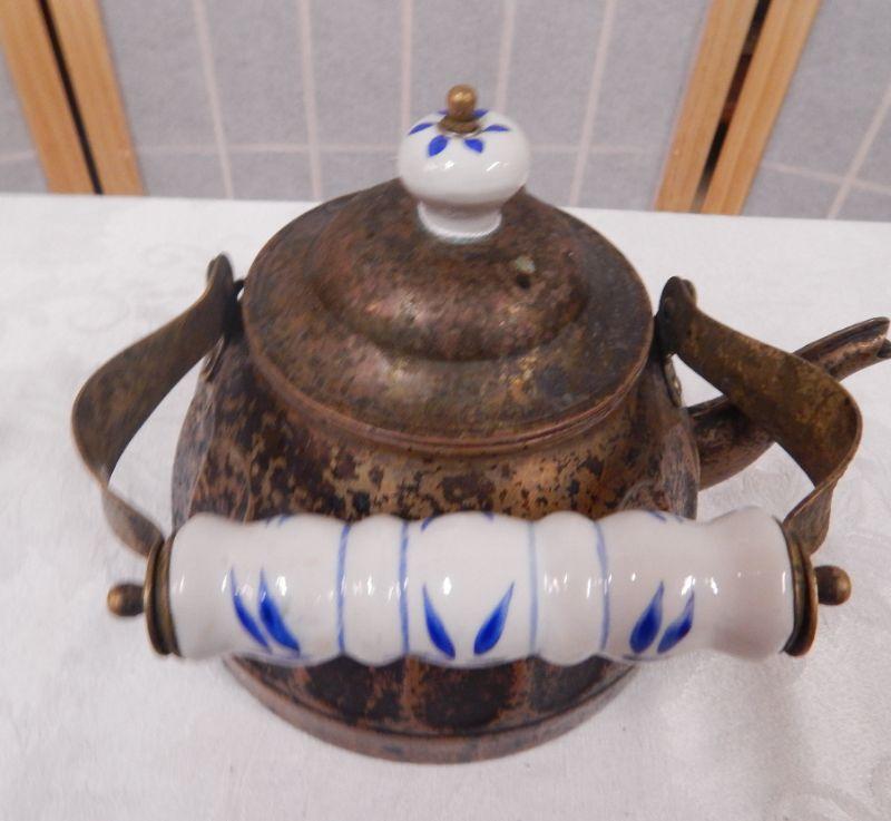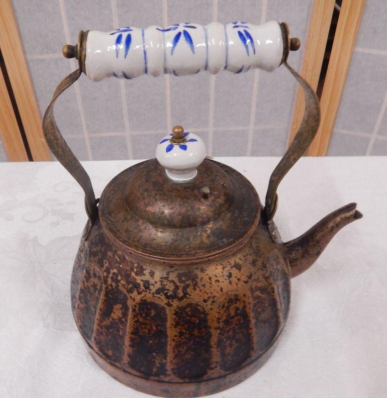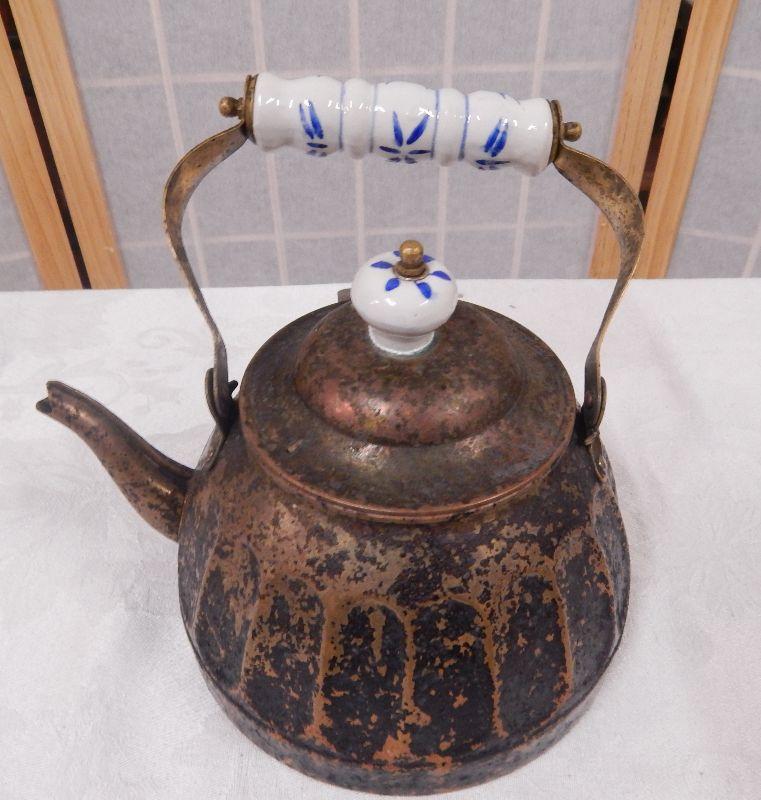 Metal Tea Kettle w/ White & Blue Ceramic Handle - Coppery Patina - 9" Tall w/ Handle Extended - 6-3/4" Bottom Diameter
