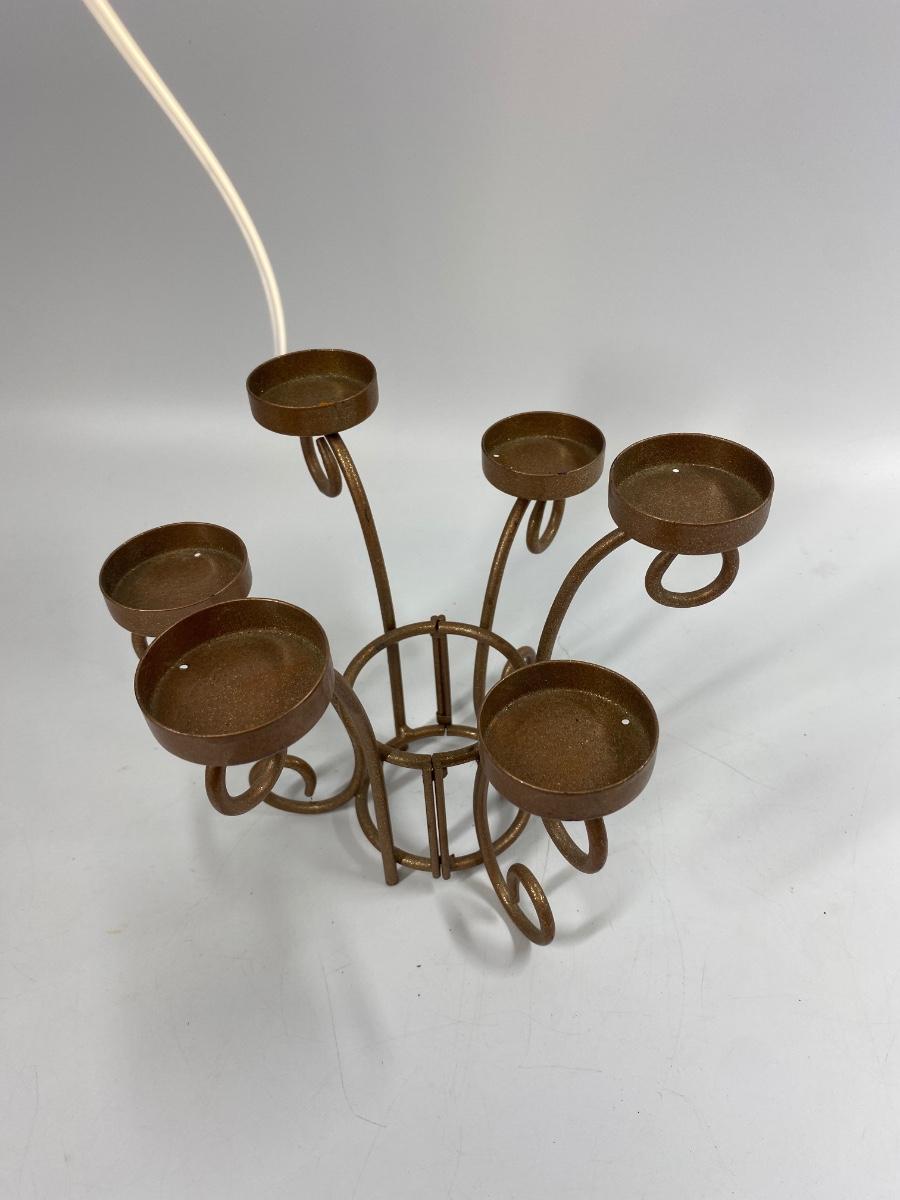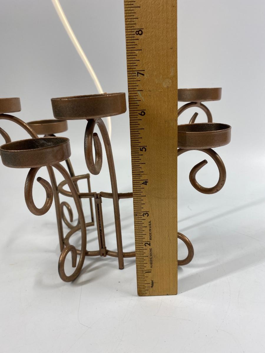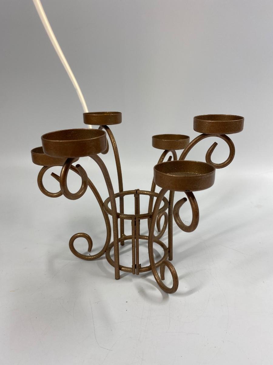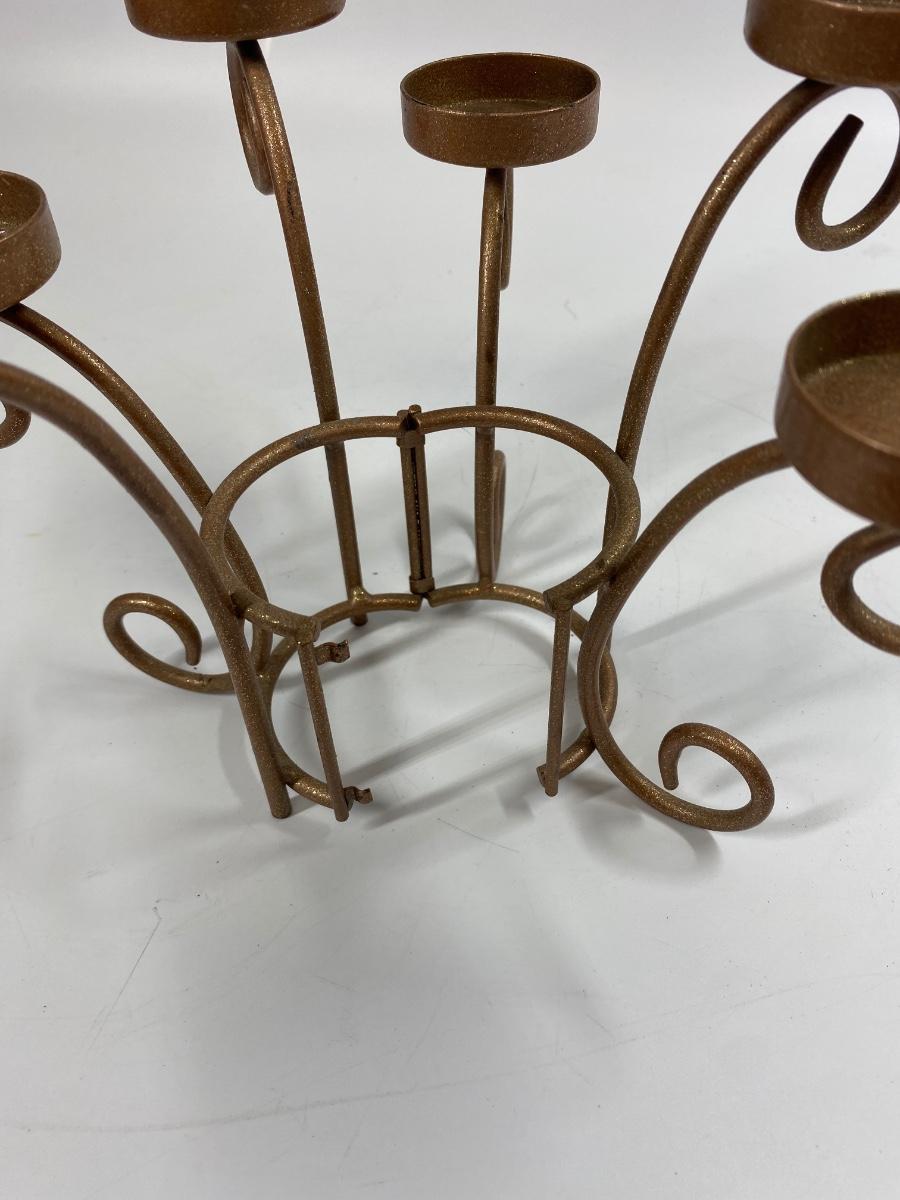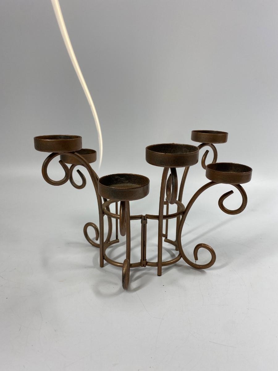 Metal Tea Light 6 Candle Candelabra. The centerpiece hinges and opens not sure why. Displays great, about 6.5" tall.