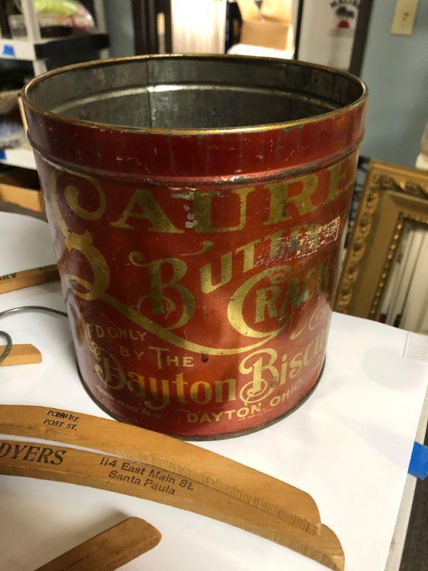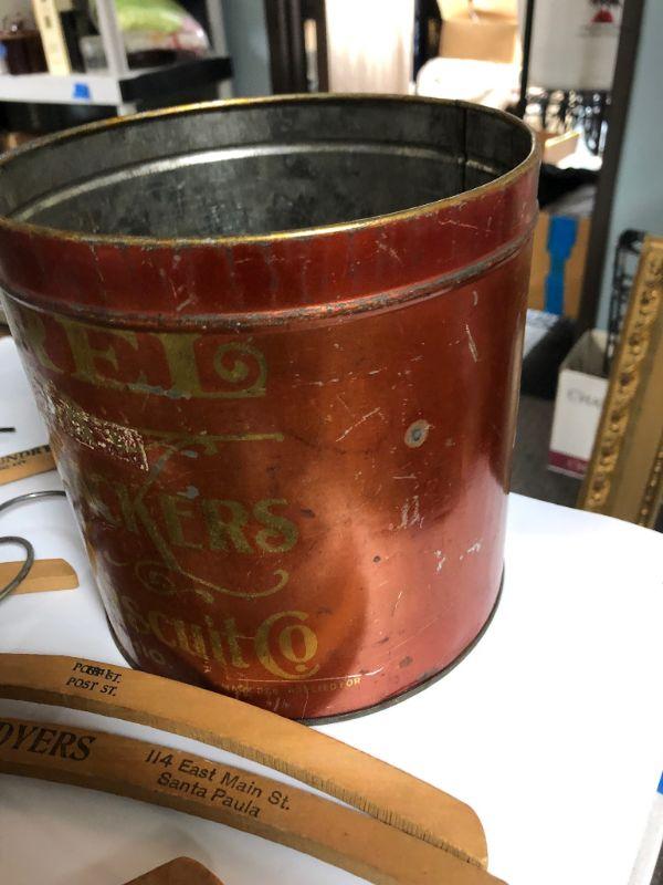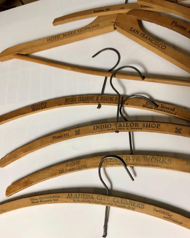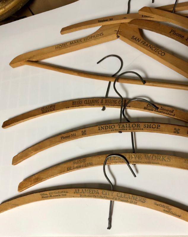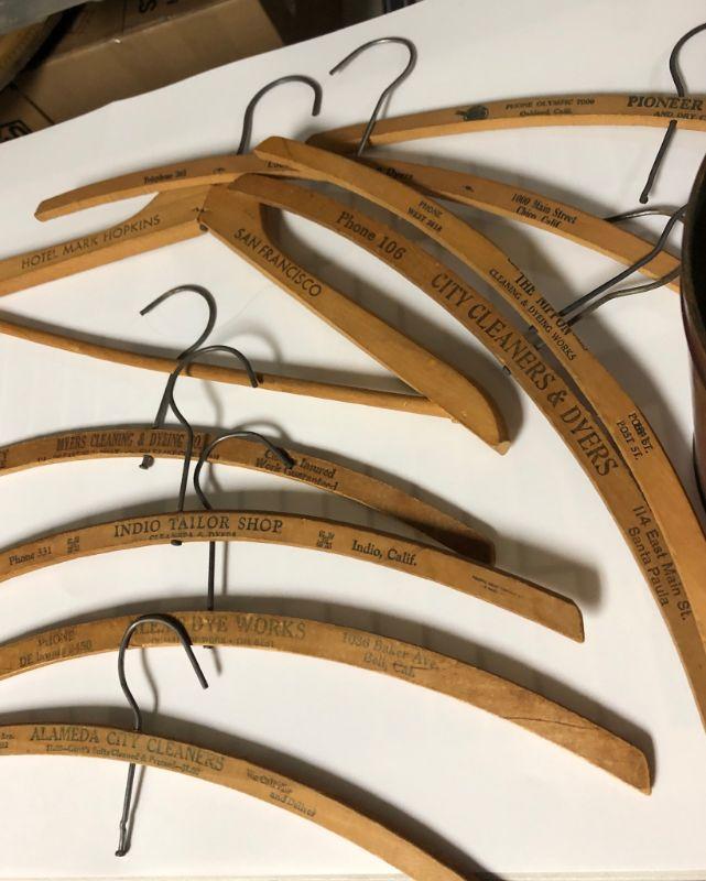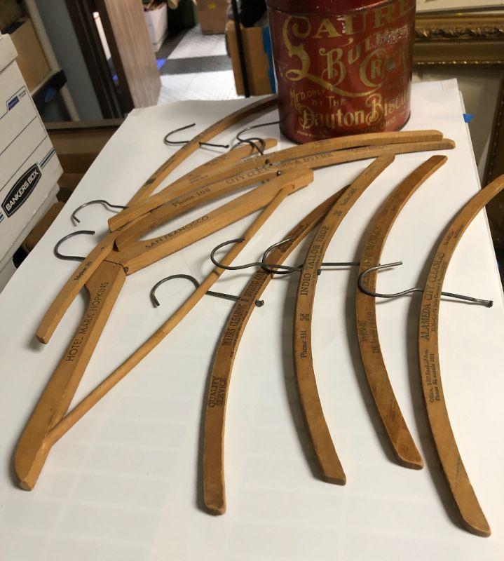 Vintage metal container with vintage wood hangers. Hangers are old advertisement hangers from various cleaners and tailors. Tin and hangers have some wear.