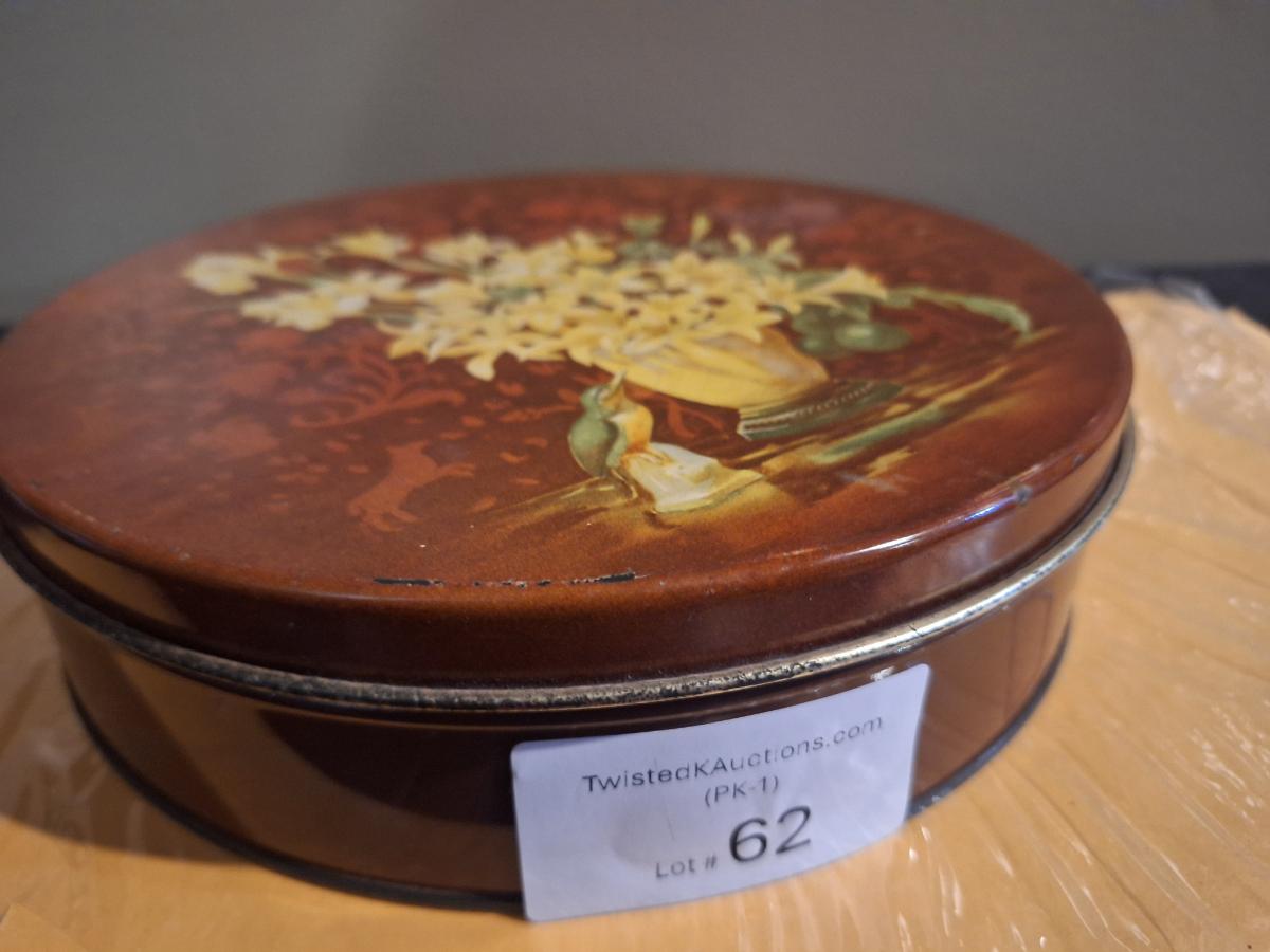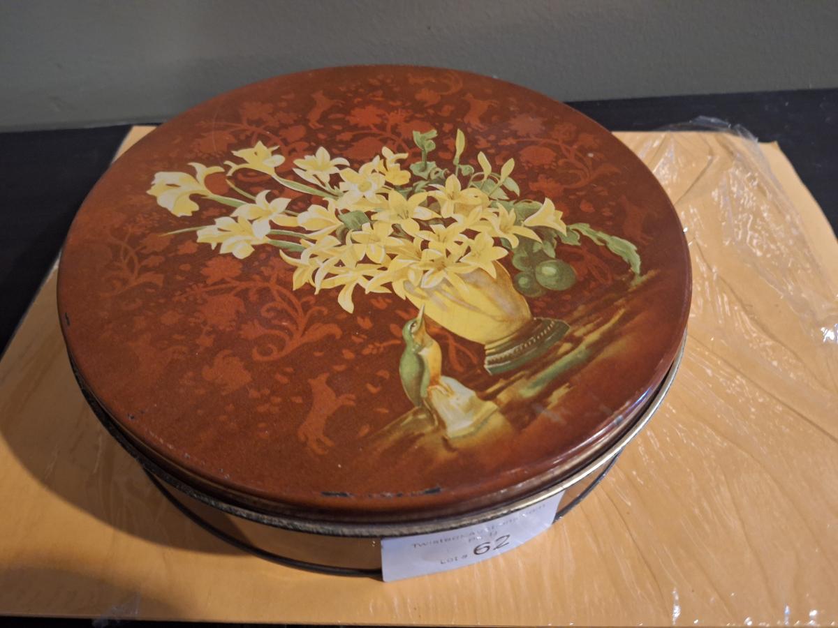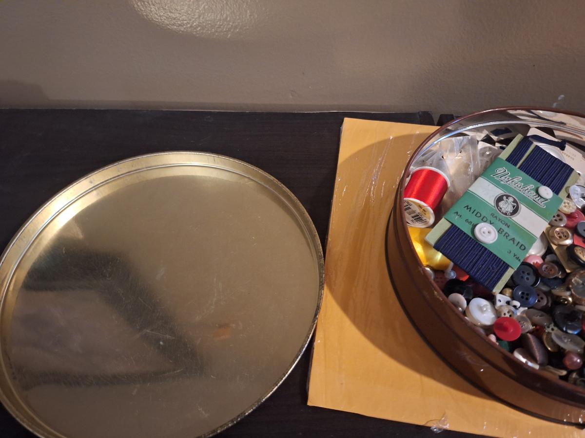 metal tin of buttons and sewing related