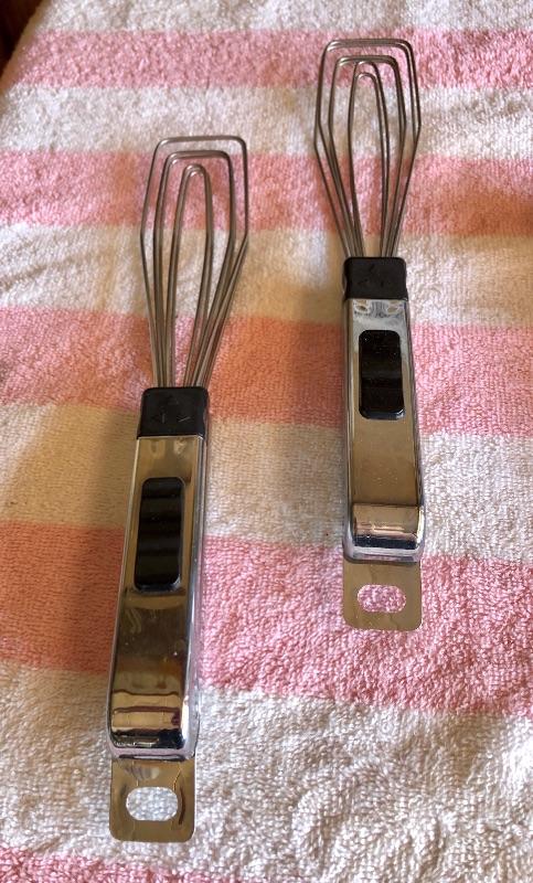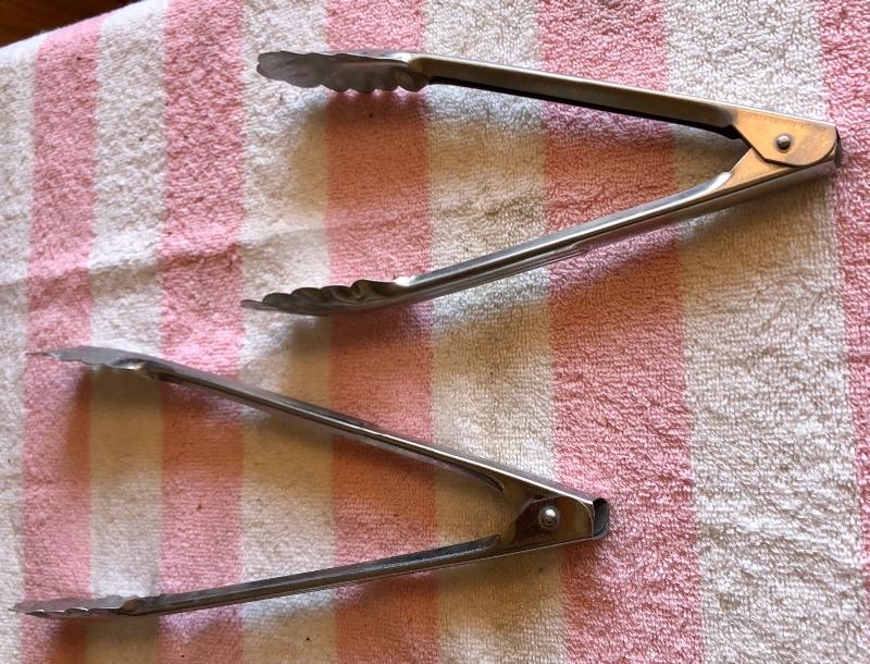 Two pairs of metal tongs and flat whisks. Good condition.