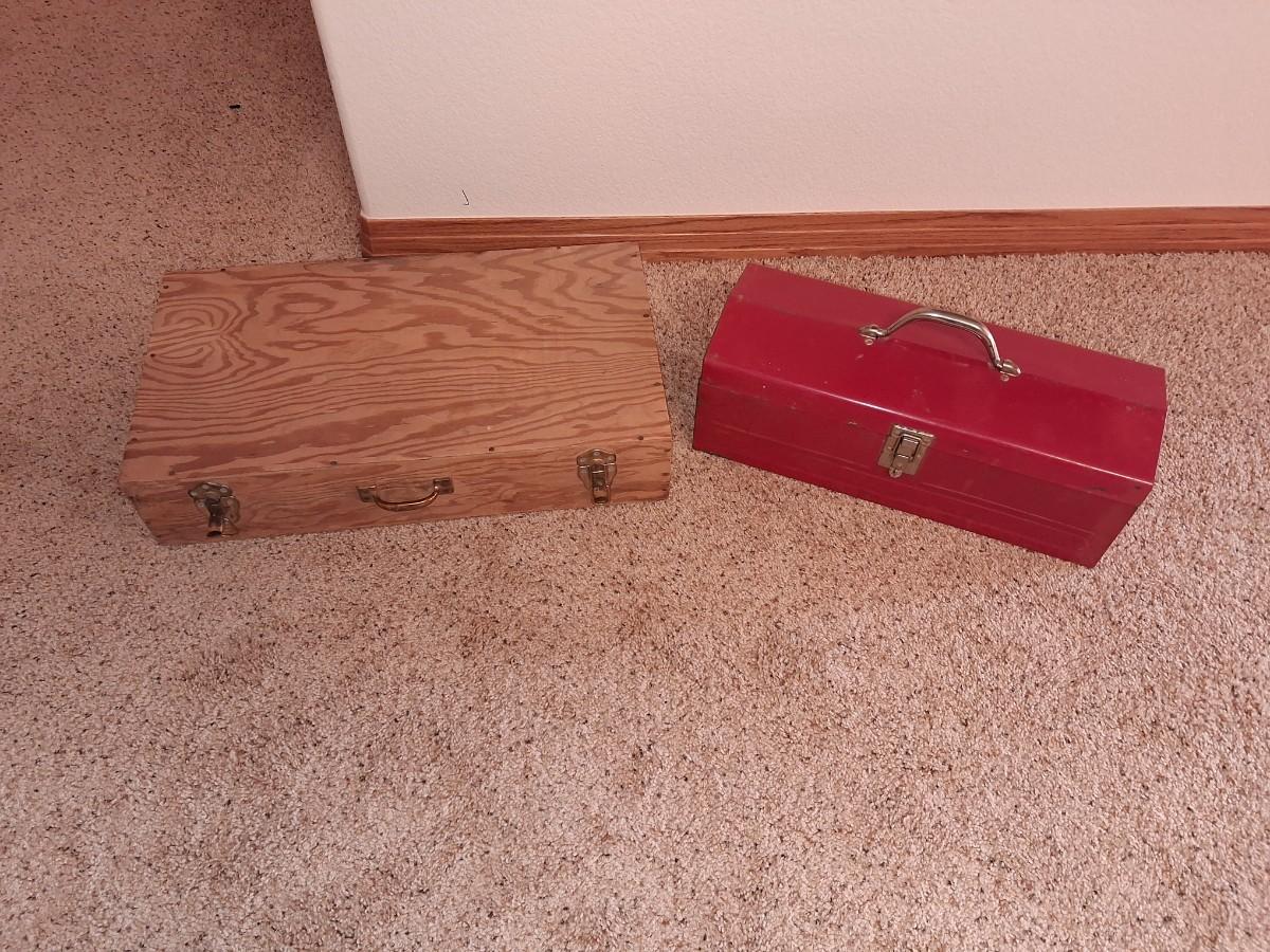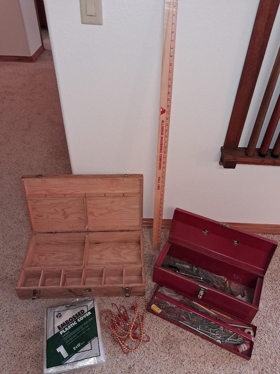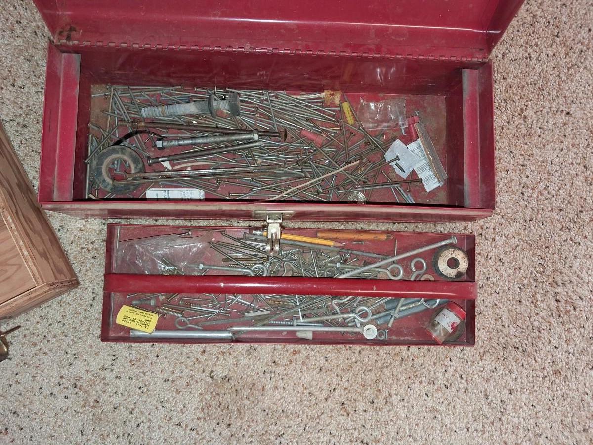 METAL TOOL BOX, SECTIONED WOODEN BOX AND MORE