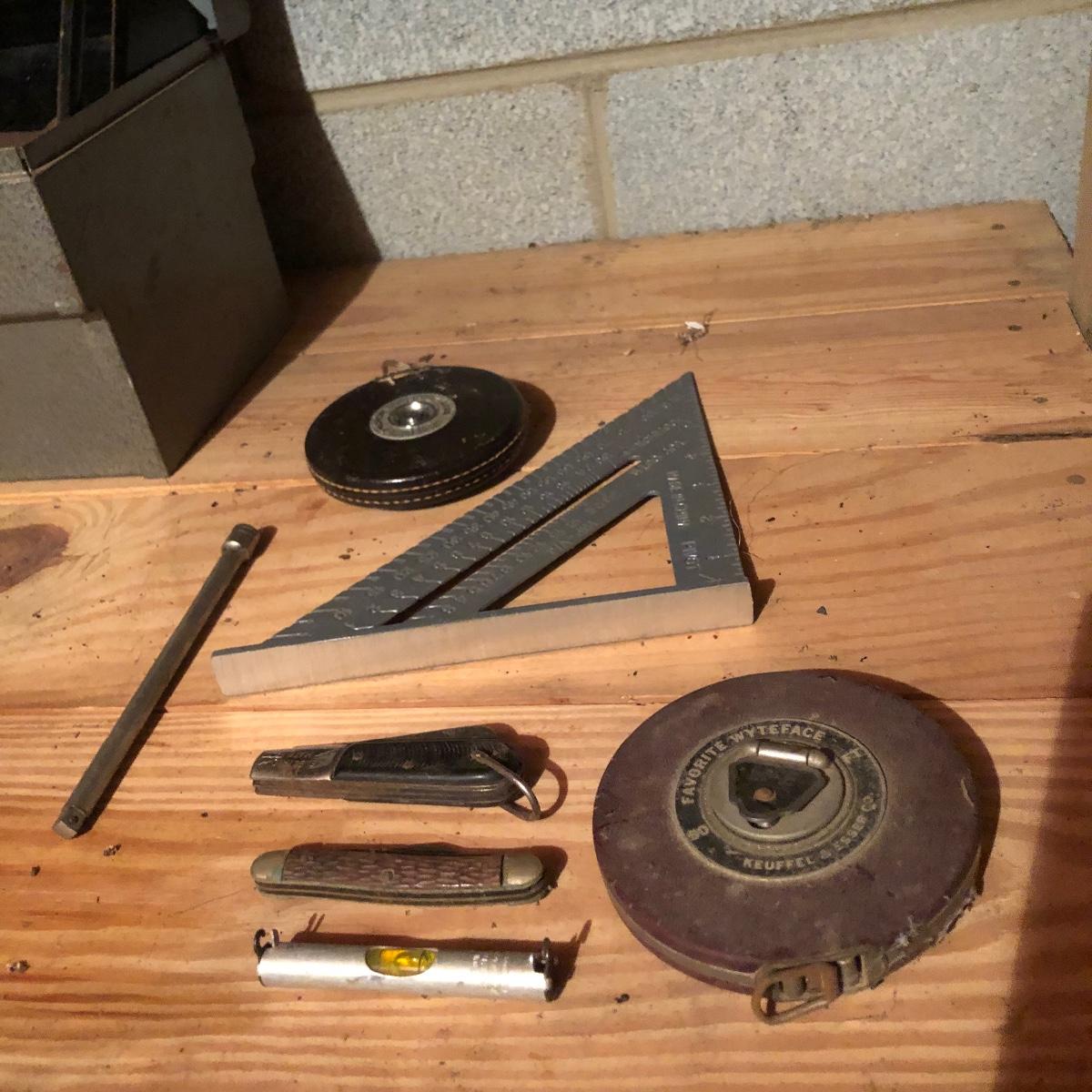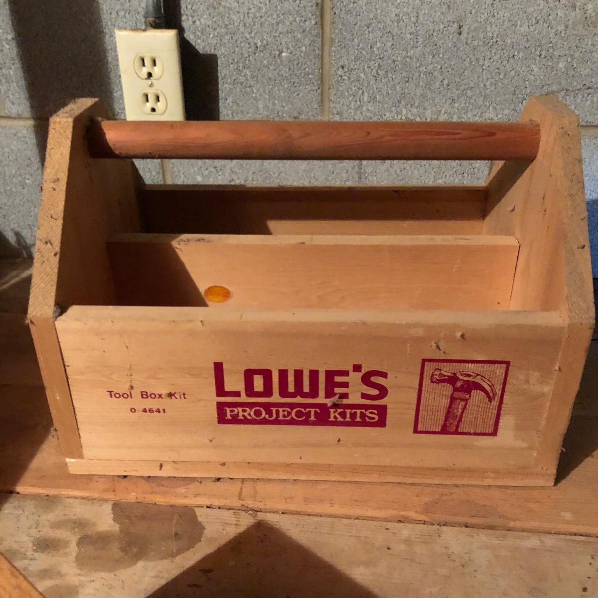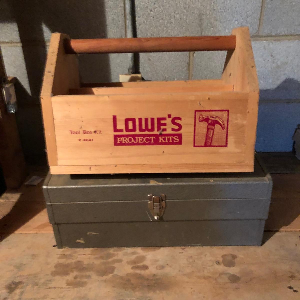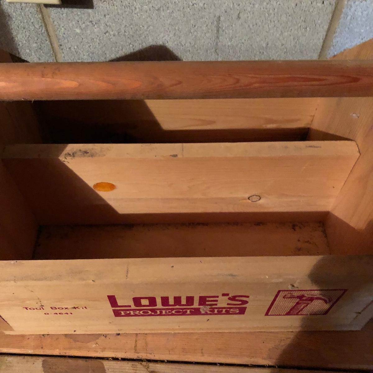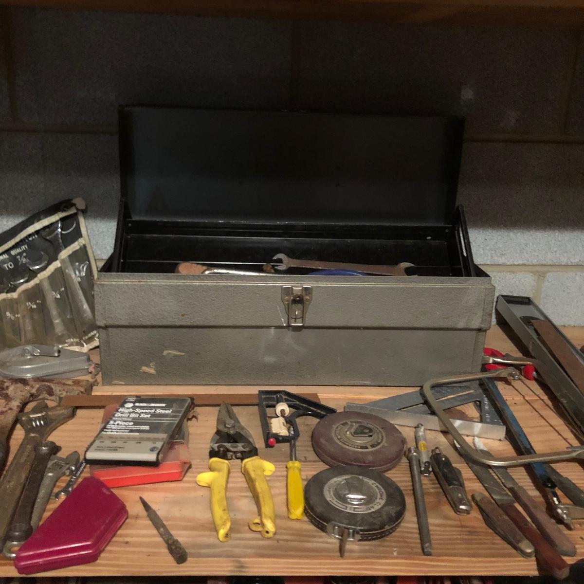 Lot includes a metal toolbox with tray, wooden tool carrier and a variety of tools including screwdrivers, Vise Grips, pliers, measuring tapes, chalk line, level, hack saw, pipe wrench, hammer and more. Toolbox measures 7” x 19” x 7.5”.