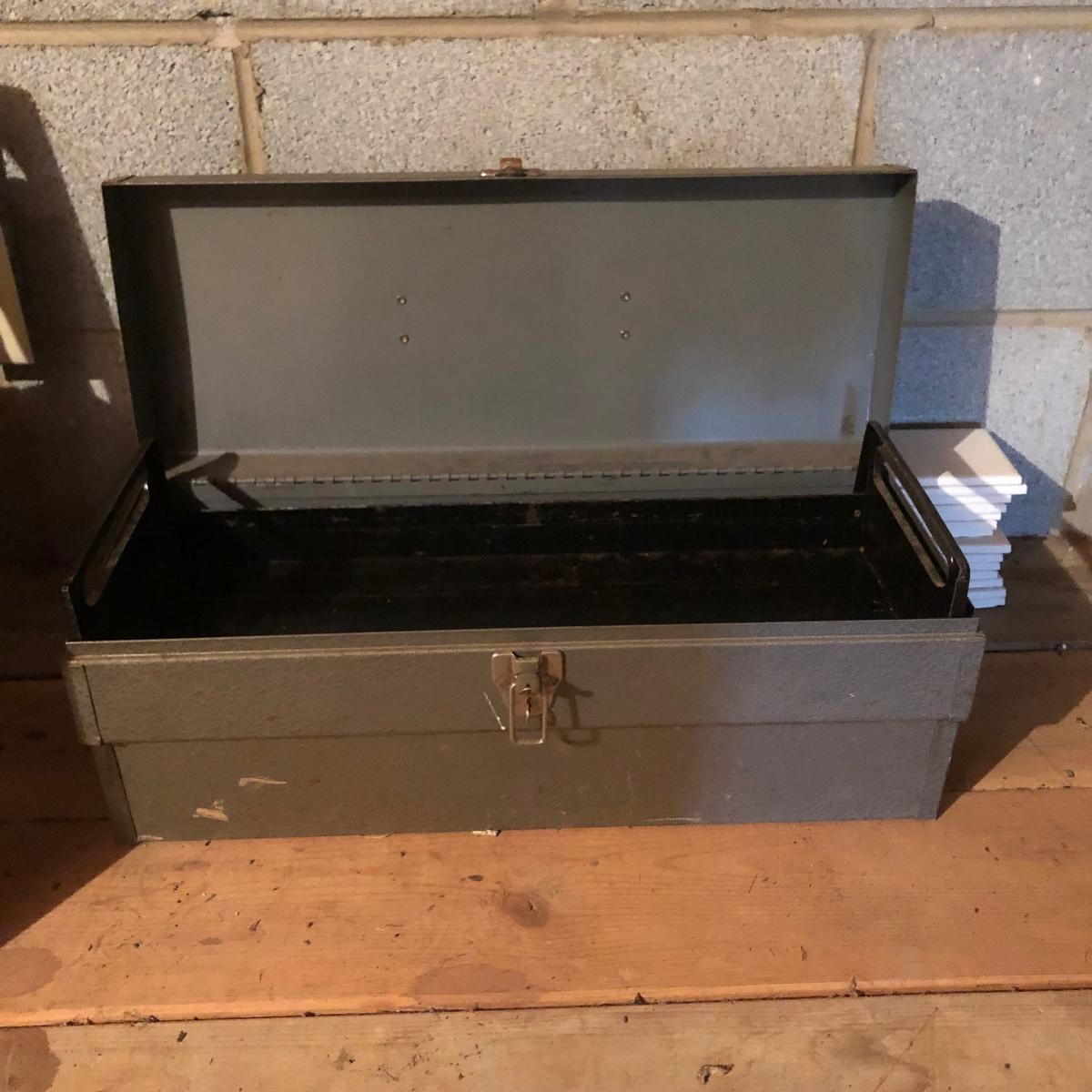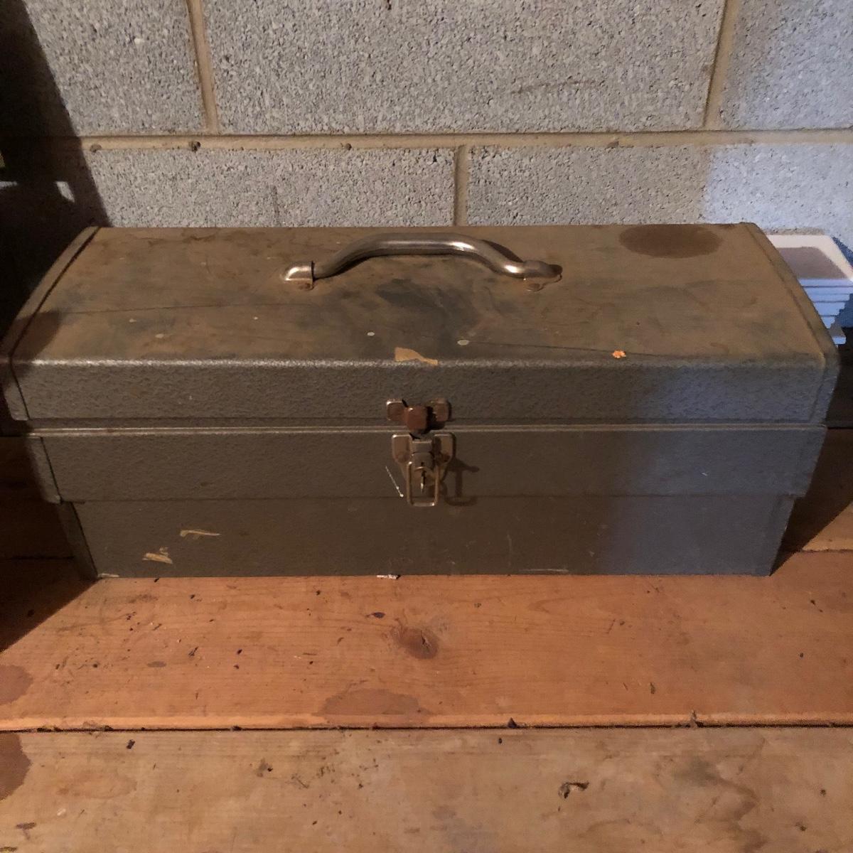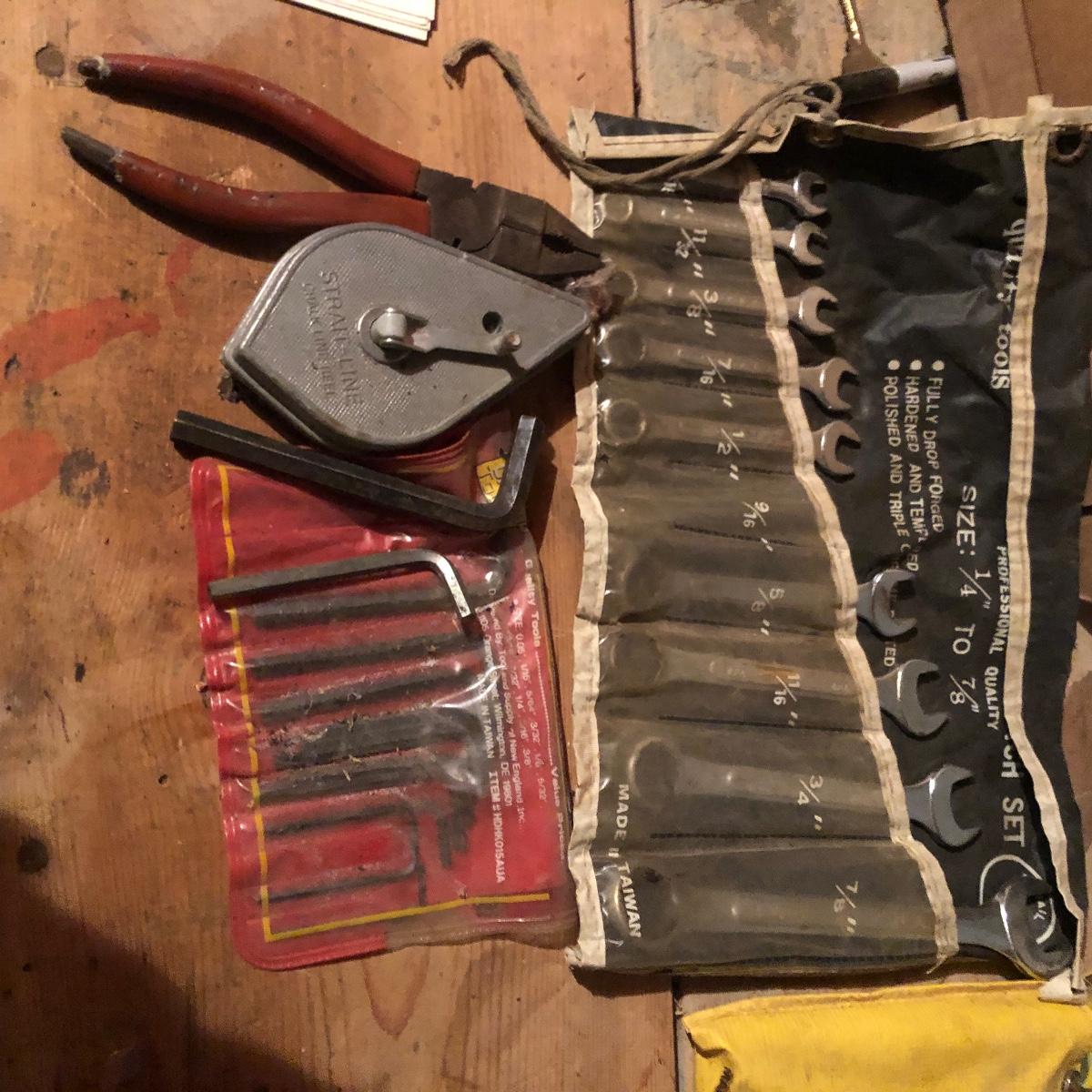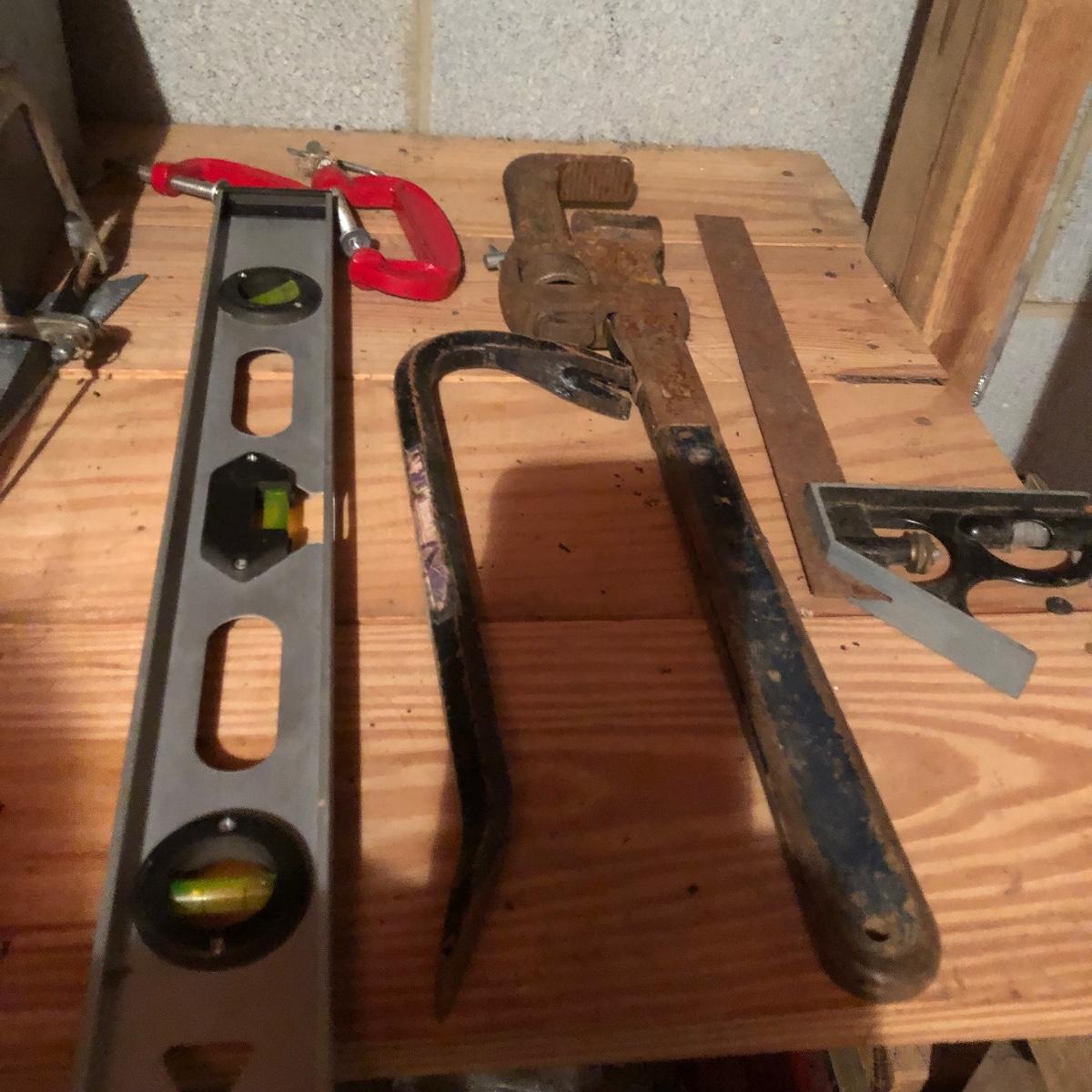 Lot includes a metal toolbox with tray, wooden tool carrier and a variety of tools including screwdrivers, Vise Grips, pliers, measuring tapes, chalk line, level, hack saw, pipe wrench, hammer and more. Toolbox measures 7” x 19” x 7.5”.
