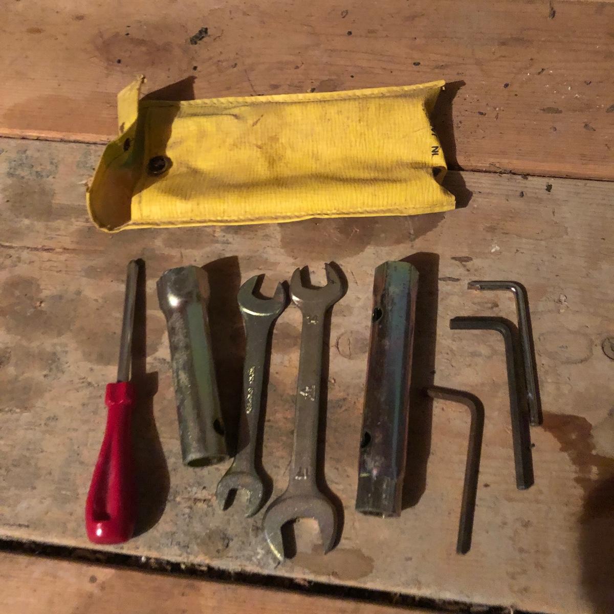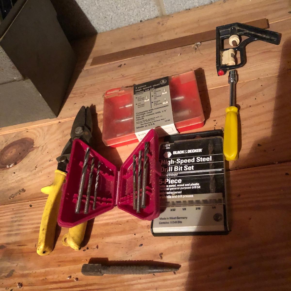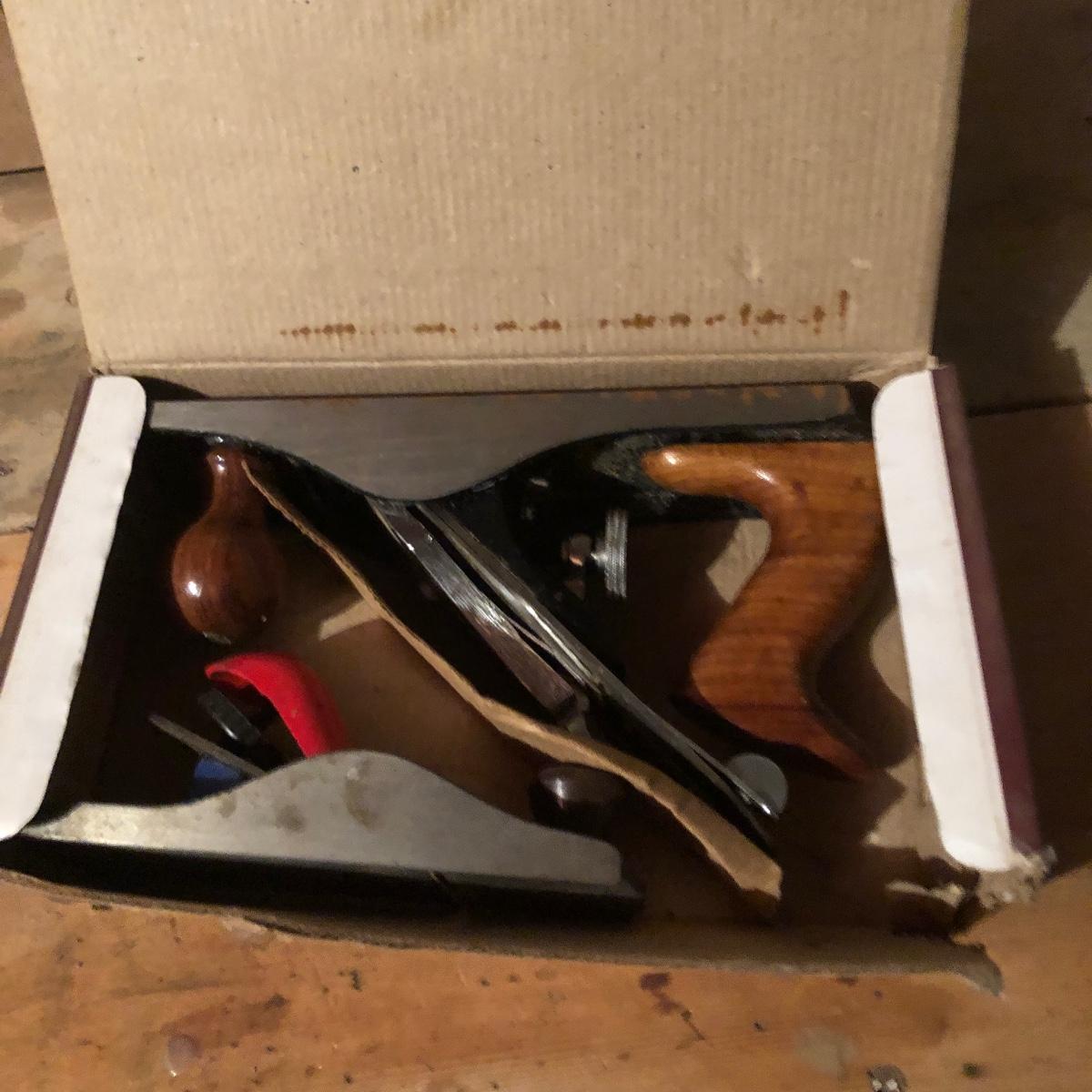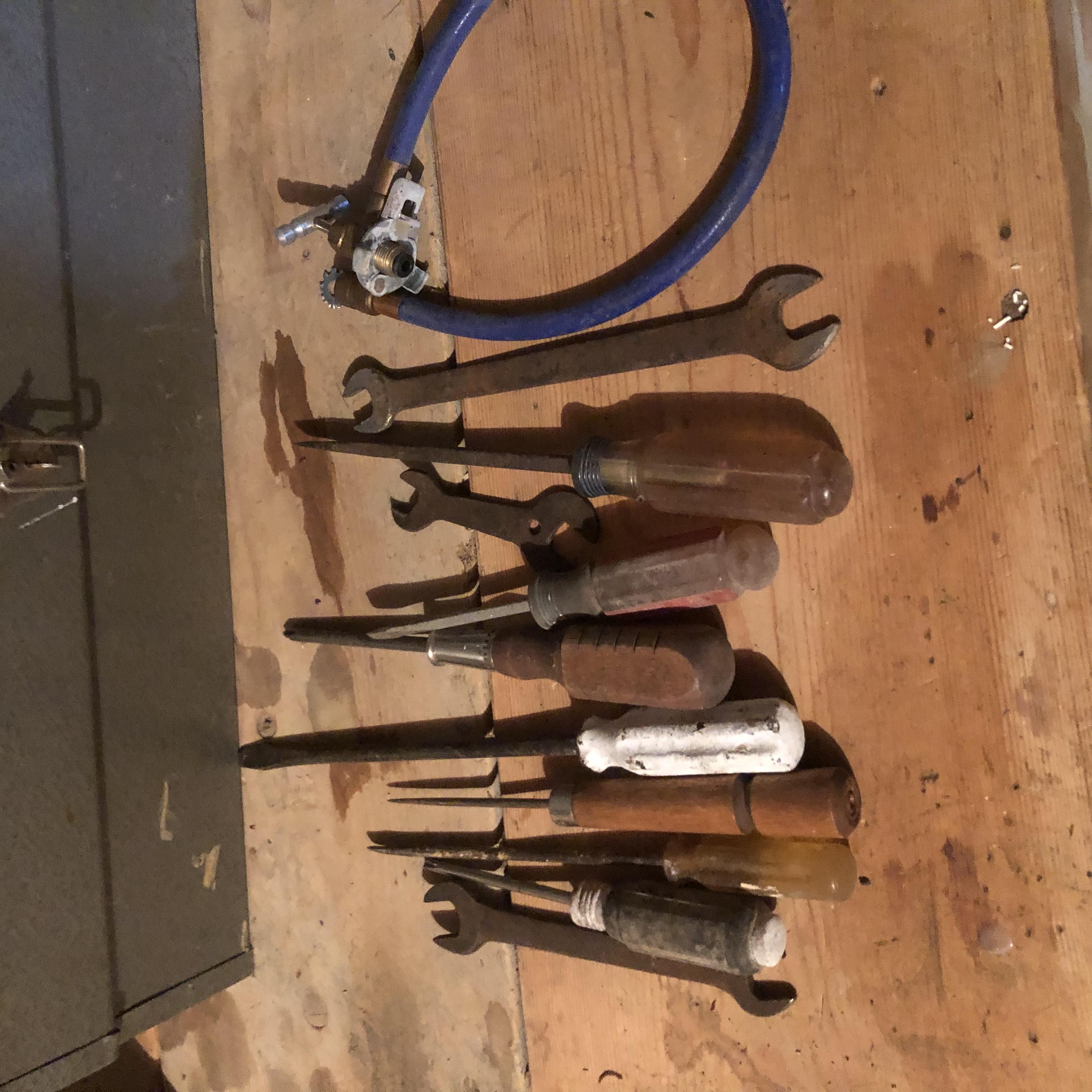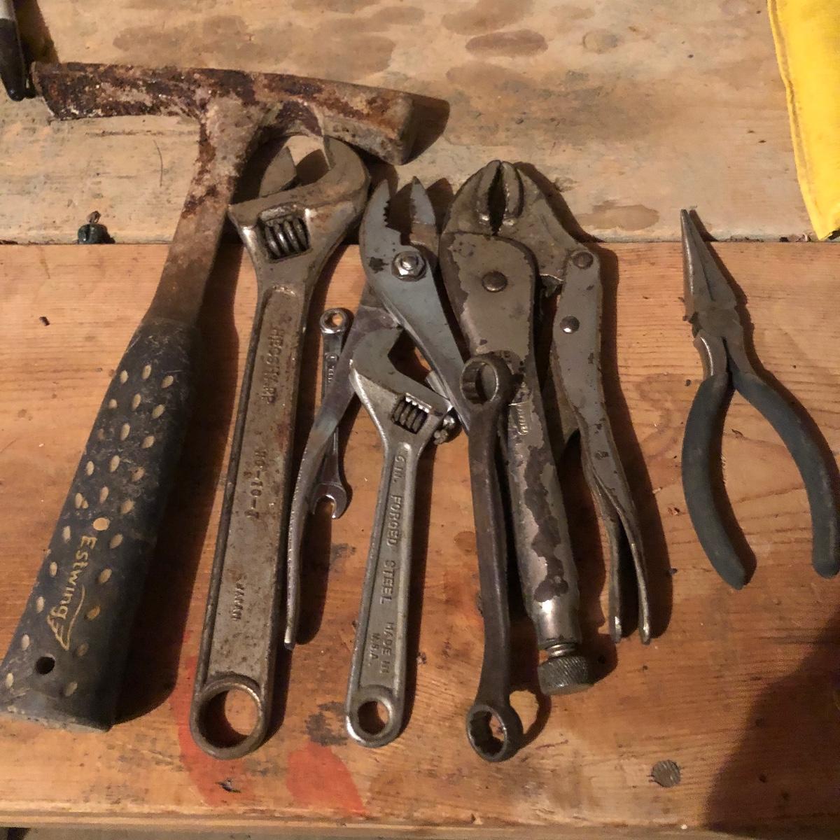 Lot includes a metal toolbox with tray, wooden tool carrier and a variety of tools including screwdrivers, Vise Grips, pliers, measuring tapes, chalk line, level, hack saw, pipe wrench, hammer and more. Toolbox measures 7” x 19” x 7.5”.