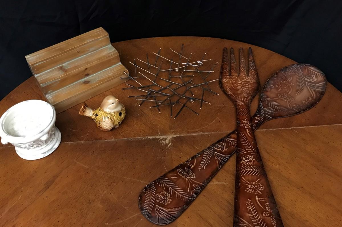 Decor: (metal tote *NOT INCLUDED*) candle pedestal, spoon and fork wall decor, ceramic bird.shelf, wired basket;