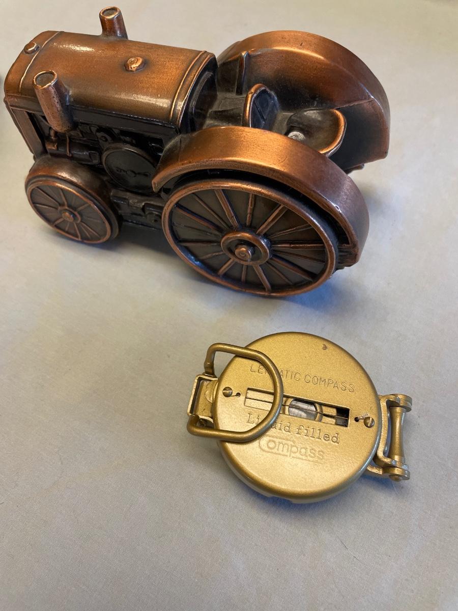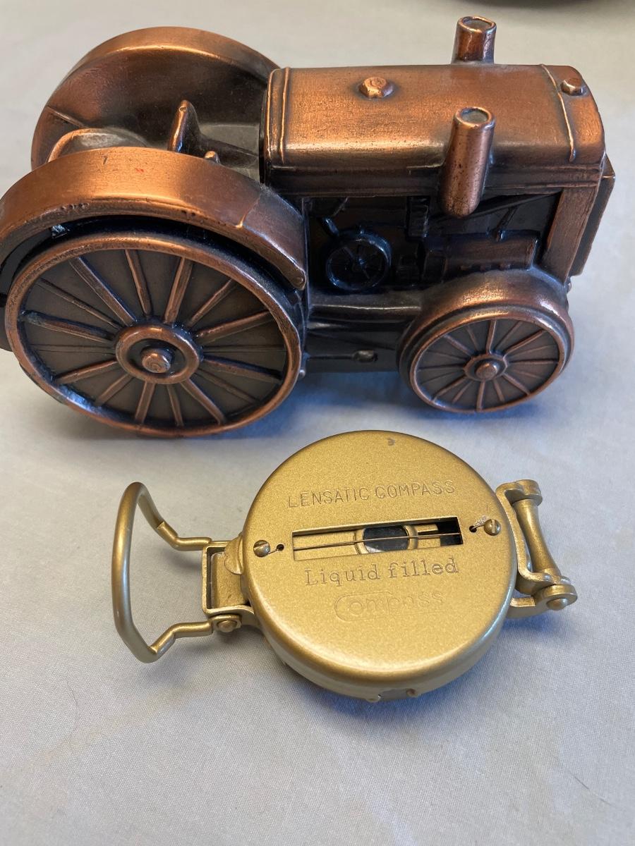 Metal tractor bank and Lensatic Compass