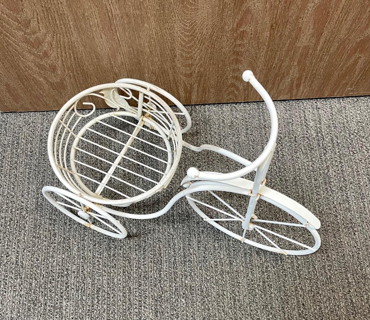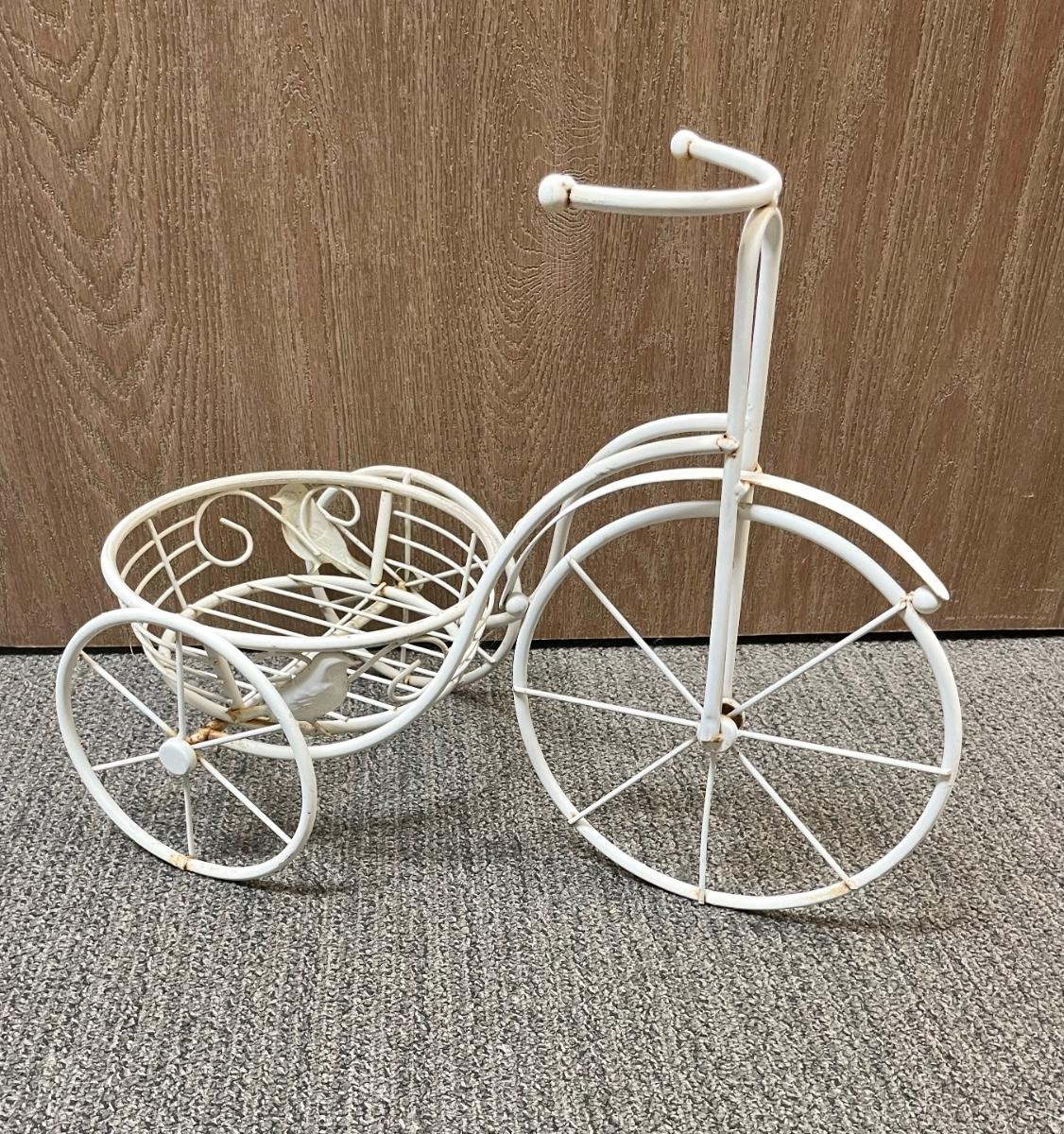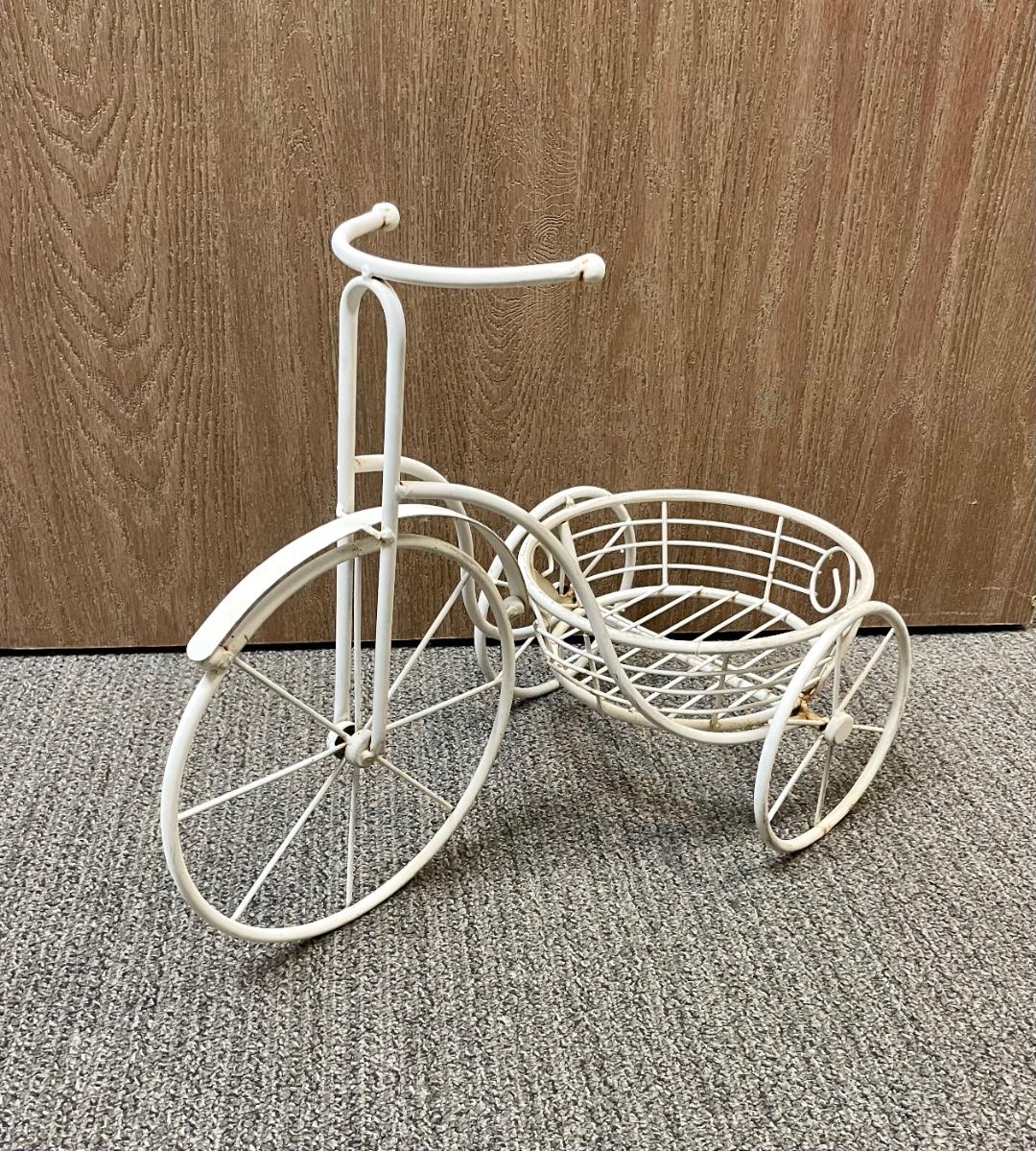 Wire-frame tricycle with a large basket for holding a potted plant where the seat would be. Good, solid condition.