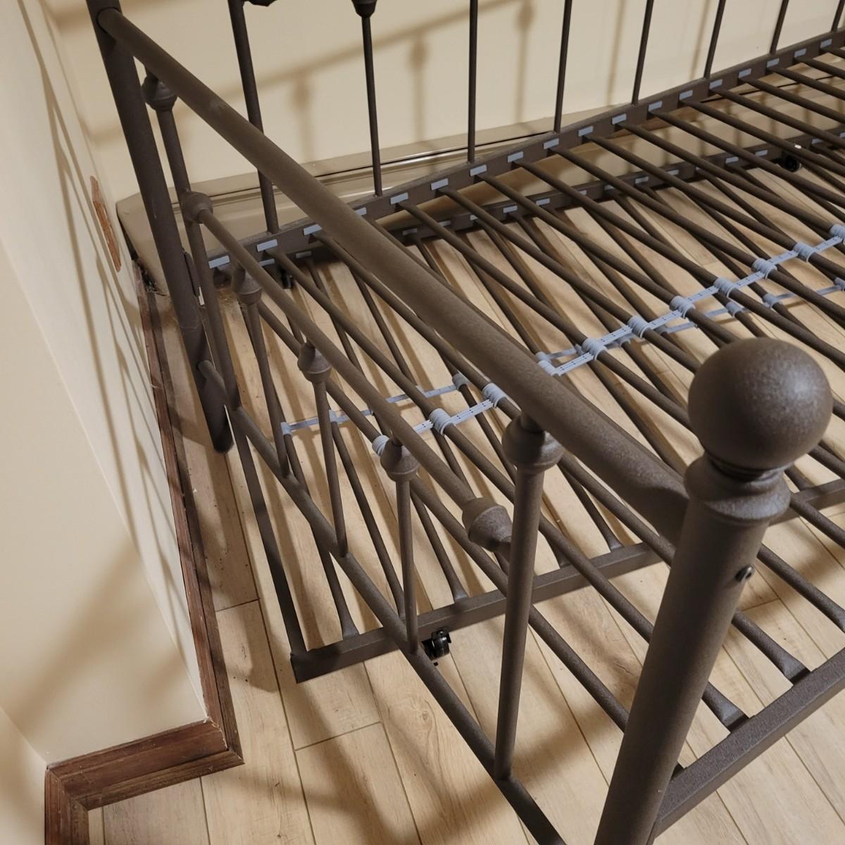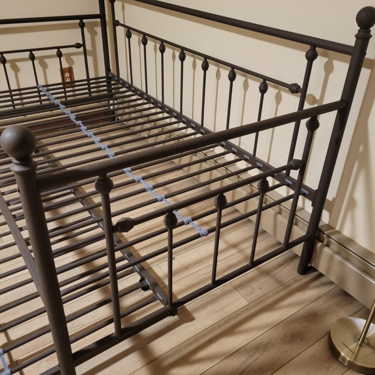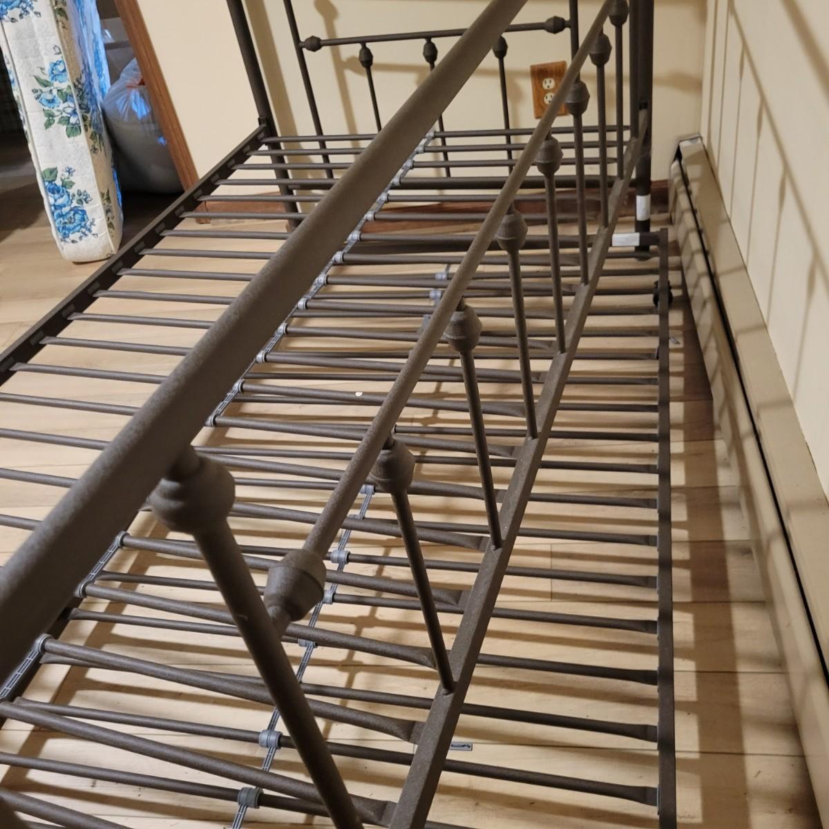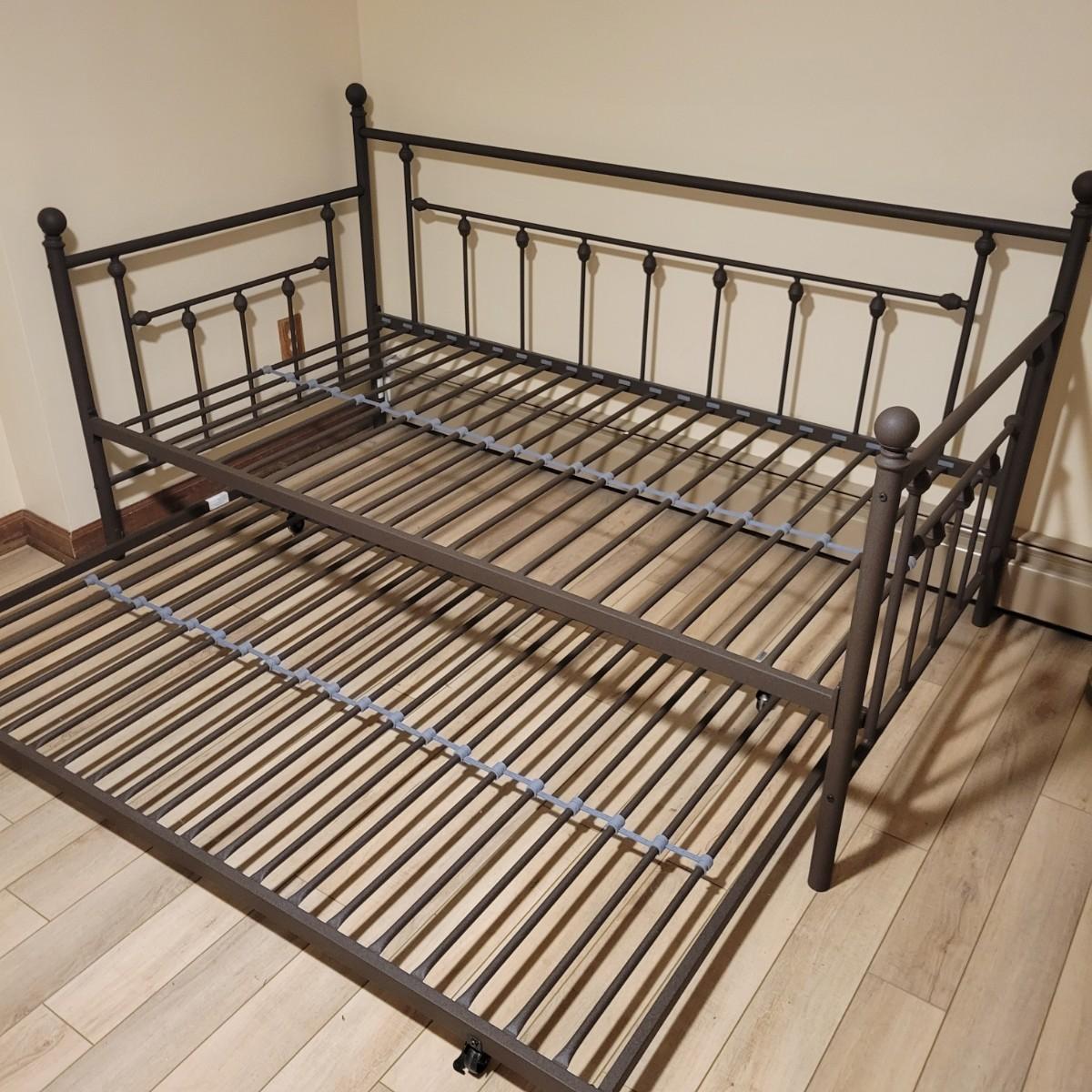 A metal trundle day bed that measures approximately 77" x 41" x 41"H. The day bed includes a pull out trundle on wheels. Additionally, there is a Madison Park comforter and pillow shams, along with accent pillows. The winning bidder will have the option to take the mattresses, but will not be required to do so. Local pickup only. Winning bidder must bring assistance to help move and load this item due to its weight and/or size.