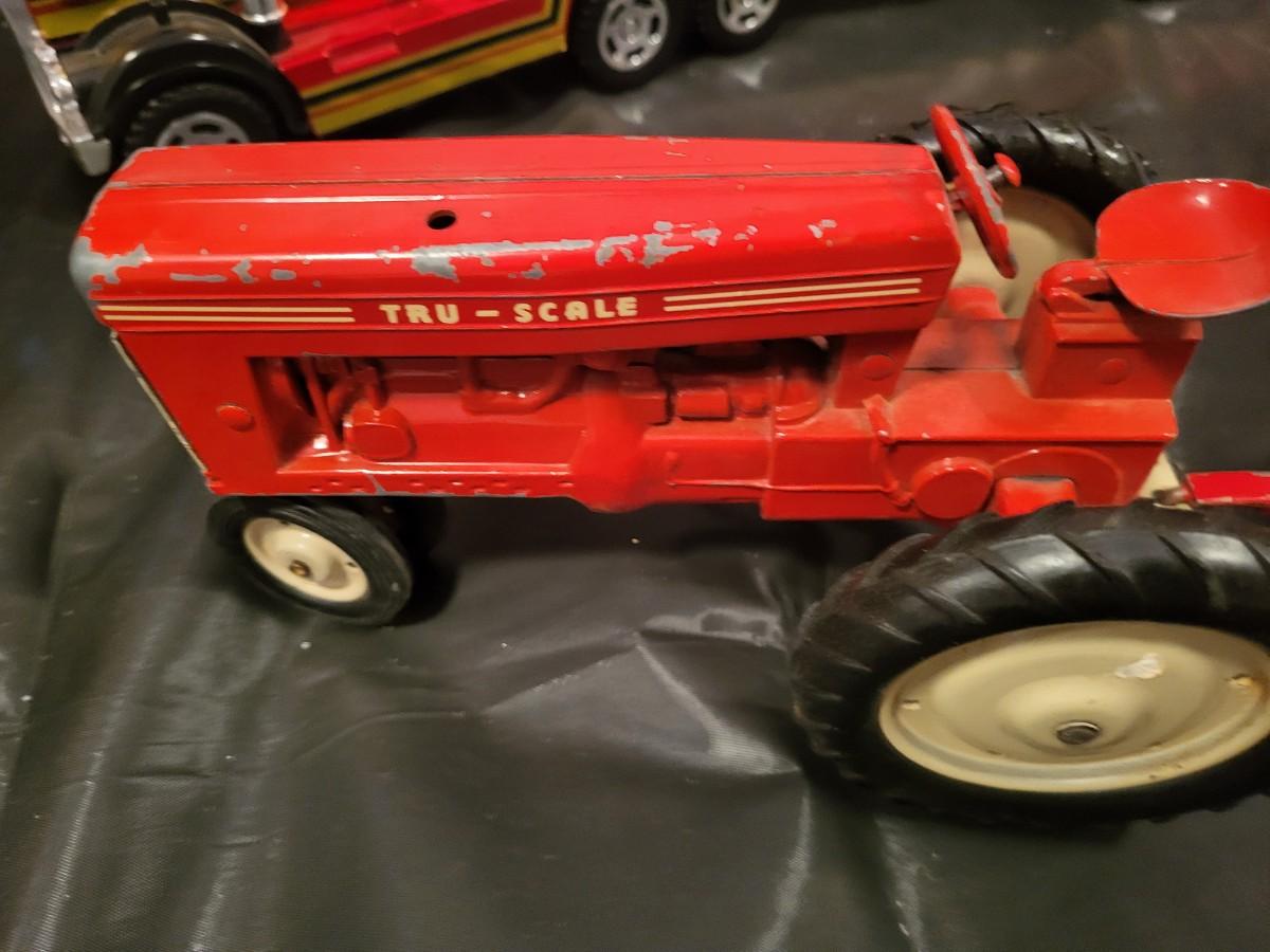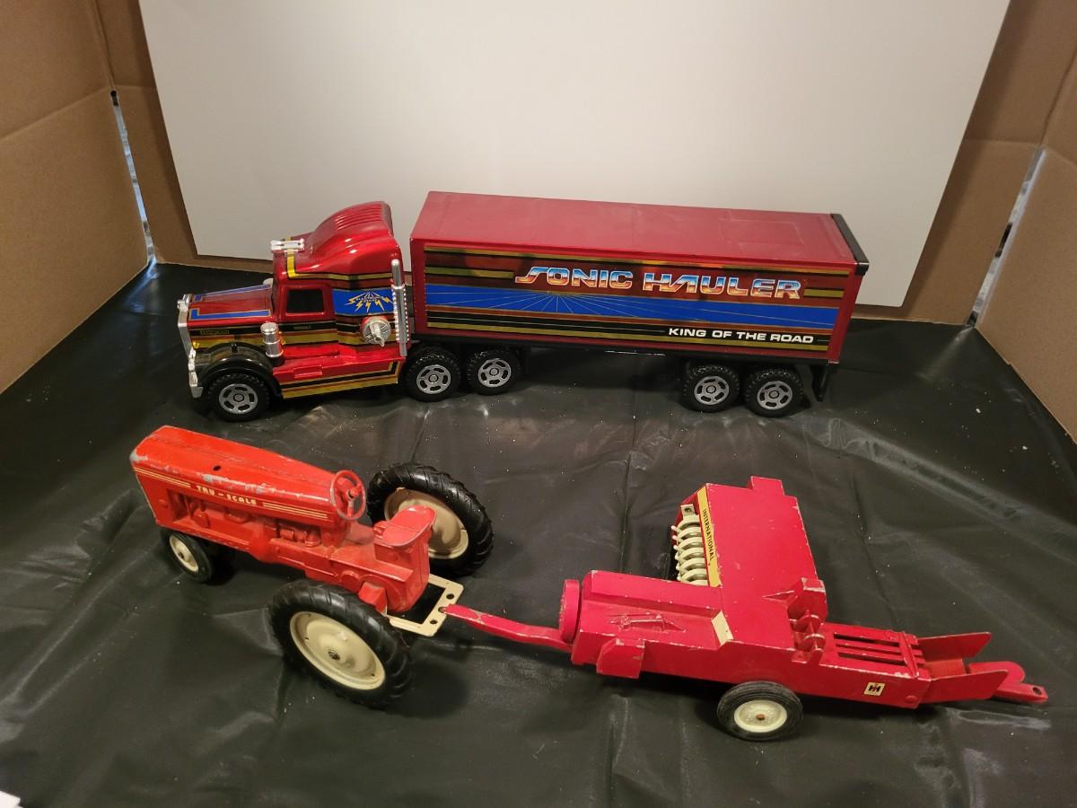 METAL TRU-SCALE TRACTOR, INTERNATIONAL BALER AND PLASTIC SONIC HAULER