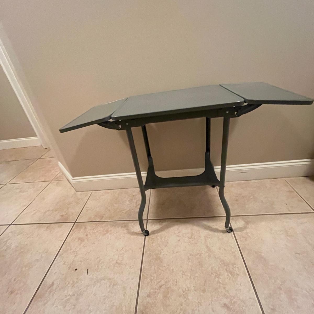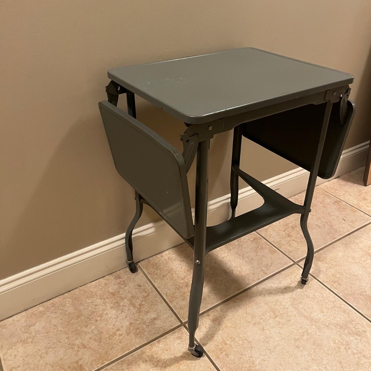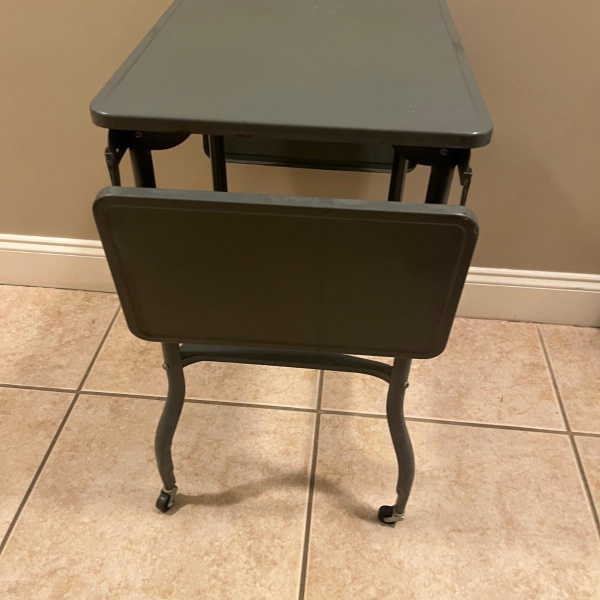 Lot includes a metal typewriter stand on wheels with drop sides. Table measures 35” x 14” x 26”H when sides are up and 20.5” x 14” x 26”H when sides are down.