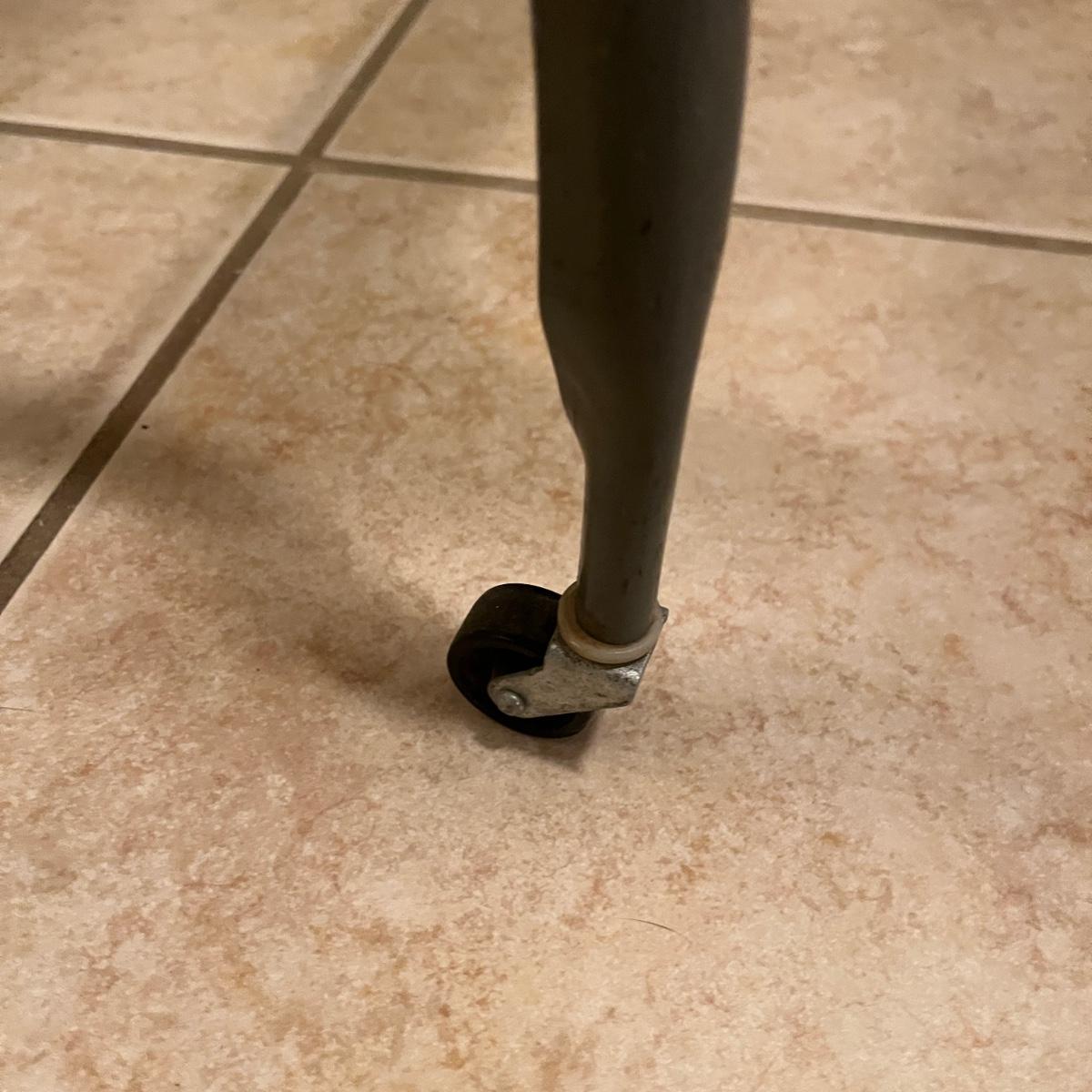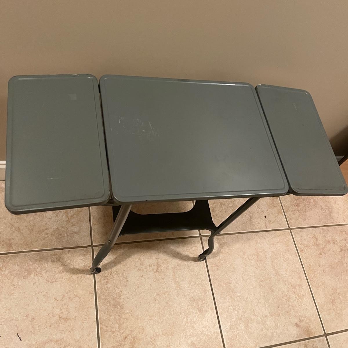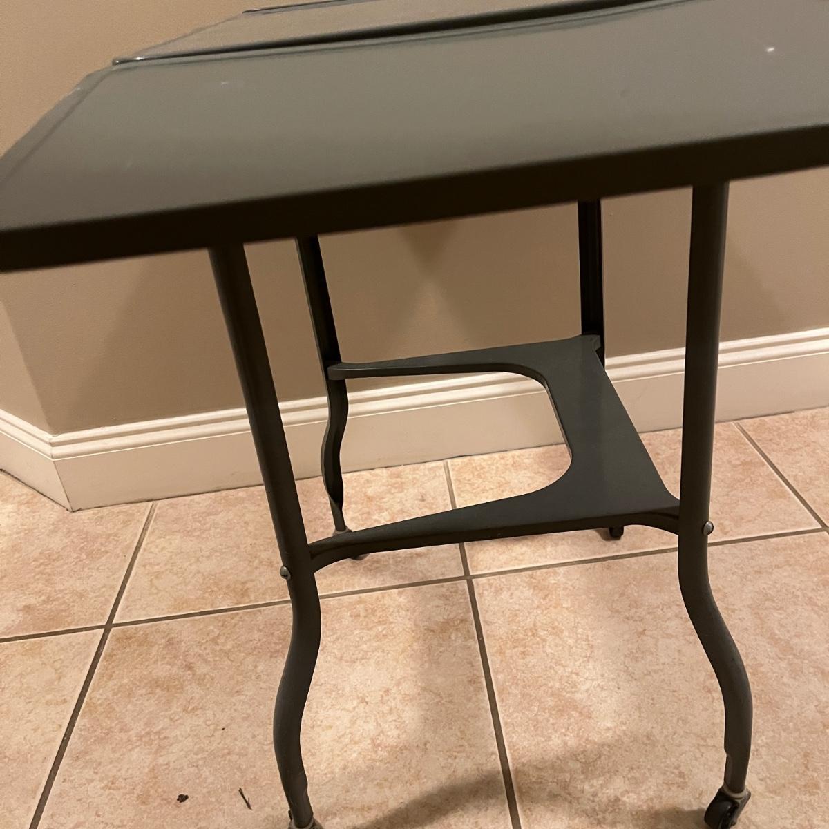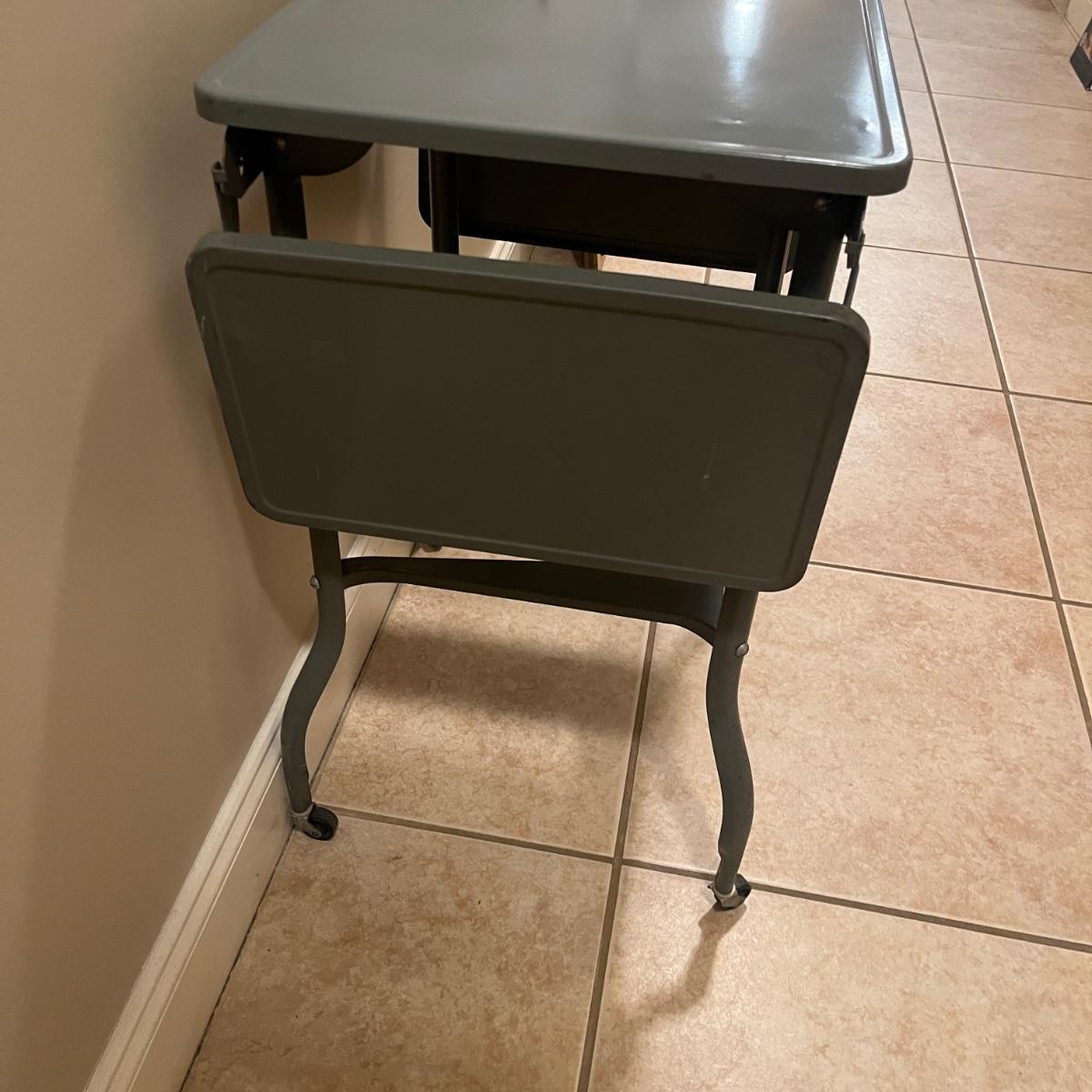Lot includes a metal typewriter stand on wheels with drop sides. Table measures 35” x 14” x 26”H when sides are up and 20.5” x 14” x 26”H when sides are down.