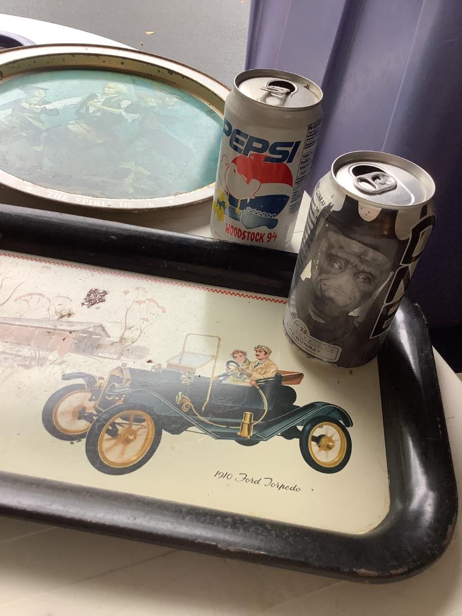 Metal- Uncle Ben's tin, 6 metal trays, Pepsi cans Star Wars Nute Gunroy Woodstock-19 pieces