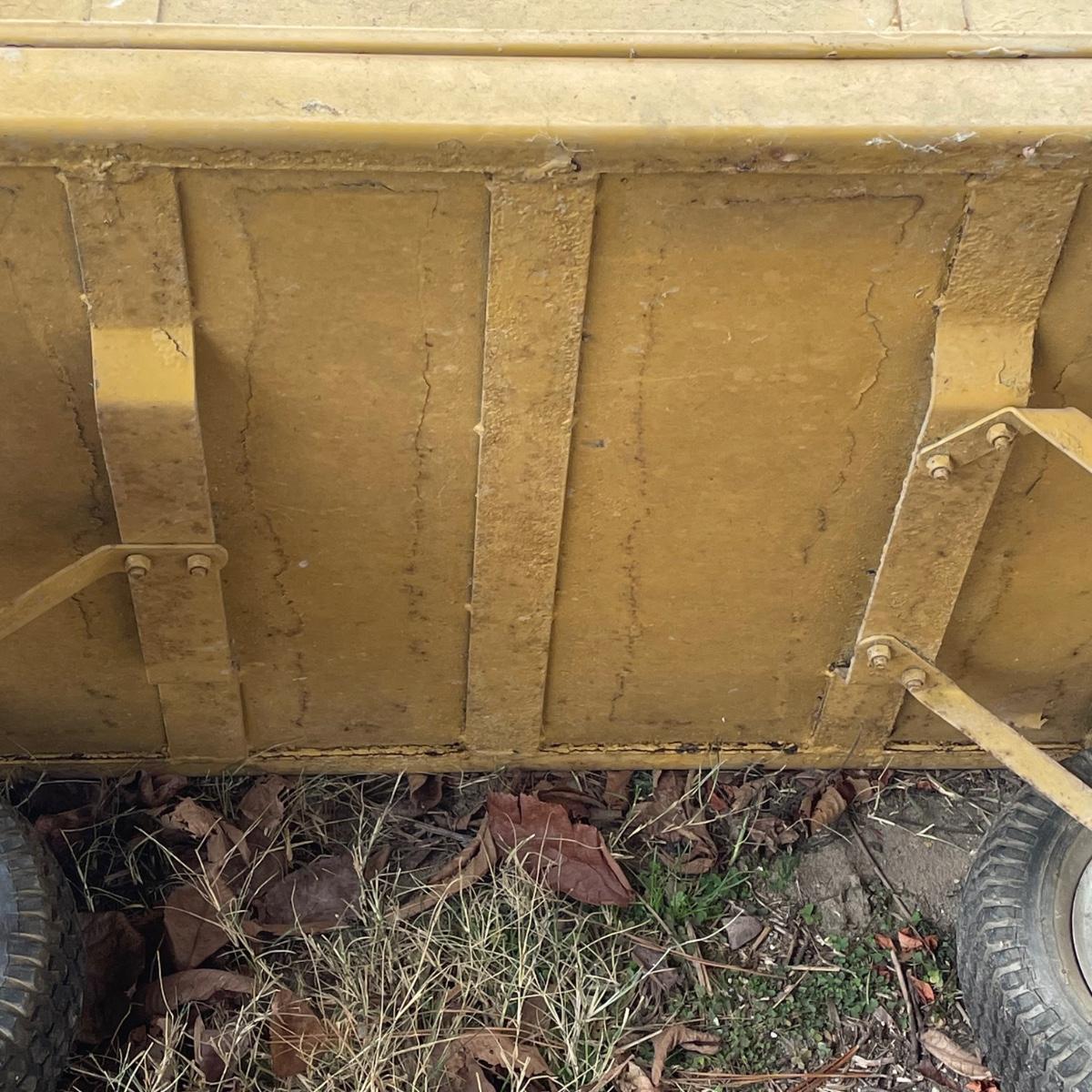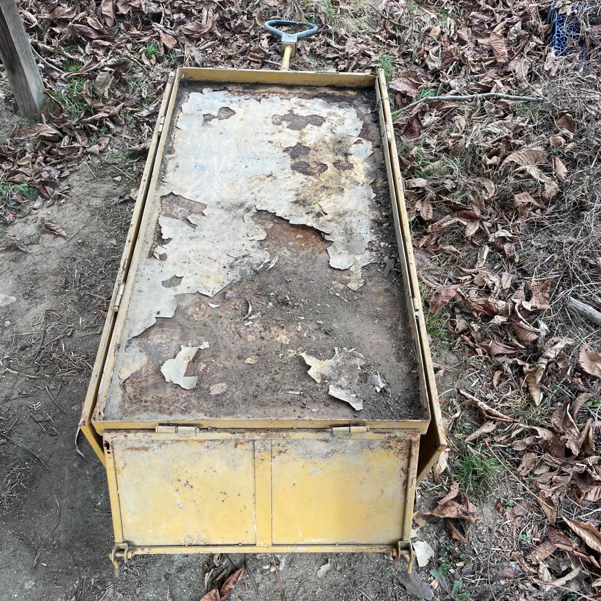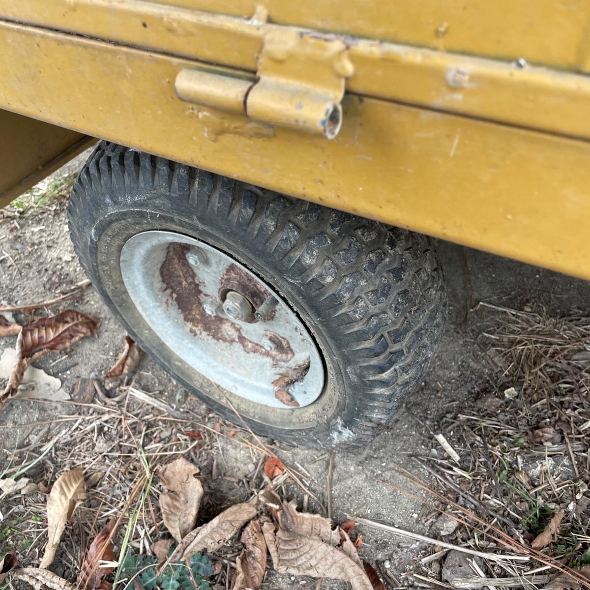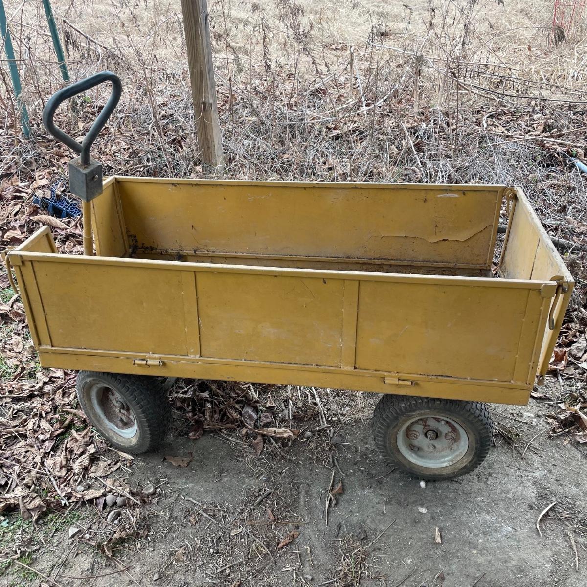 This lightweight metal wagon’s front wheels swivel and all sides collapse down for a flat bed trailer. Most of the rust is surface rust where the paint has peeled, with just a few deeper areas of rust. At least one tire needs replacing.