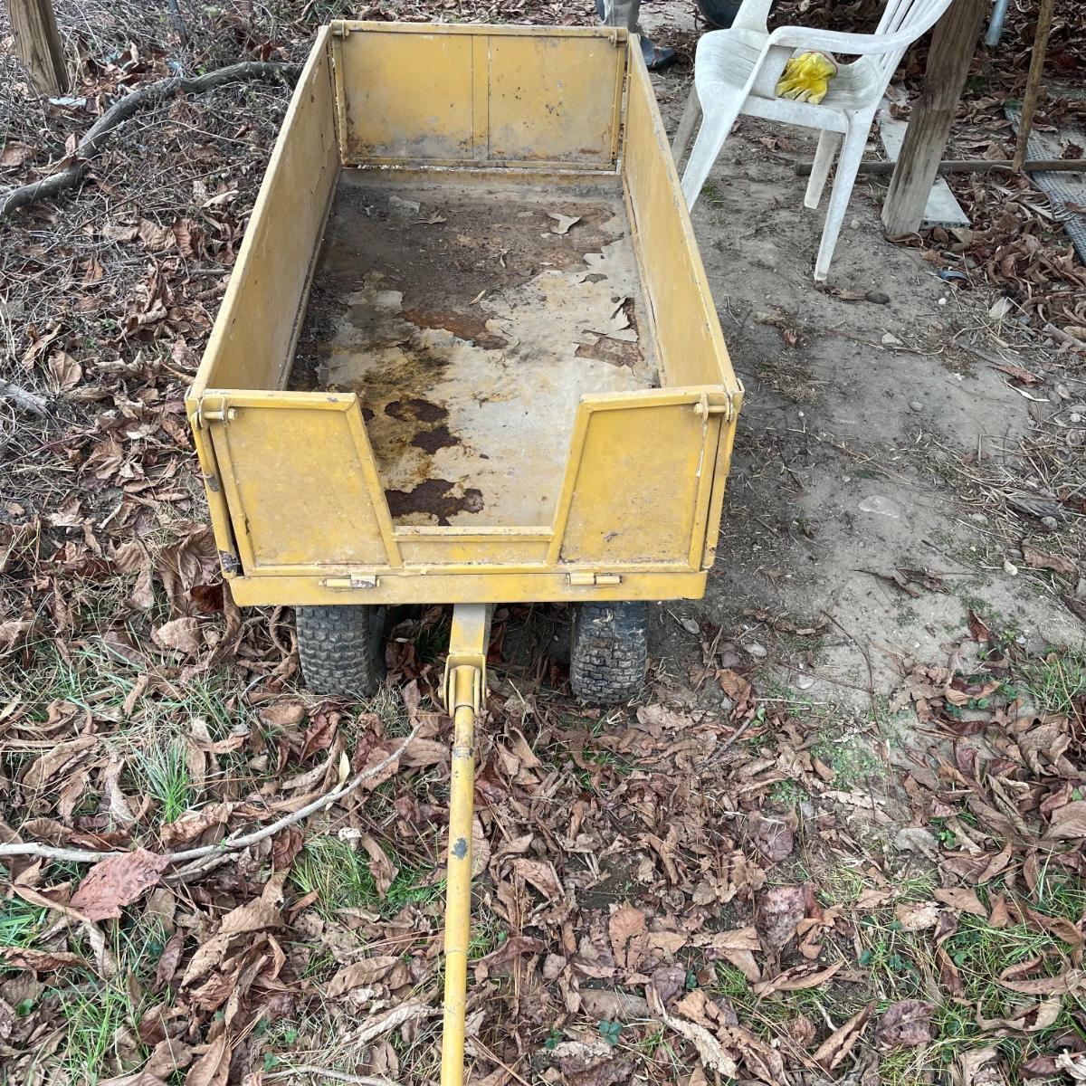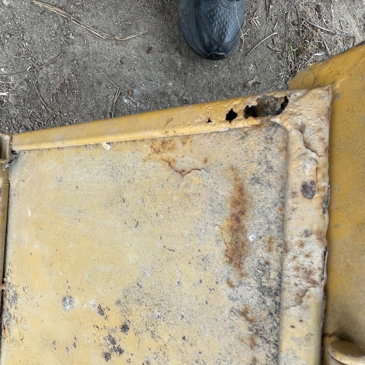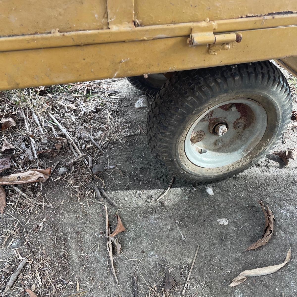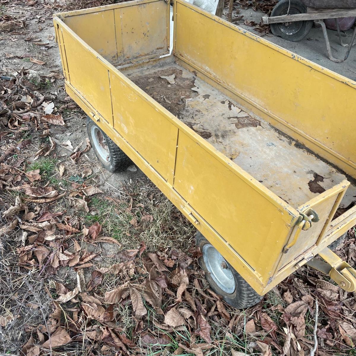 This lightweight metal wagon’s front wheels swivel and all sides collapse down for a flat bed trailer. Most of the rust is surface rust where the paint has peeled, with just a few deeper areas of rust. At least one tire needs replacing.