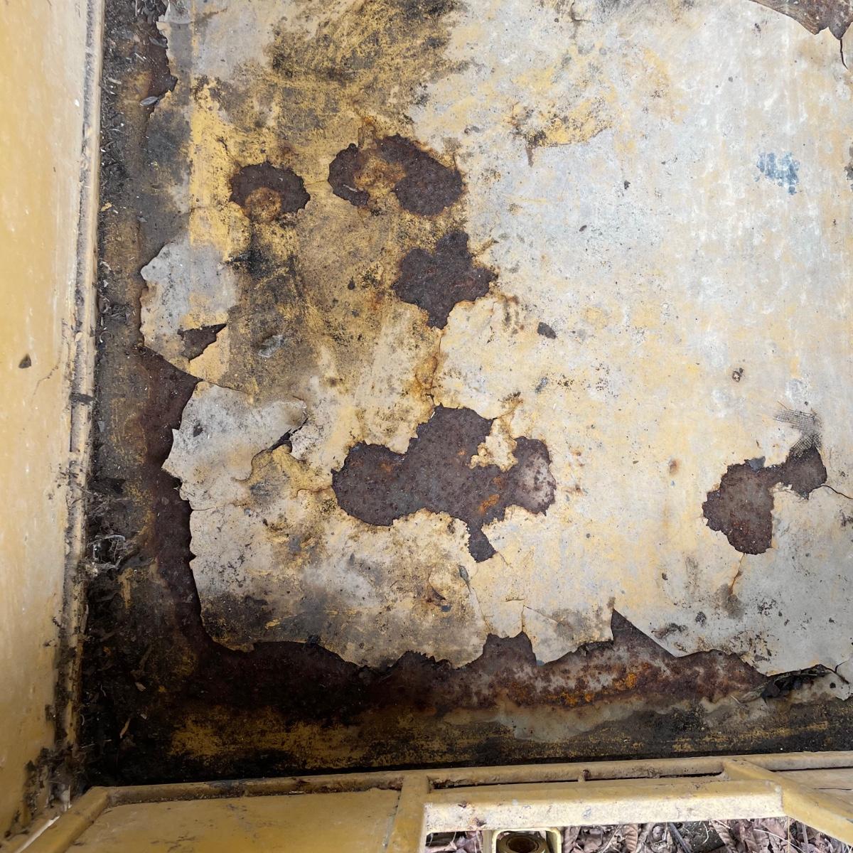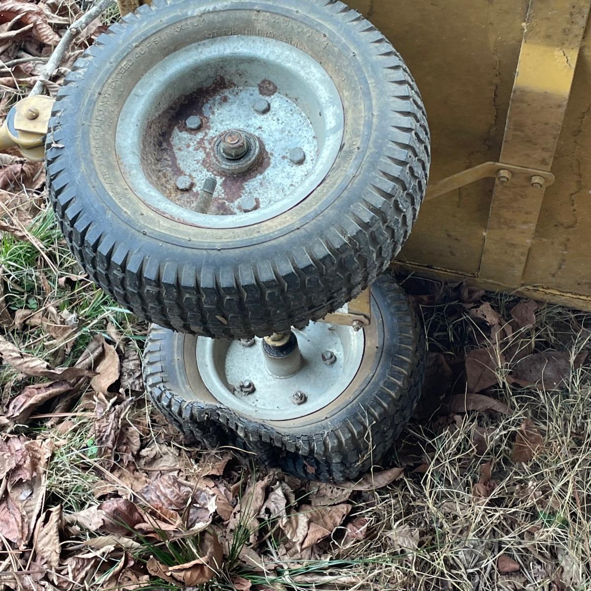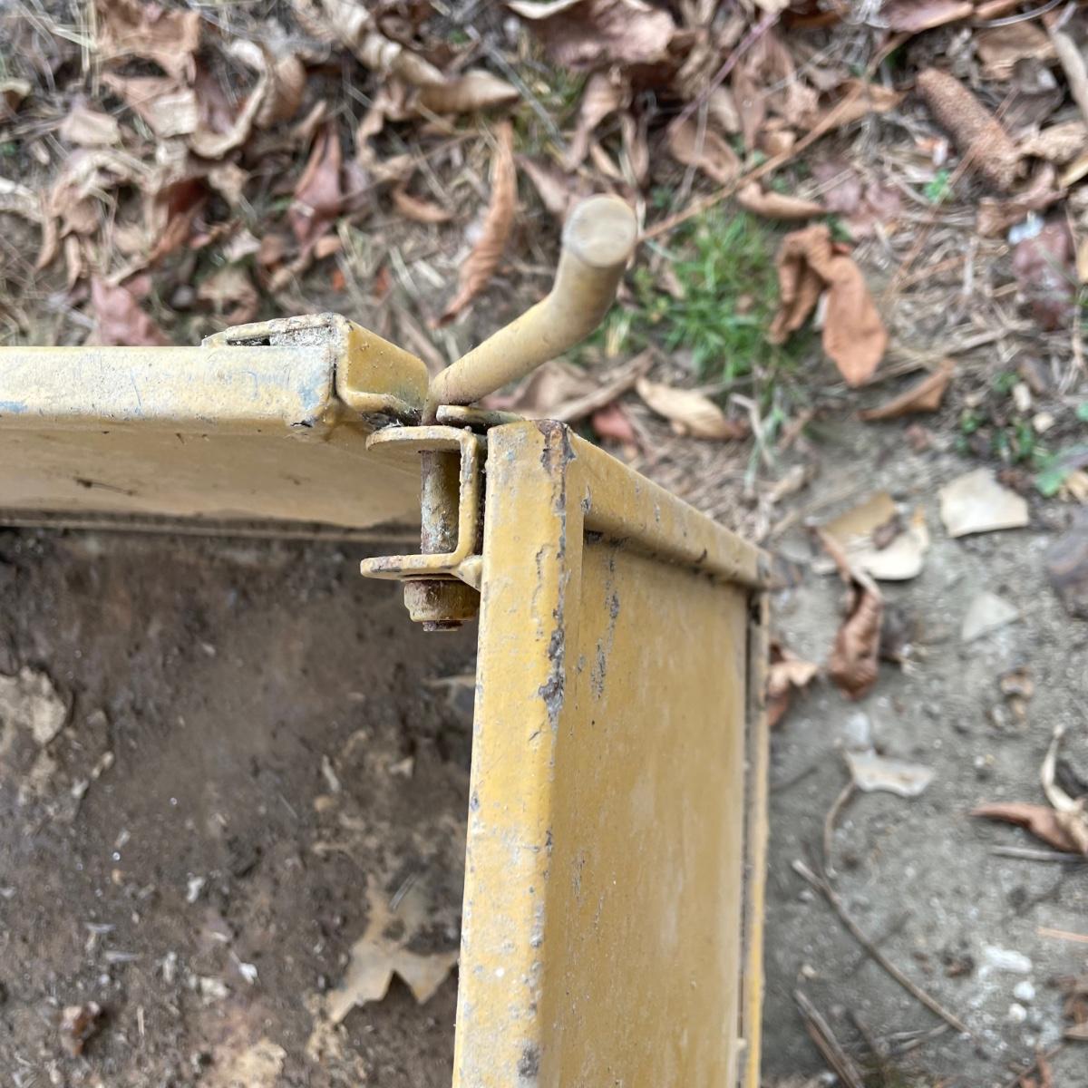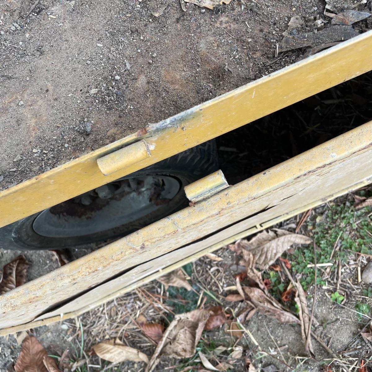 This lightweight metal wagon’s front wheels swivel and all sides collapse down for a flat bed trailer. Most of the rust is surface rust where the paint has peeled, with just a few deeper areas of rust. At least one tire needs replacing.