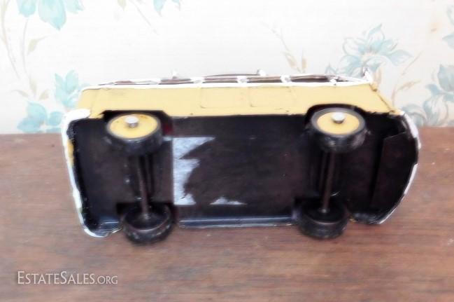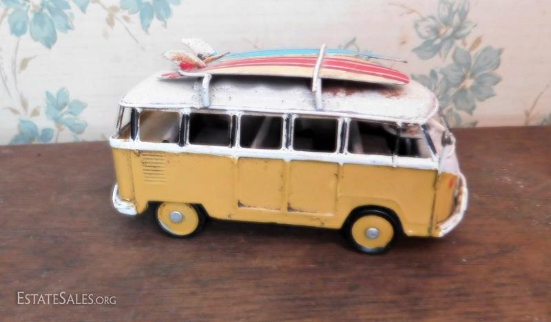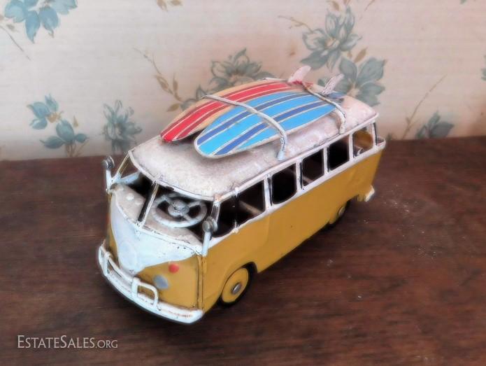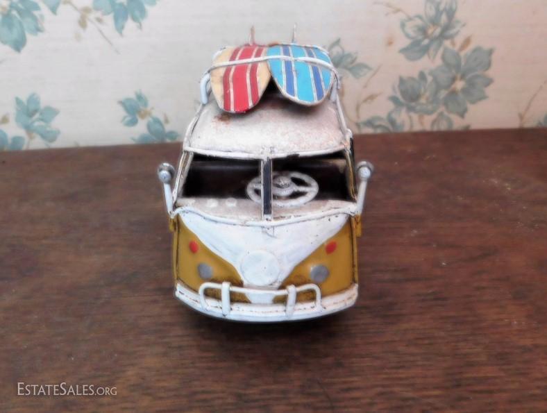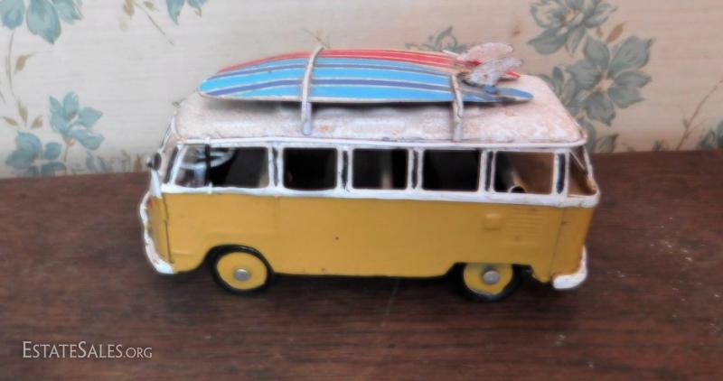 All metal Volkswagon Bug Van with surf boards. We have researched and believe this is the German made version but cannot confirm. No markings on the underside. Great condition and all pieces seem to be attached and unbroken. Needs some cleaning. Unique and rare piece.