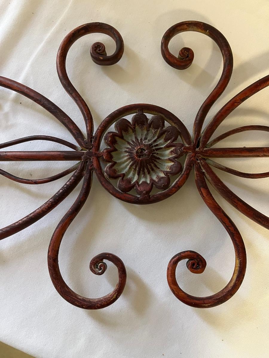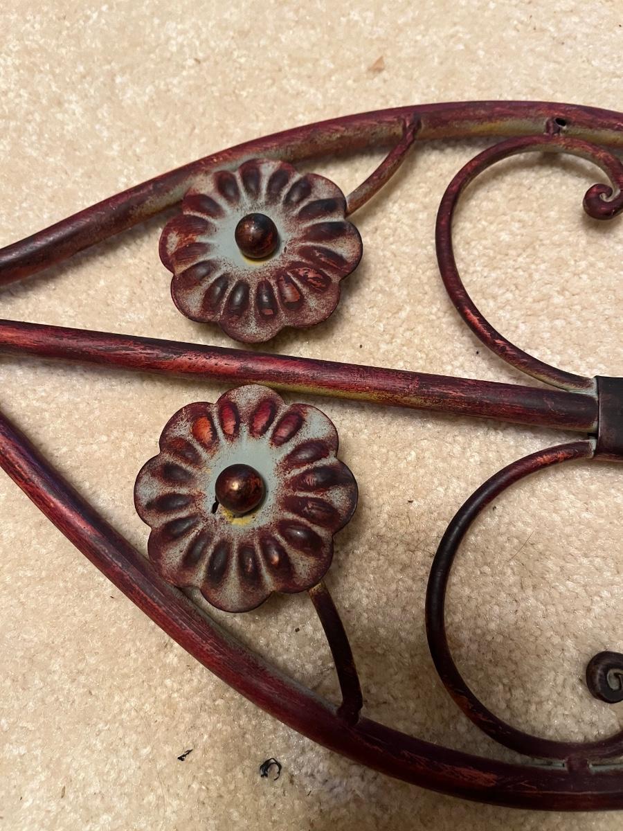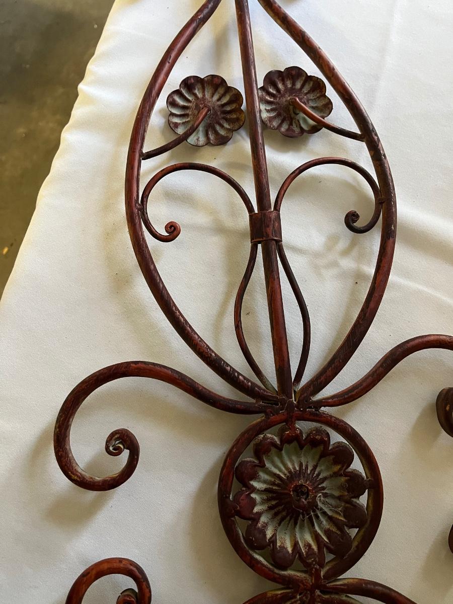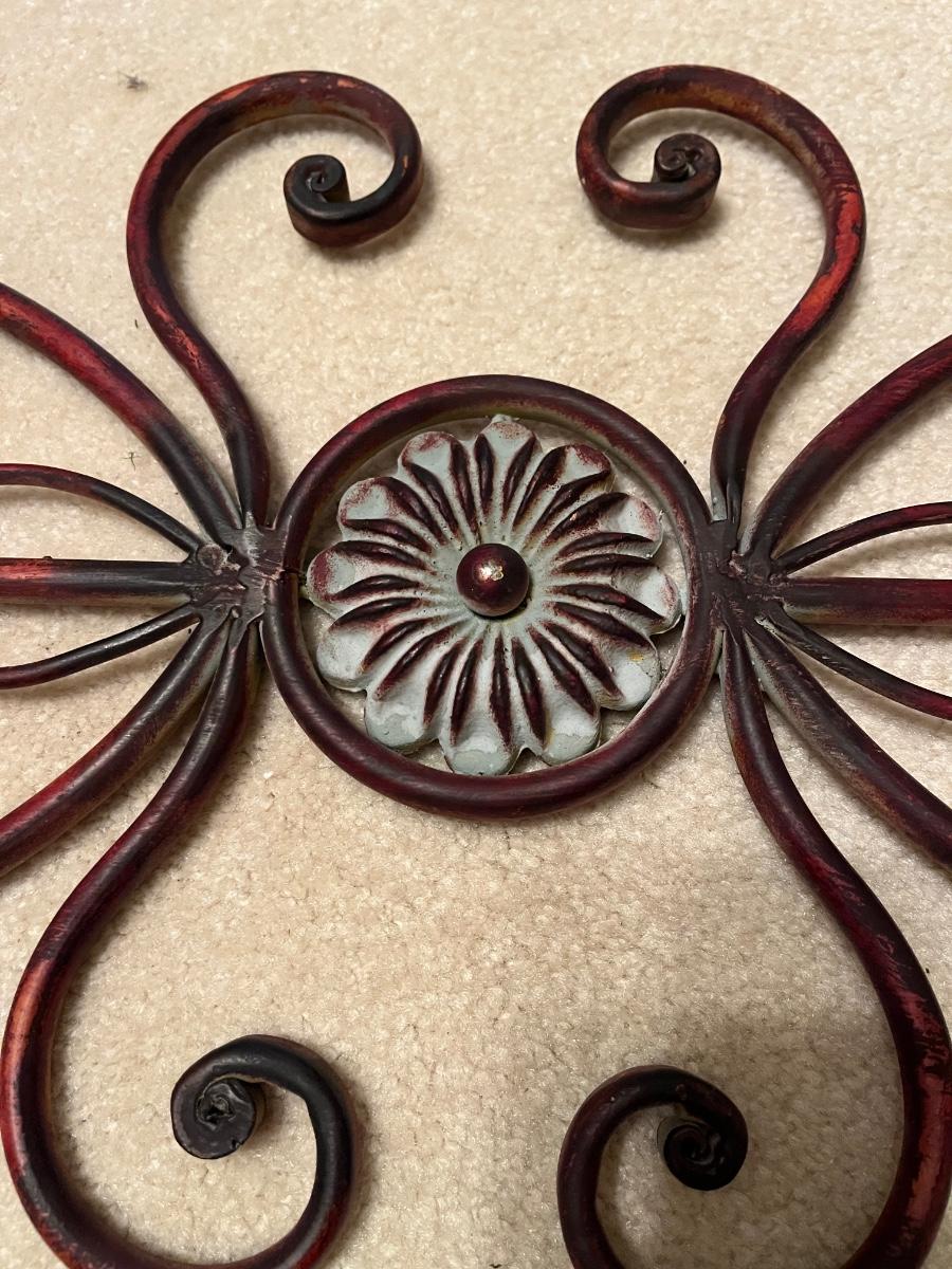 Three pieces of metal artwork. A colorful sunburst mirror measuring 29” x 40”. A red iron scroll work with fleur-de-lis detail and a metal maple leaf wall sculpture.