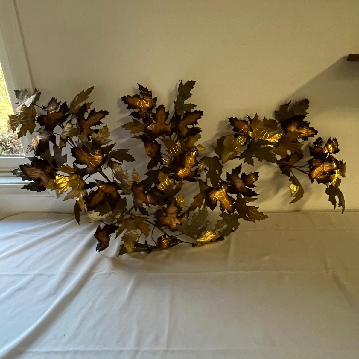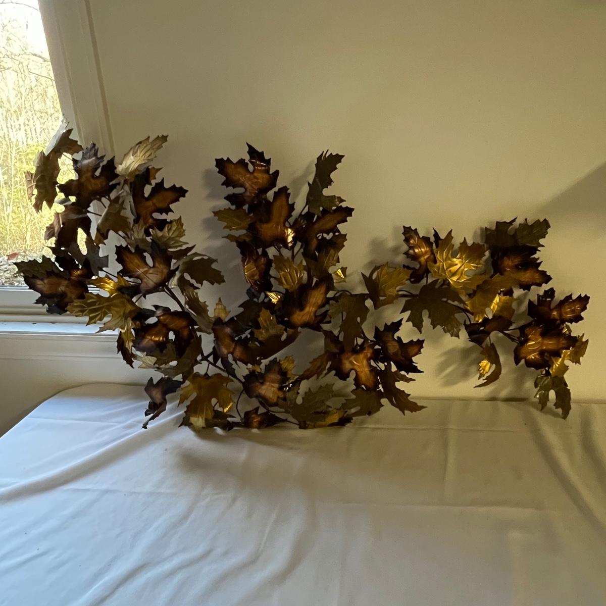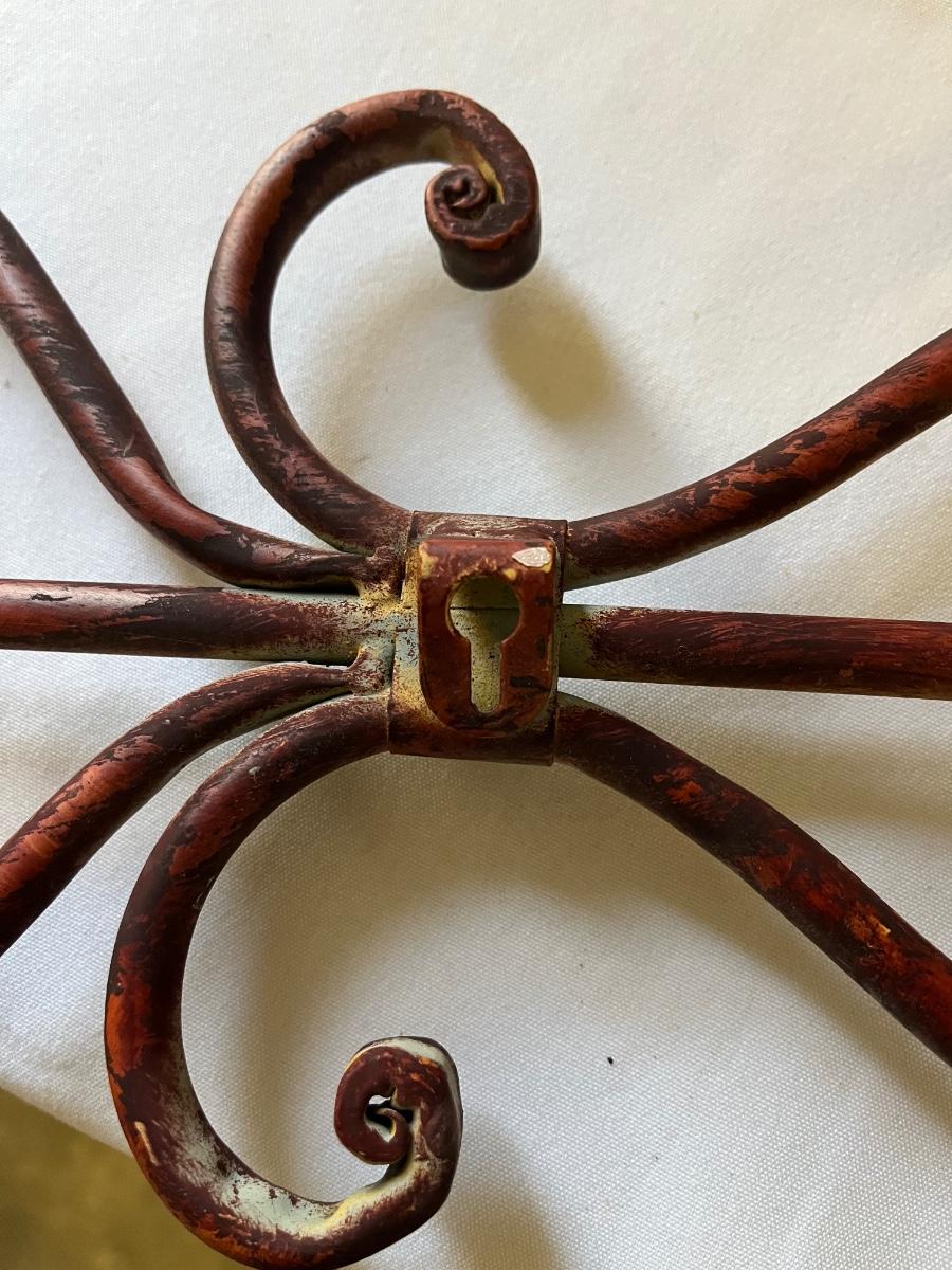 Three pieces of metal artwork. A colorful sunburst mirror measuring 29” x 40”. A red iron scroll work with fleur-de-lis detail and a metal maple leaf wall sculpture.
