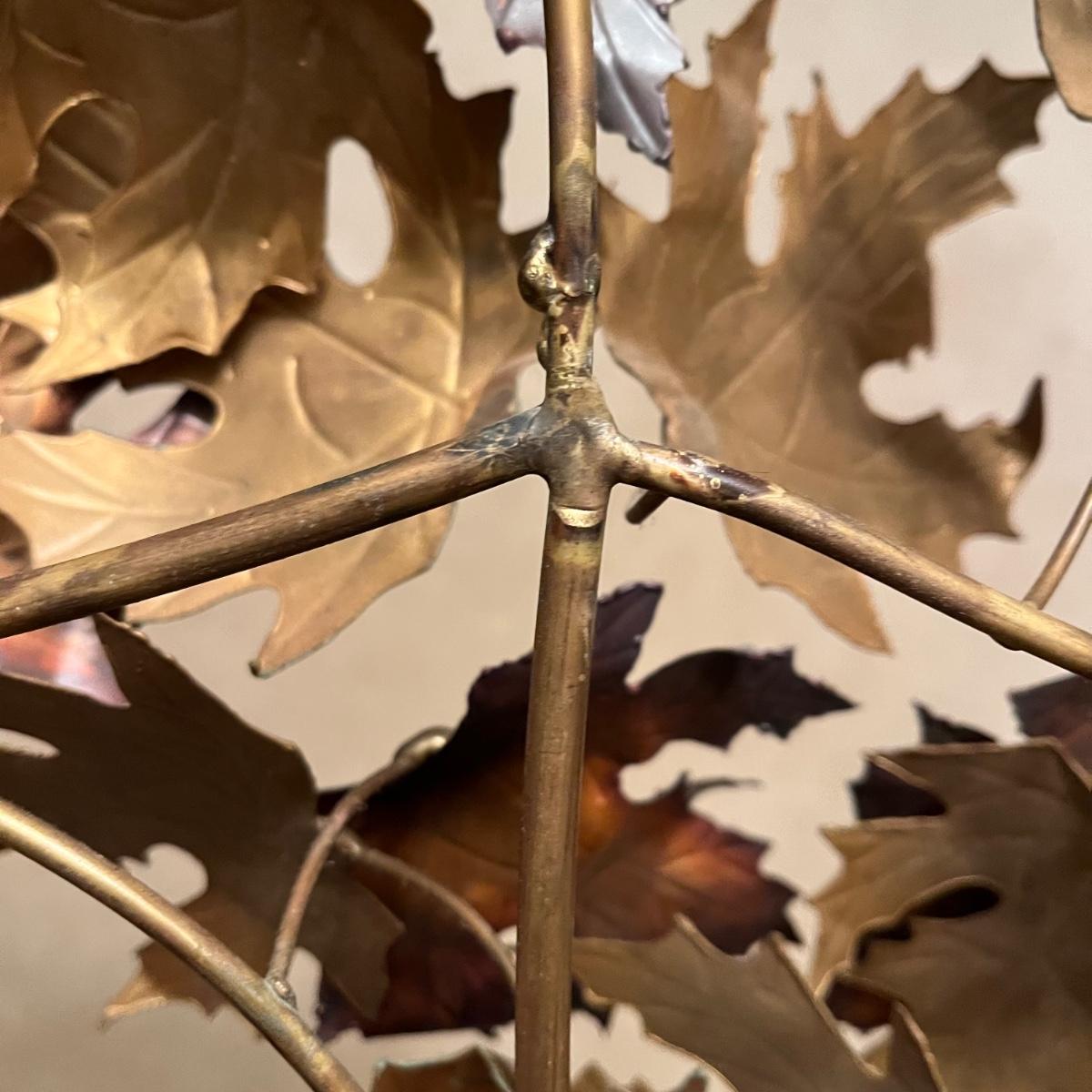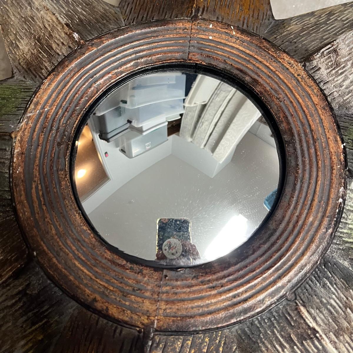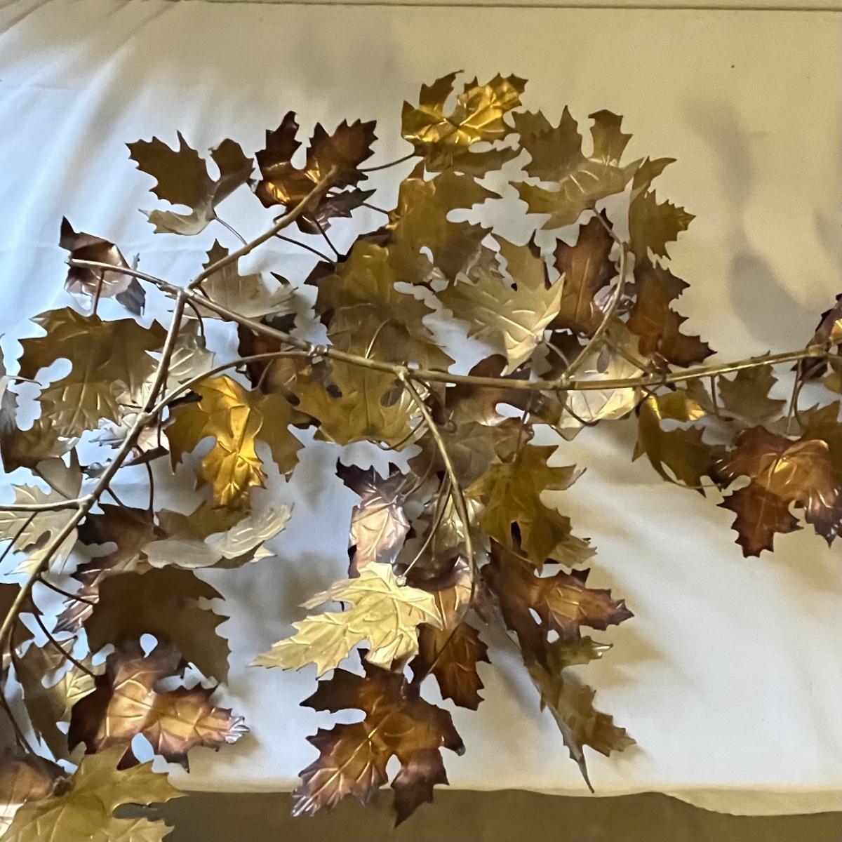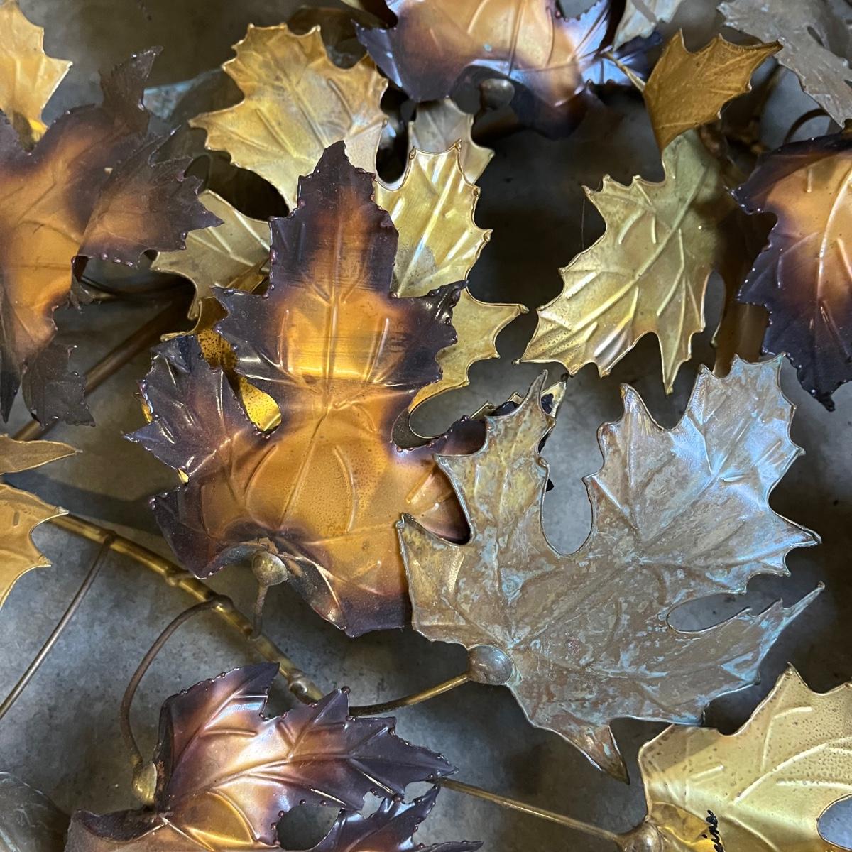 Three pieces of metal artwork. A colorful sunburst mirror measuring 29” x 40”. A red iron scroll work with fleur-de-lis detail and a metal maple leaf wall sculpture.