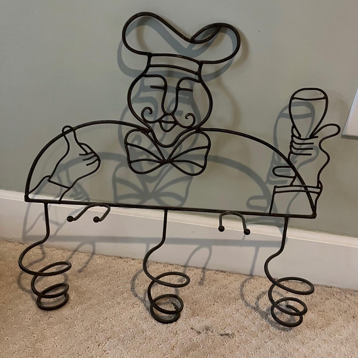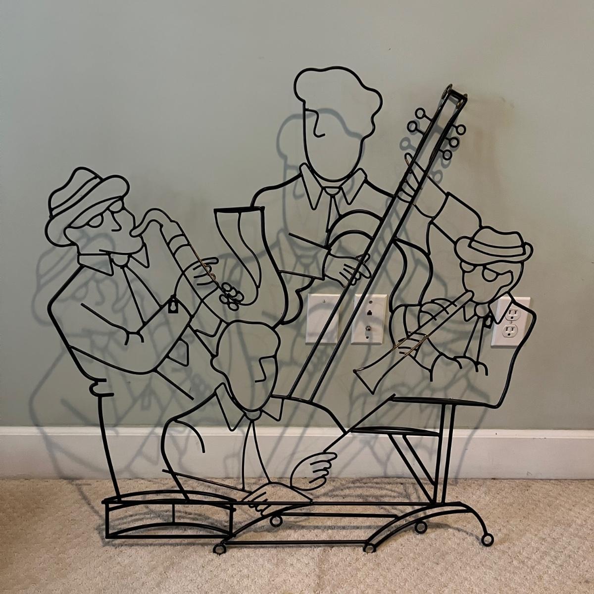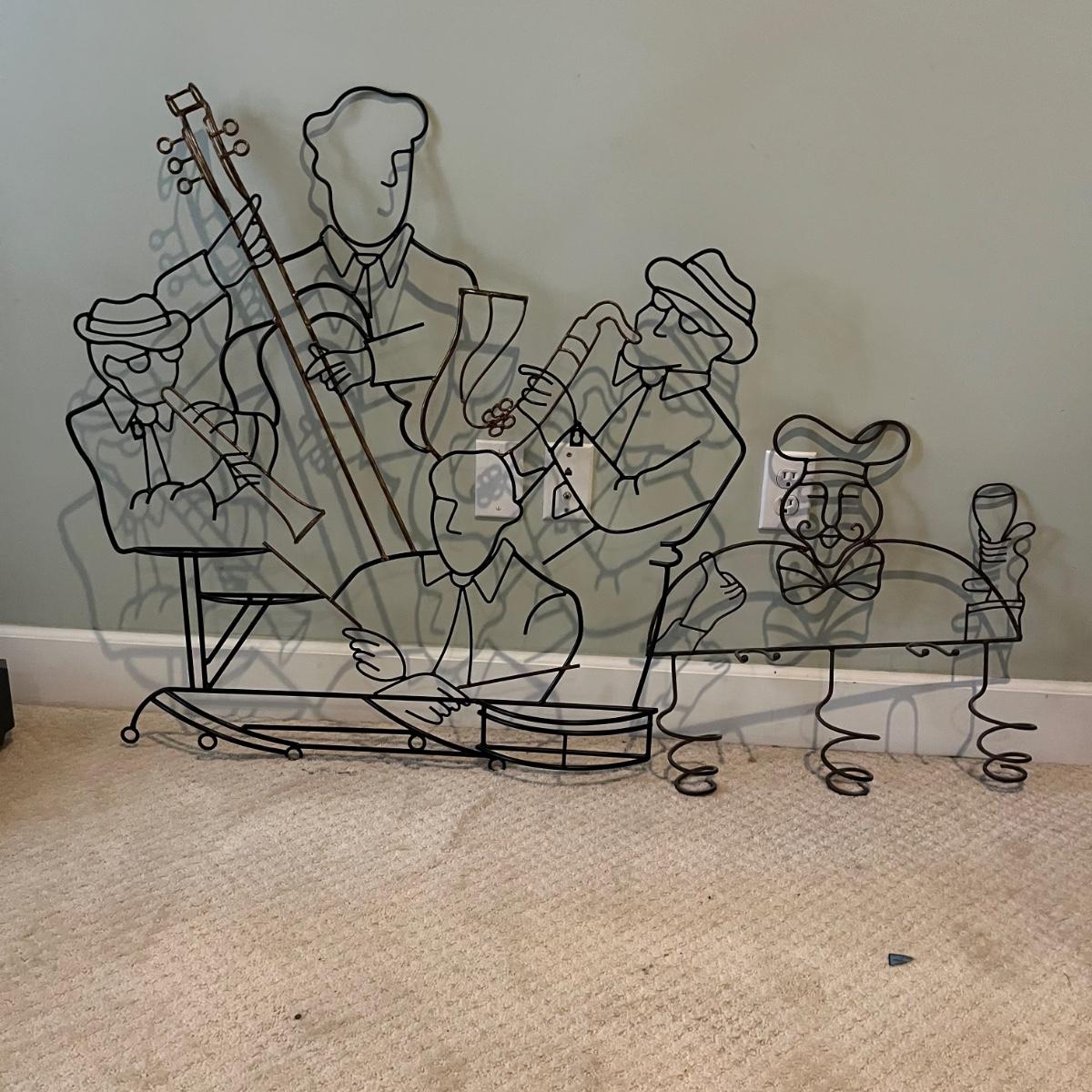 Lot includes a metal piece of wall art with a musical motif and a wall mounted metal wine glass and bottle holder. Musical wall art measures 34” x 36” x 3”.