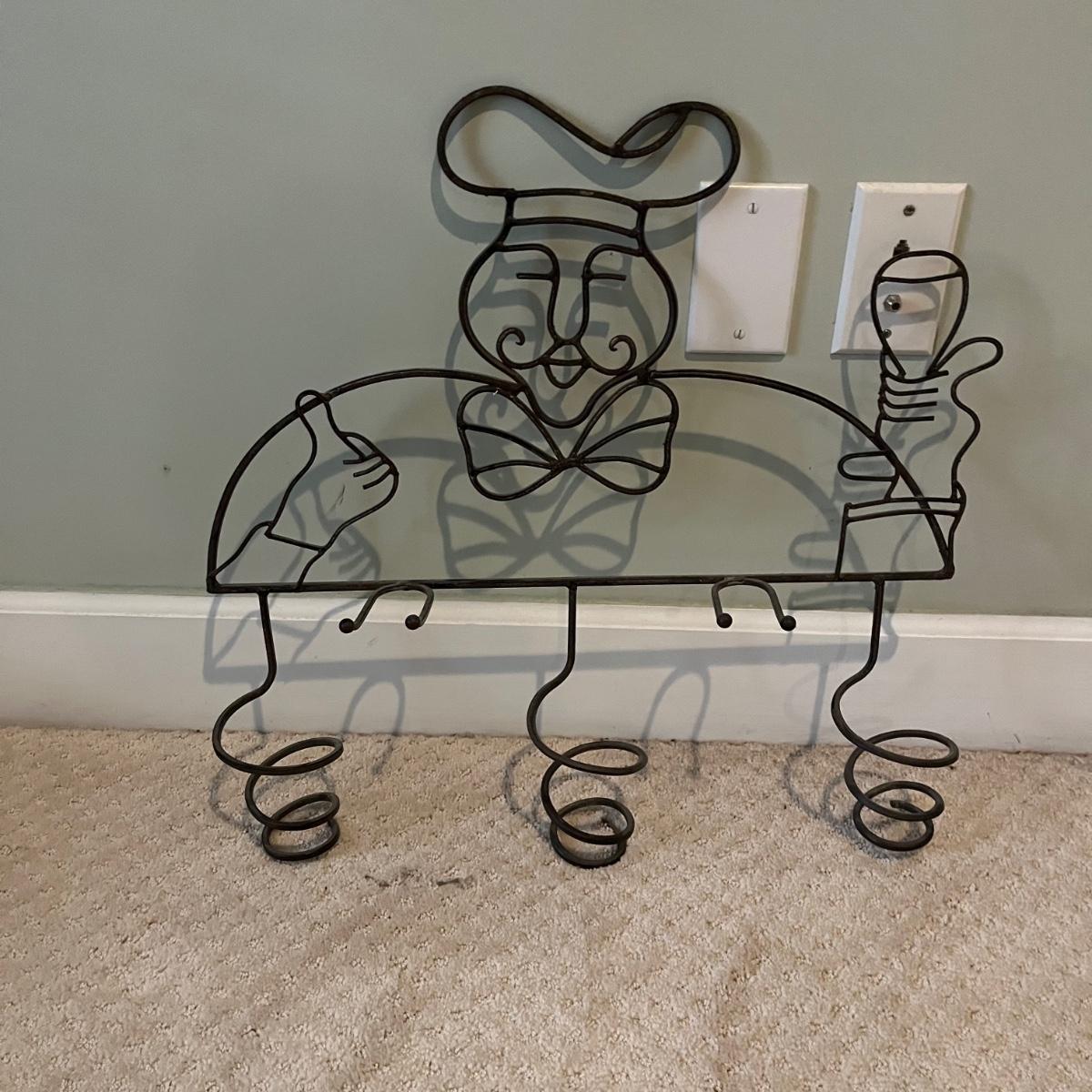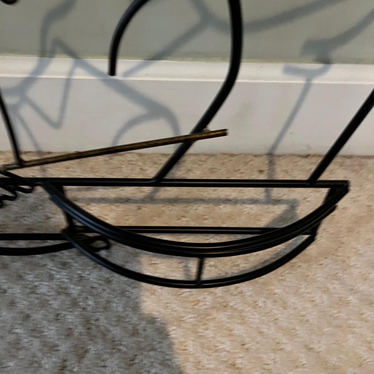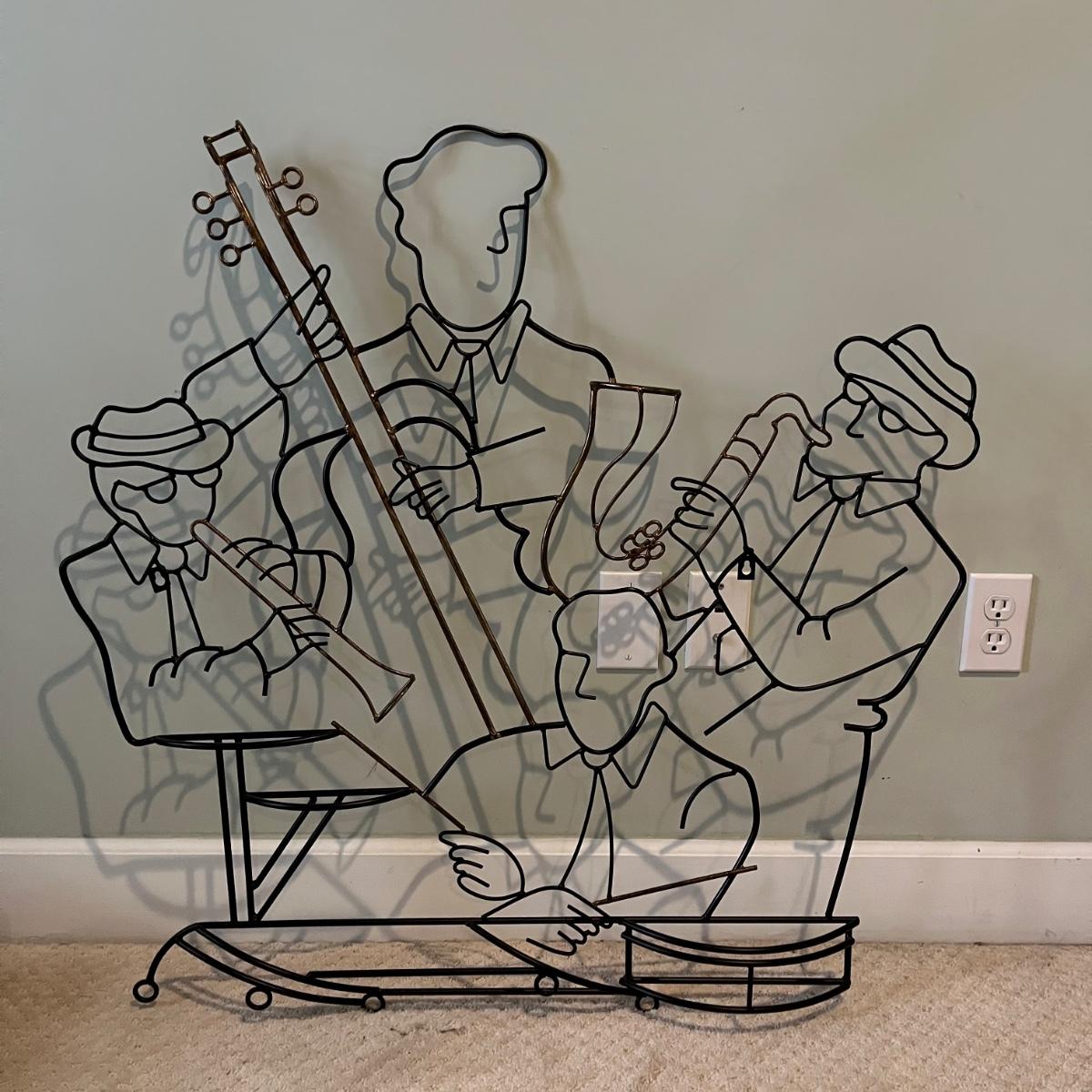 Lot includes a metal piece of wall art with a musical motif and a wall mounted metal wine glass and bottle holder. Musical wall art measures 34” x 36” x 3”.