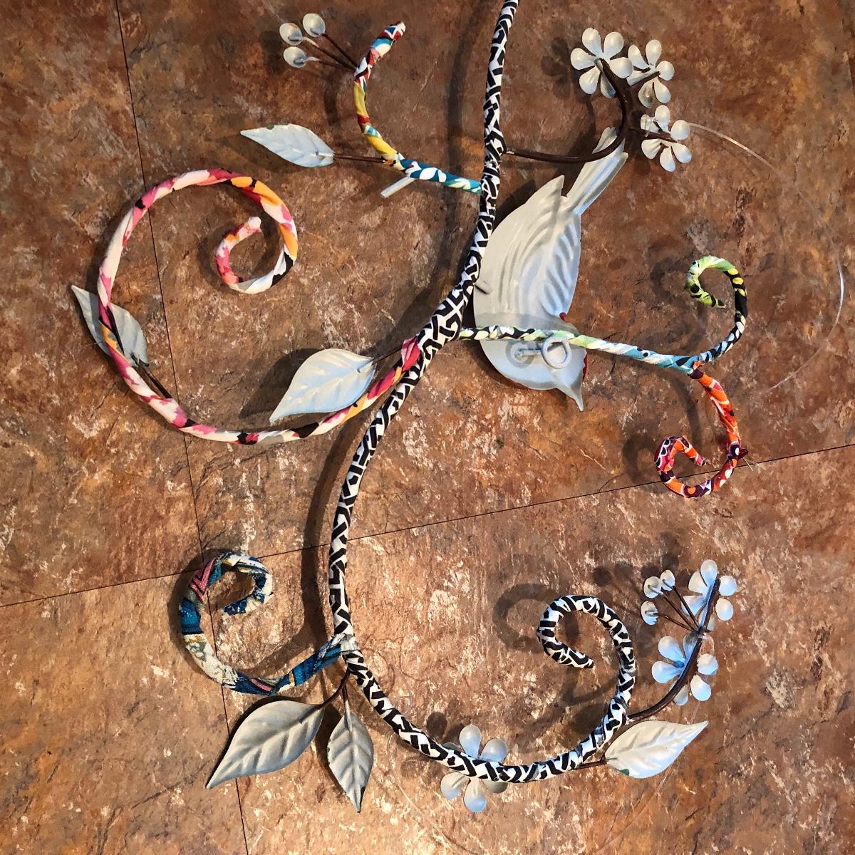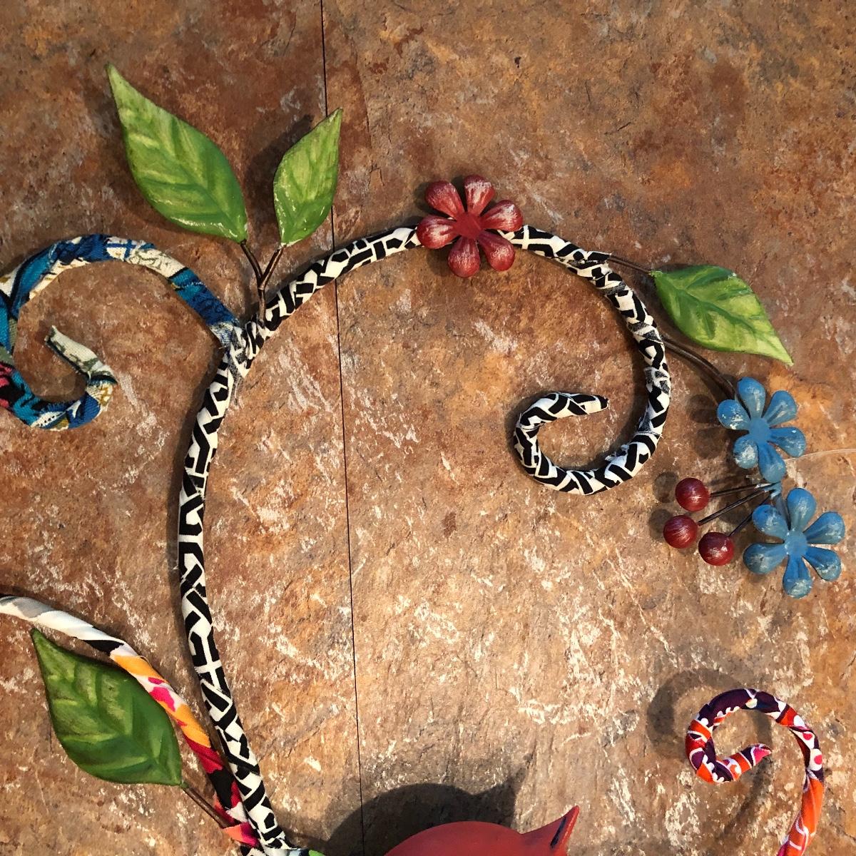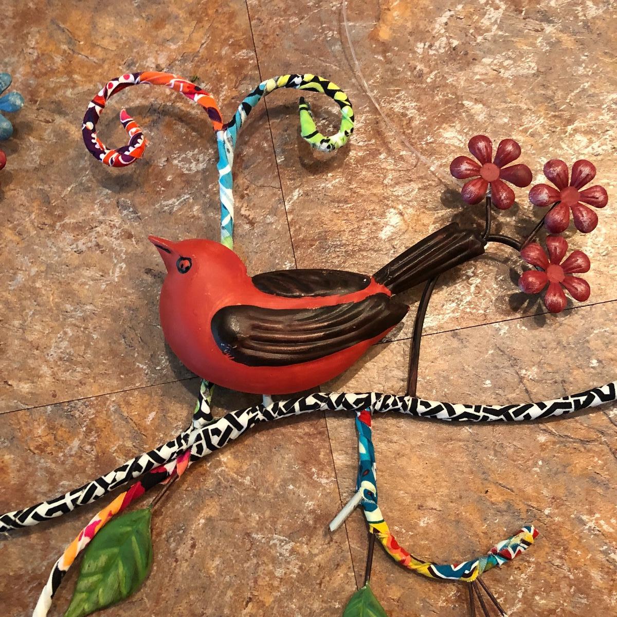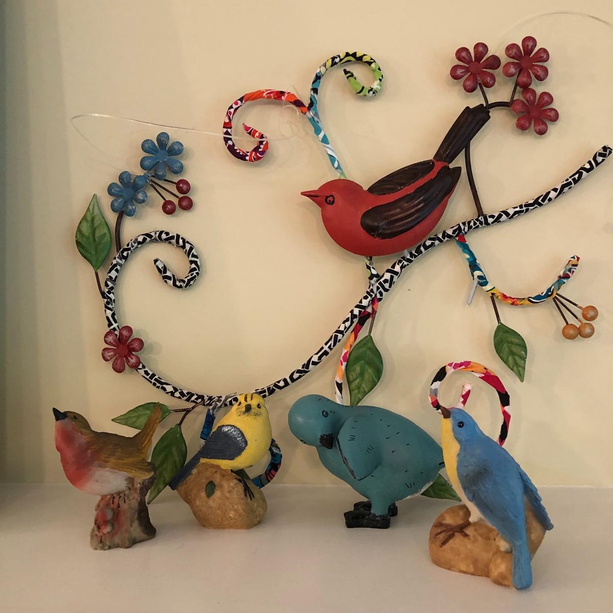 The bird wall Art is comprised of metal and measures approximately 18” x 14”. The four other birds are made of a resin material and are just over 3.5” tall. Shipping Available.