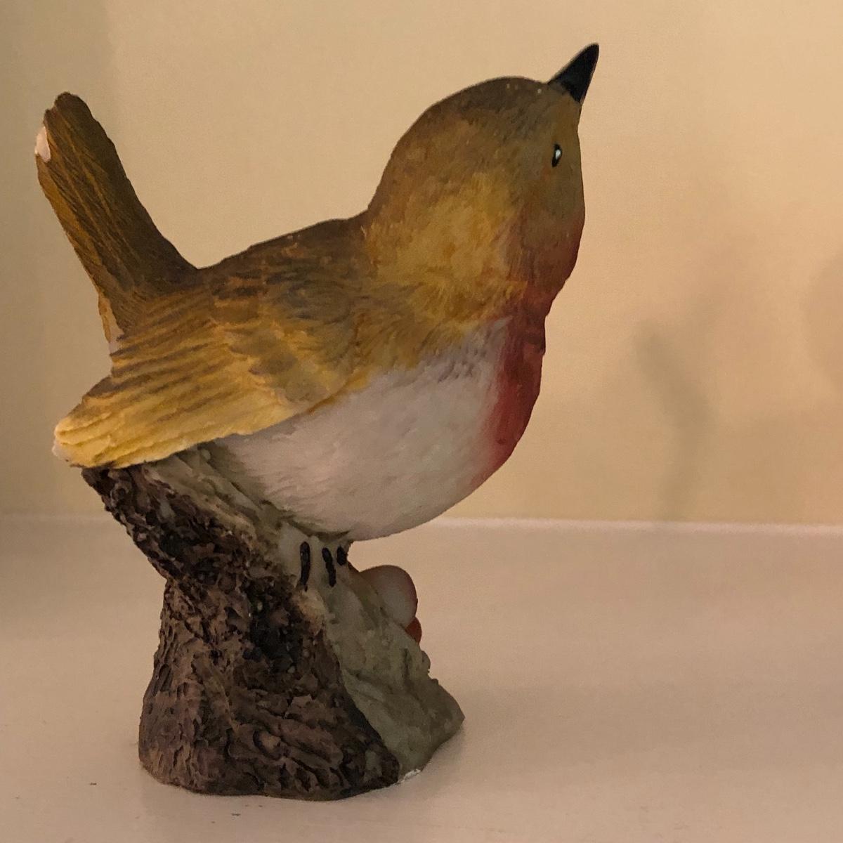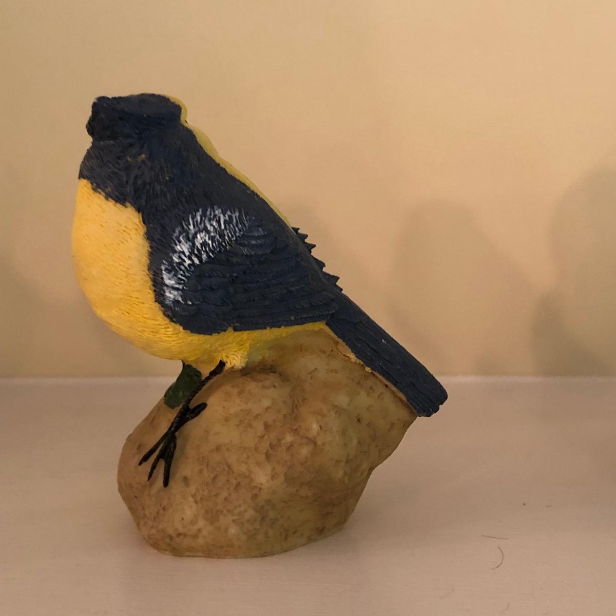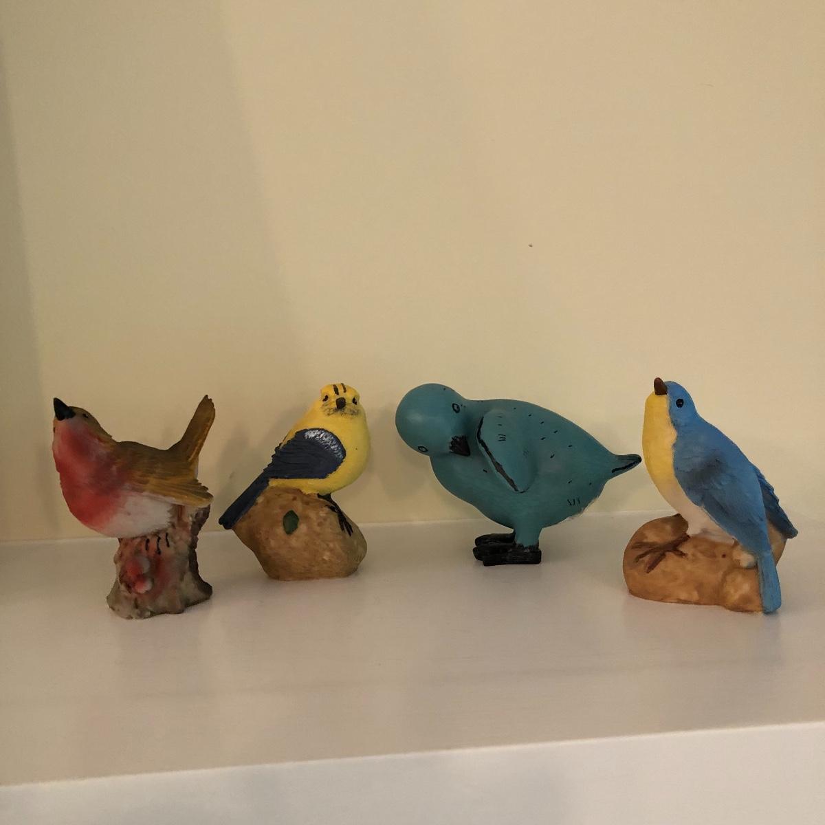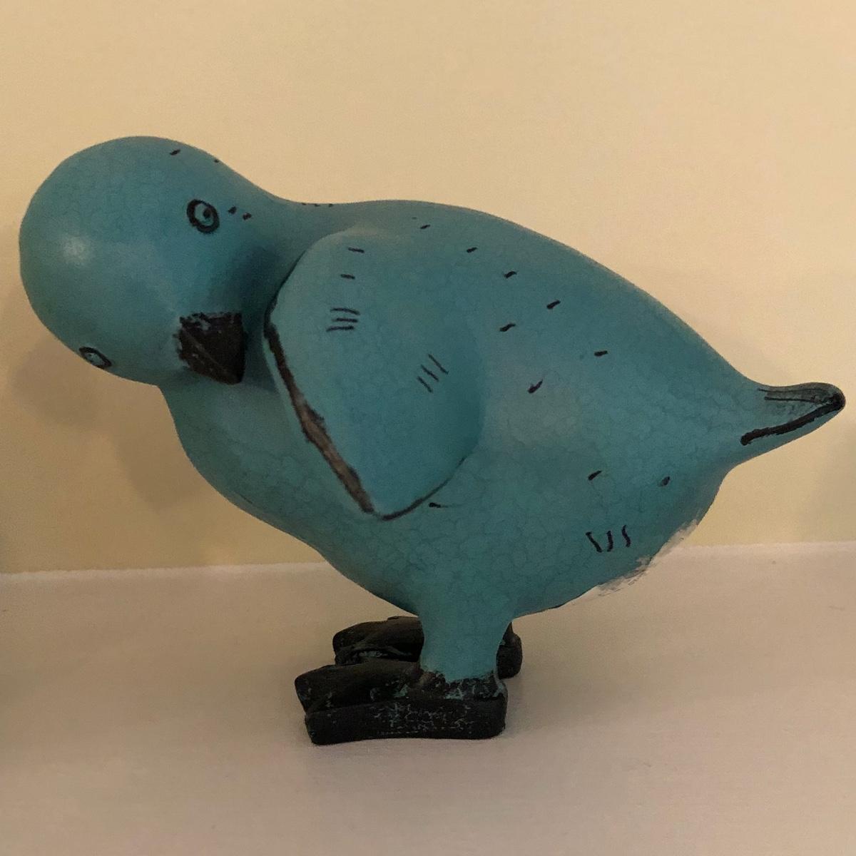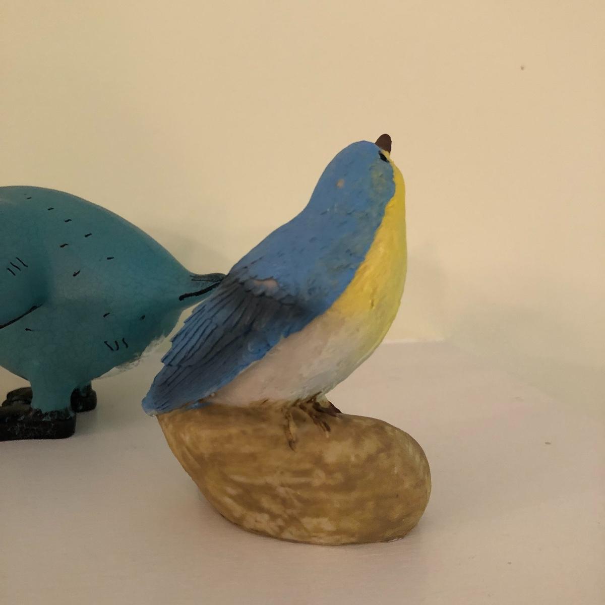 The bird wall Art is comprised of metal and measures approximately 18” x 14”. The four other birds are made of a resin material and are just over 3.5” tall. Shipping Available.