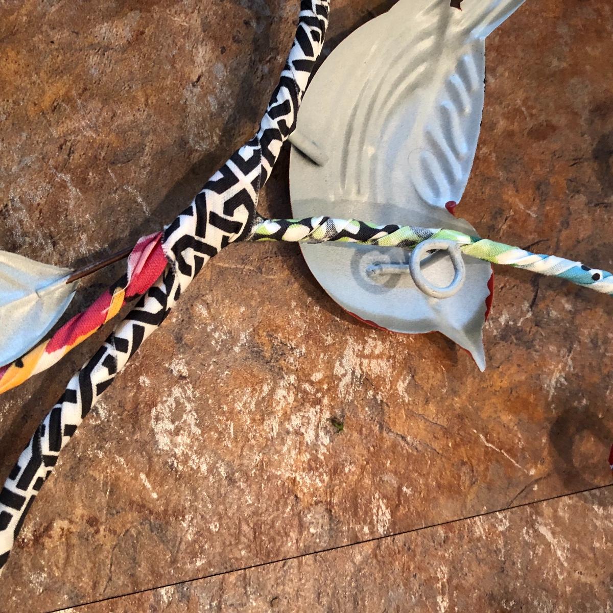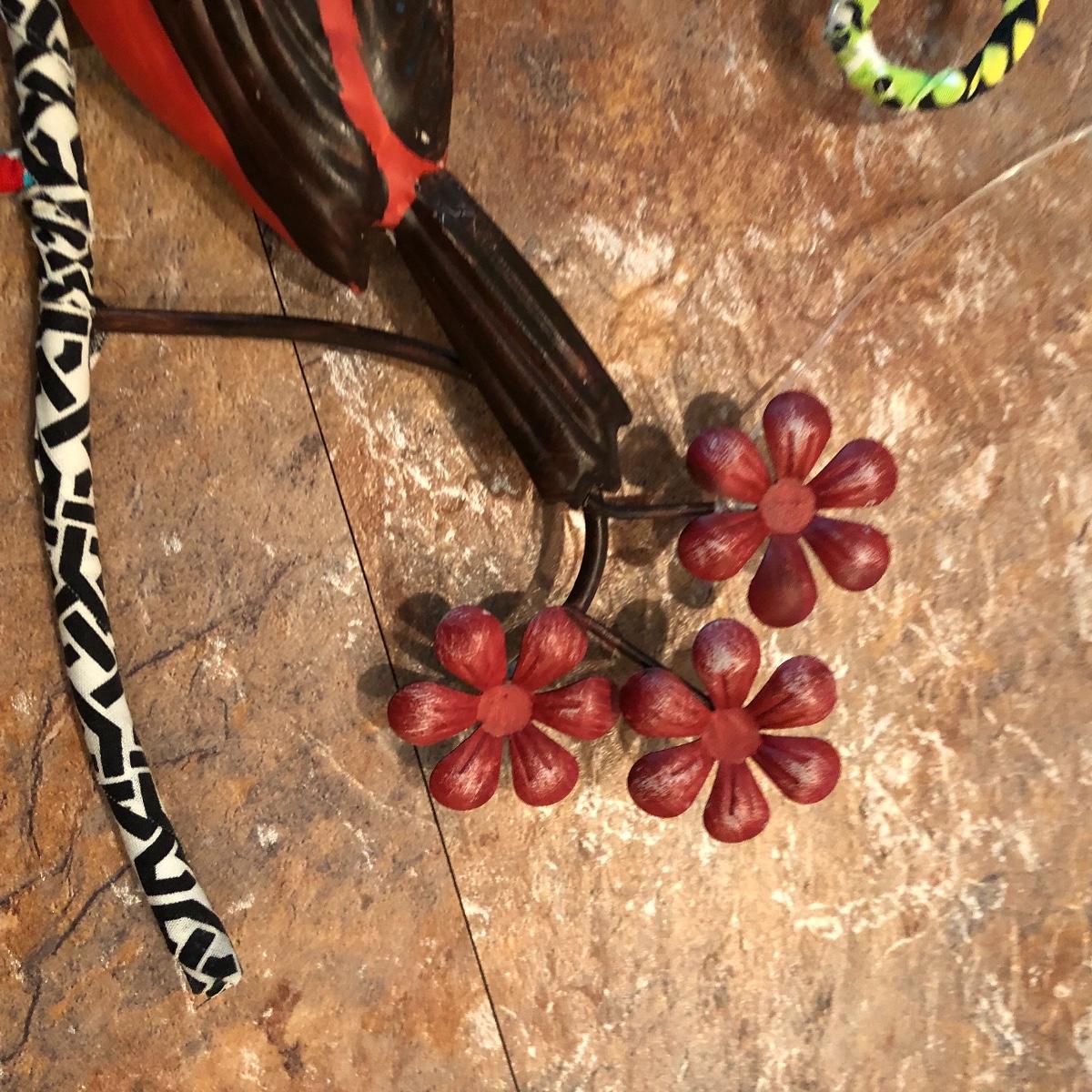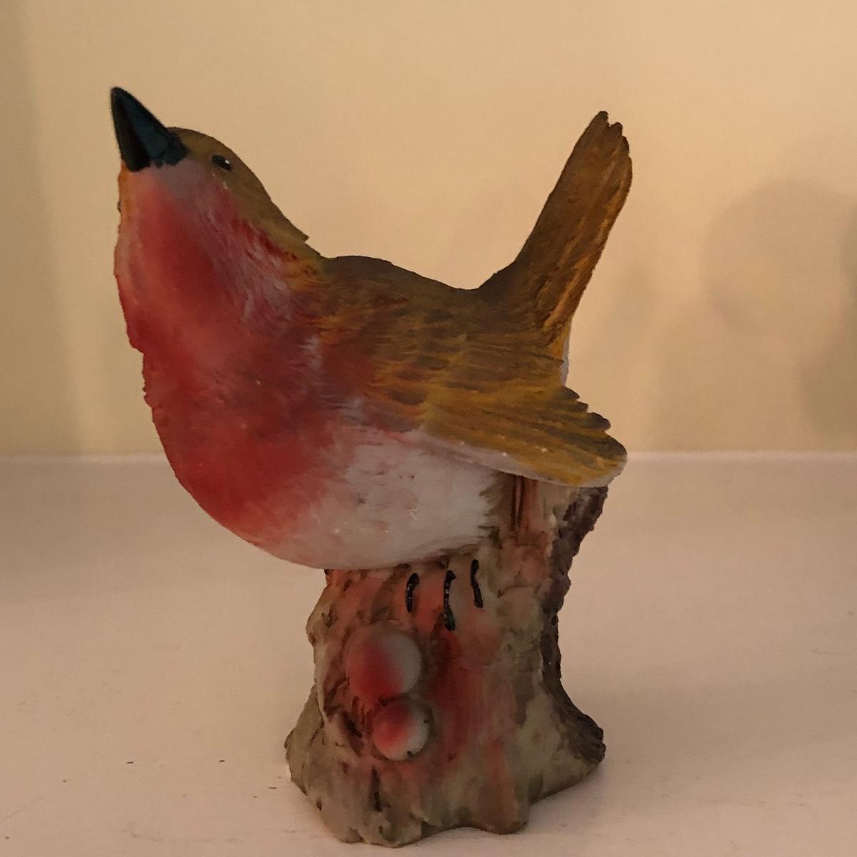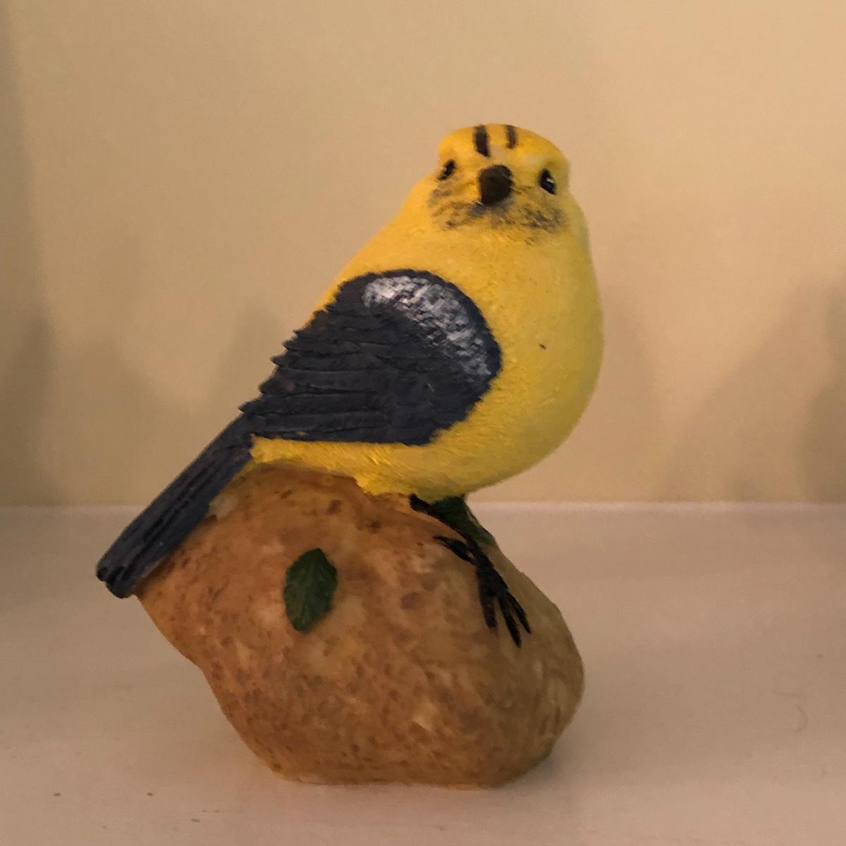 The bird wall Art is comprised of metal and measures approximately 18” x 14”. The four other birds are made of a resin material and are just over 3.5” tall. Shipping Available.