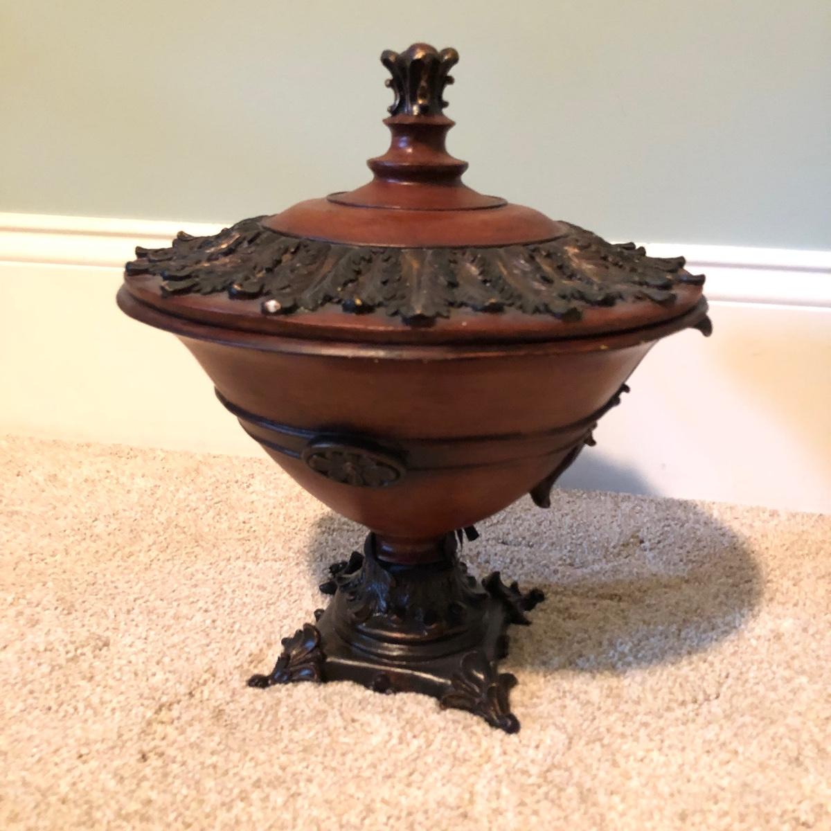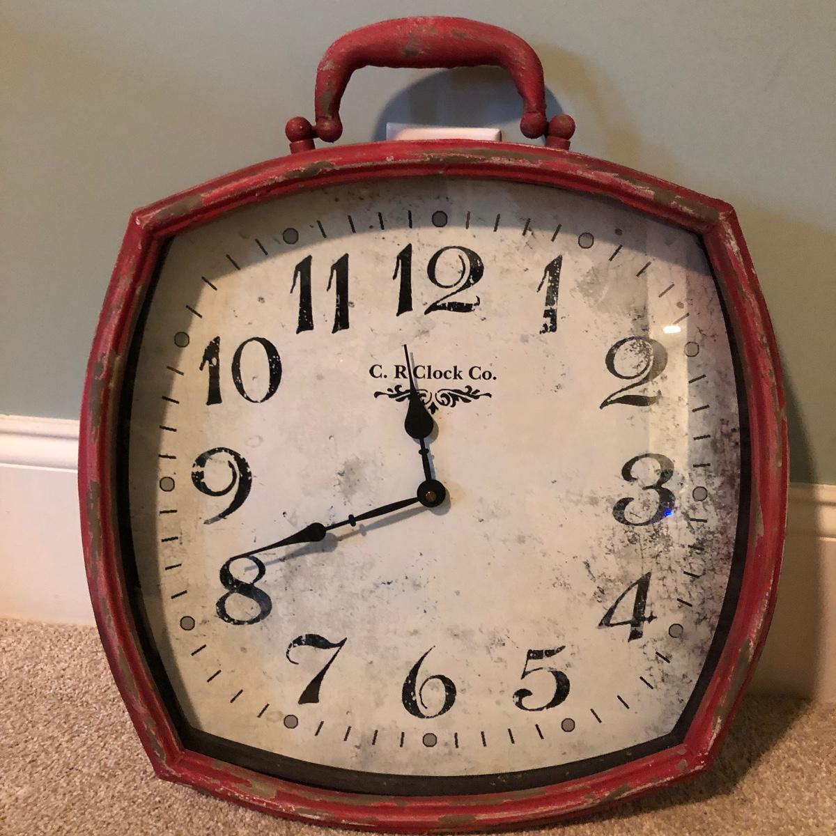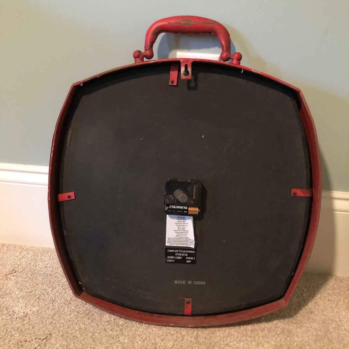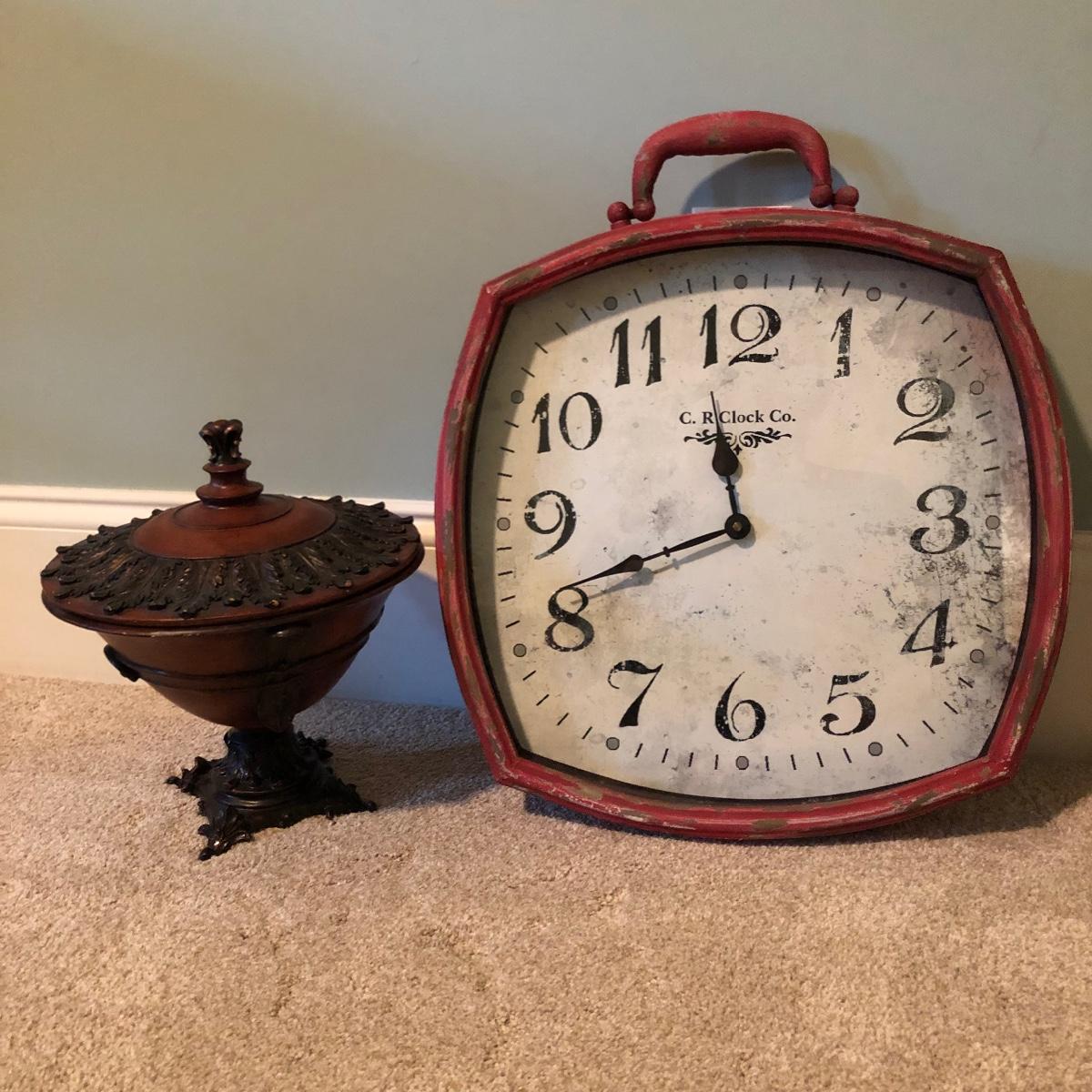 Lot includes one large decorative red metal wall clock by C.R. Clock Co. and a footed dish with lid. Dish is resin and clock is metal with a battery powered mechanism that was not tested as it appears battery is dead. Clock measures 16” x 16” x 2.5”.