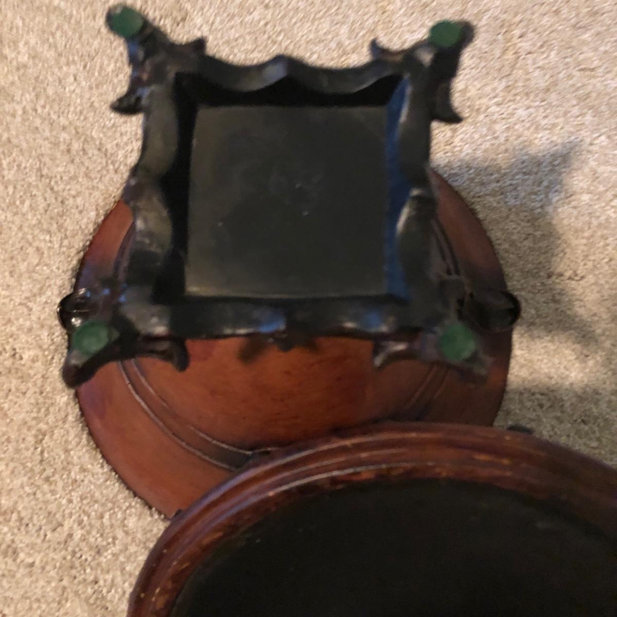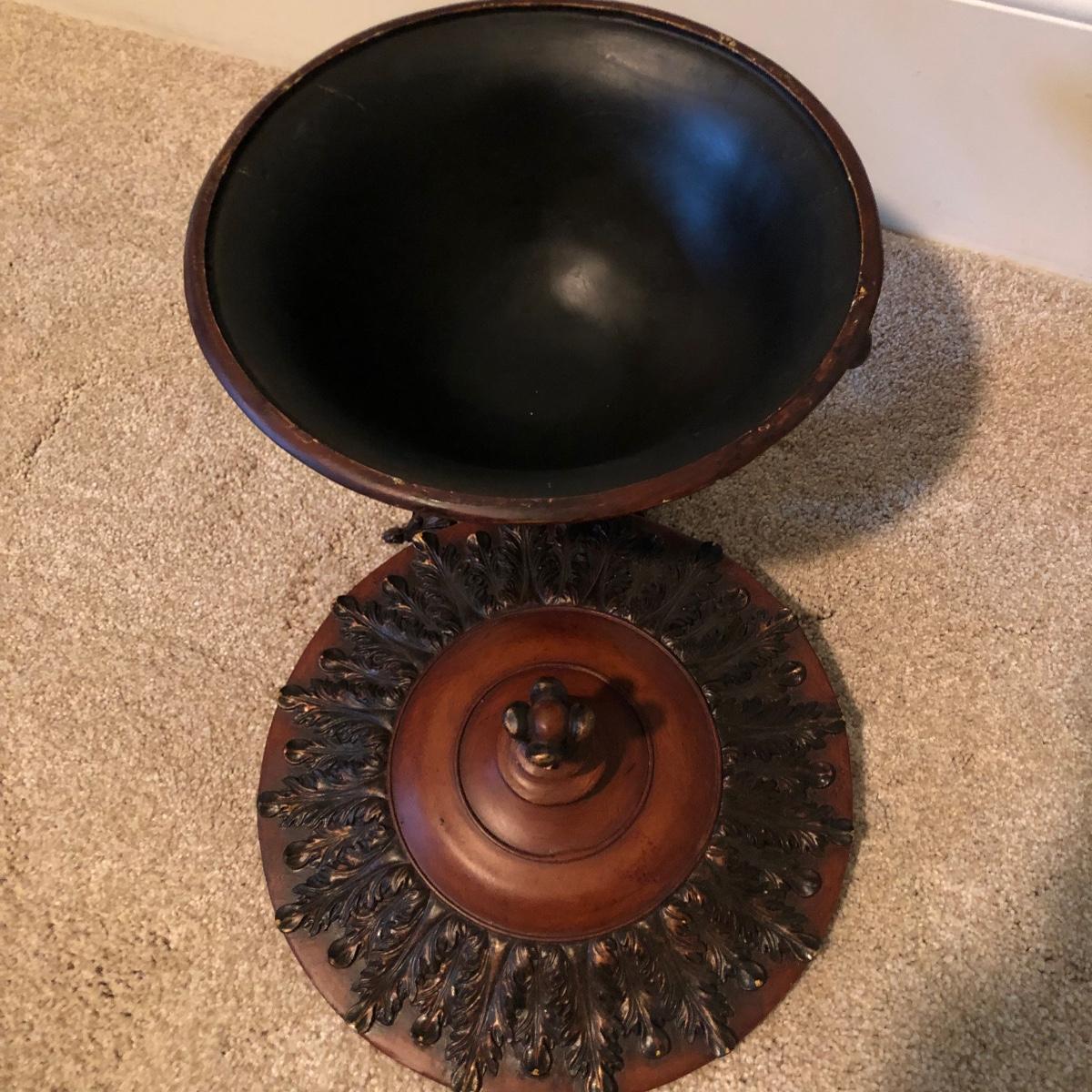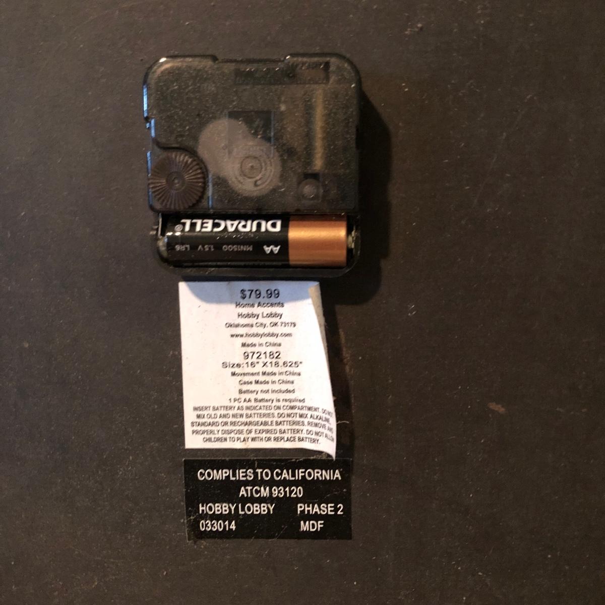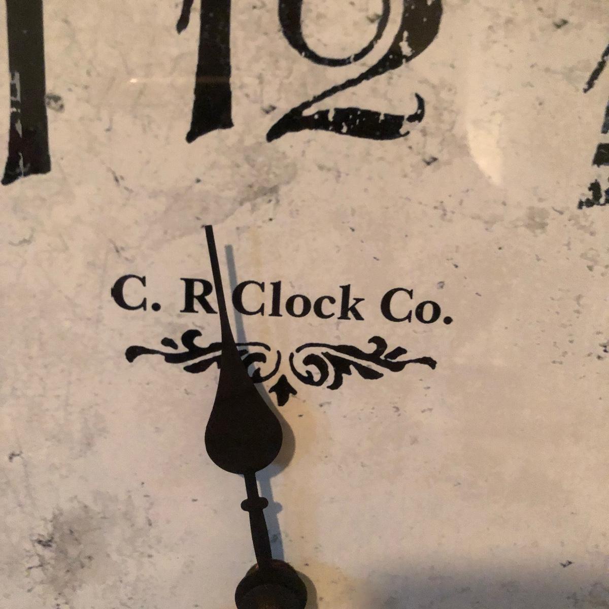 Lot includes one large decorative red metal wall clock by C.R. Clock Co. and a footed dish with lid. Dish is resin and clock is metal with a battery powered mechanism that was not tested as it appears battery is dead. Clock measures 16” x 16” x 2.5”.