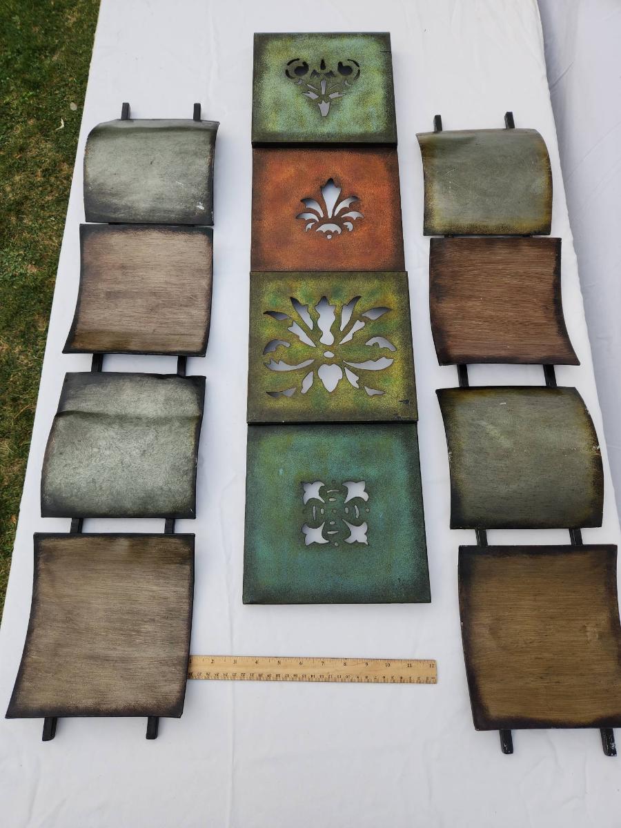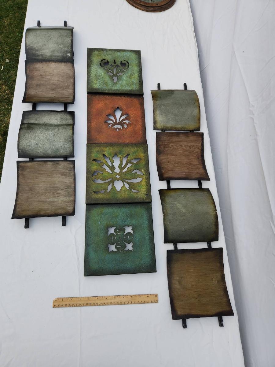 Nine pieces of metal wall decor featuring square panels with various finishes, including green, brown, and rust tones. The central panels have decorative cutout designs: a fleur-de-lis, a floral motif, and a cross shape. The surrounding panels are textured and curved with metal framing. Approximately 4 feet in total height when assembled, based on the pictured ruler for scale. Overall condition looks suitable for display.