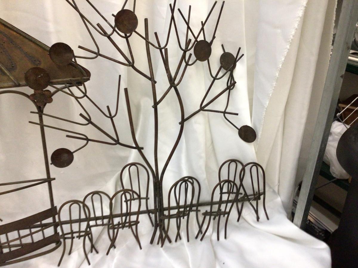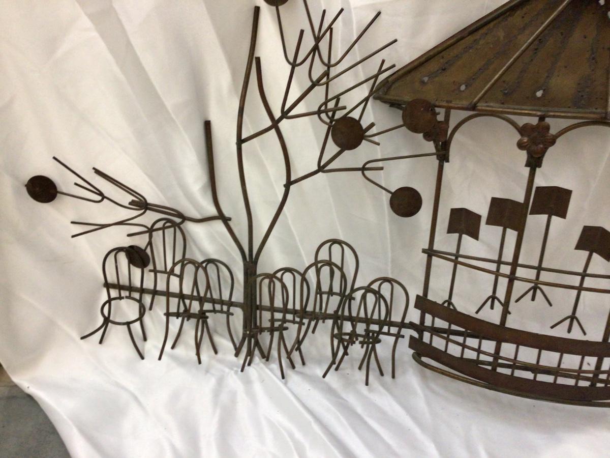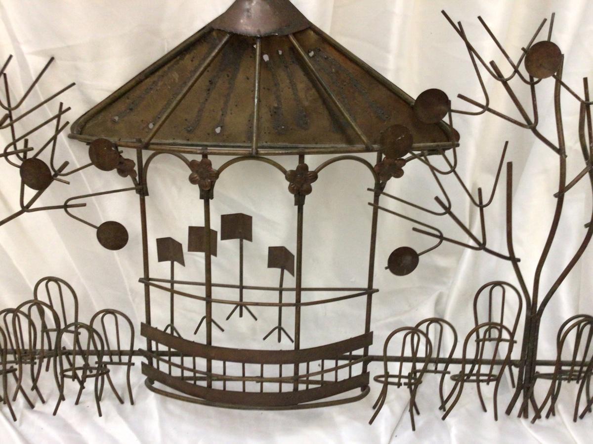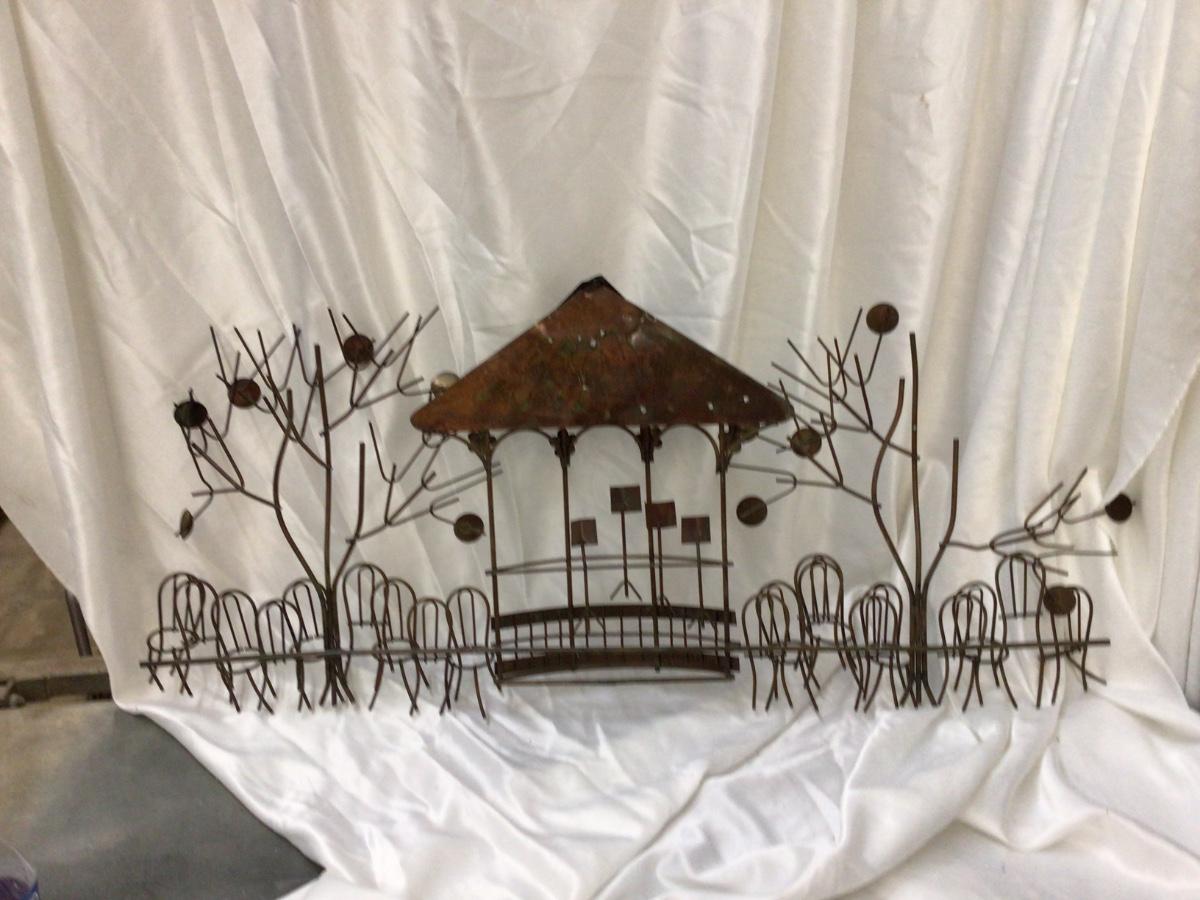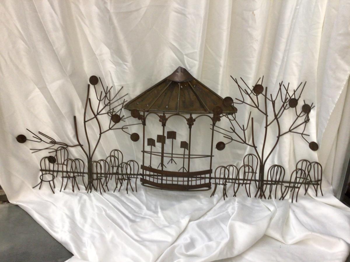 You get a great metal wall hanging called Concert in the Park. It has a stage with music stands and chairs with trees.