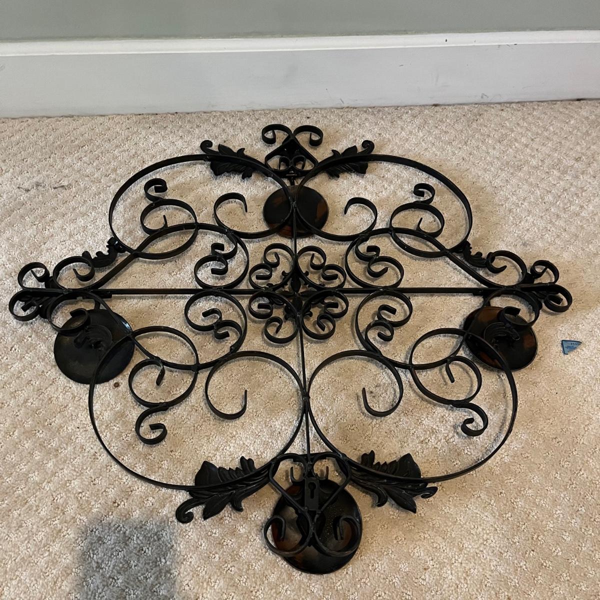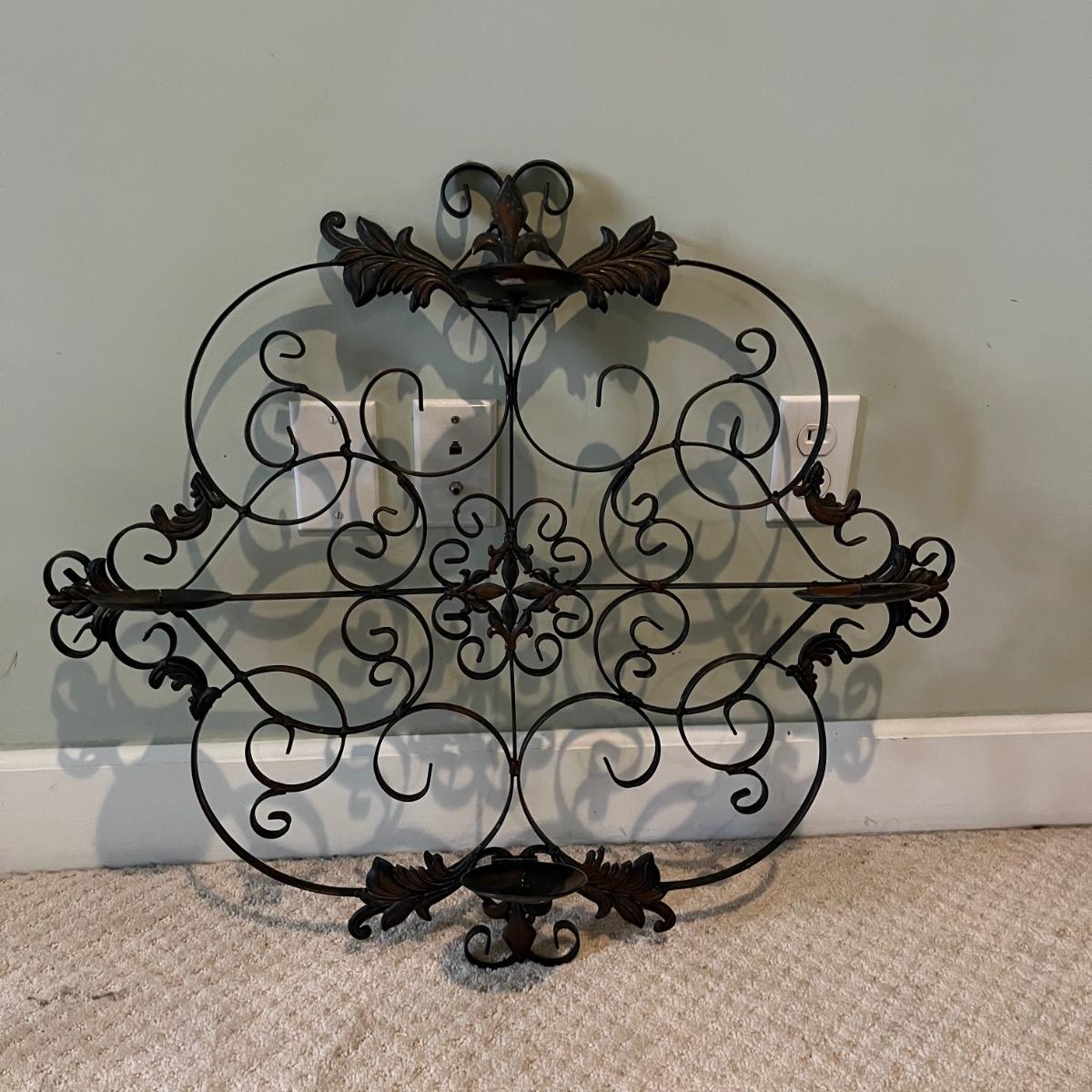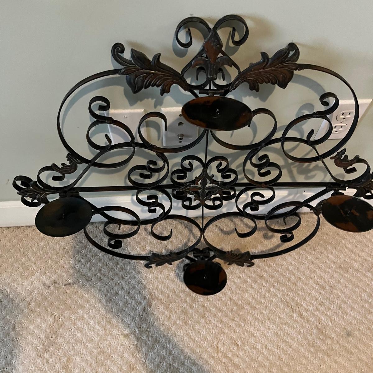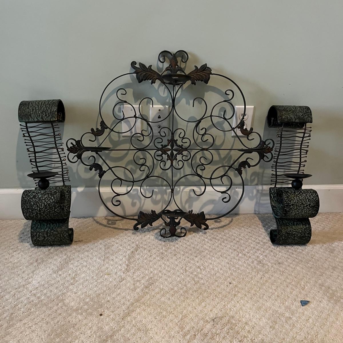 Lot includes a pair of metal wall mounted candle holders and a metal wall mounted four candle candleholder that measures 26” x 28” x 5.5”.