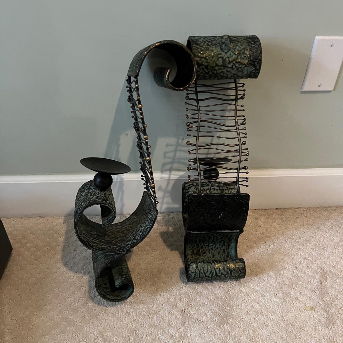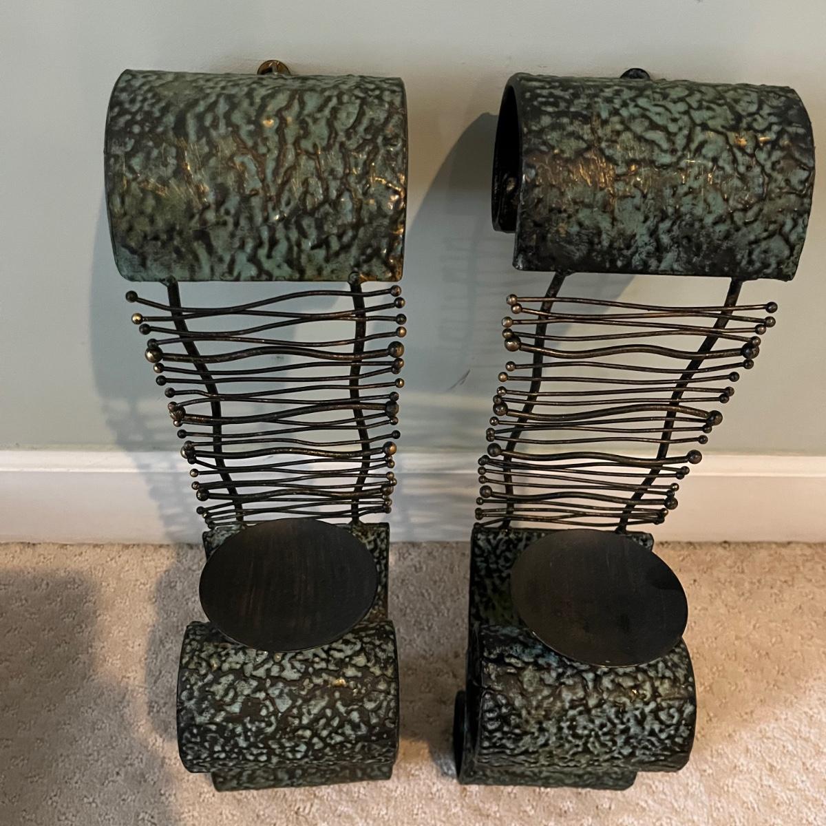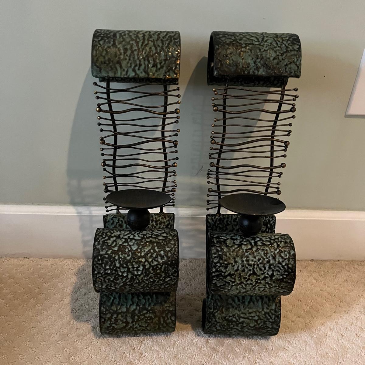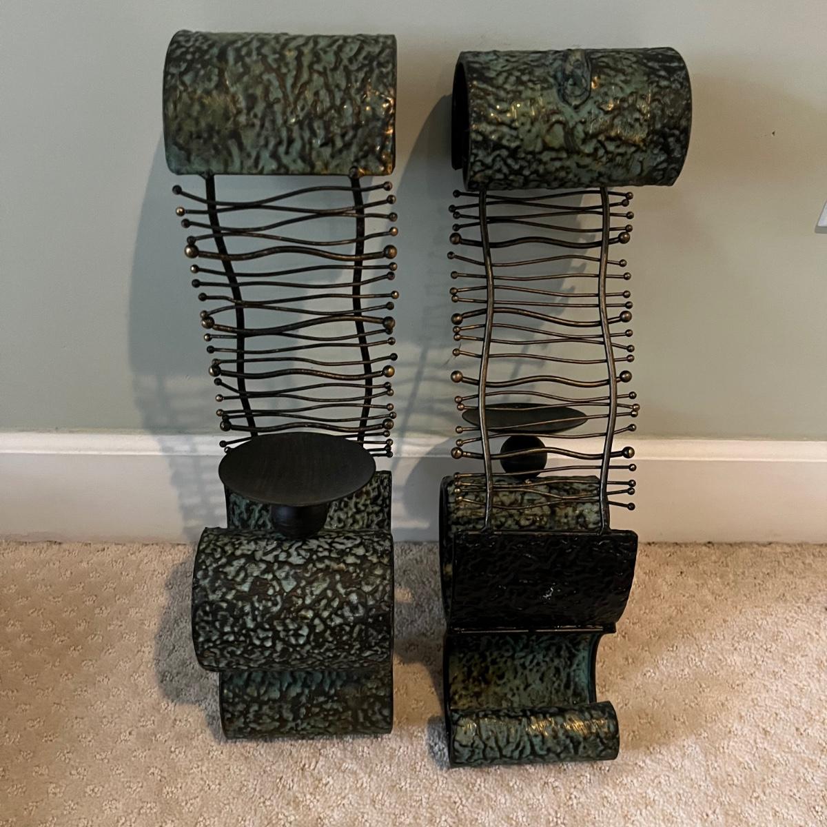 Lot includes a pair of metal wall mounted candle holders and a metal wall mounted four candle candleholder that measures 26” x 28” x 5.5”.