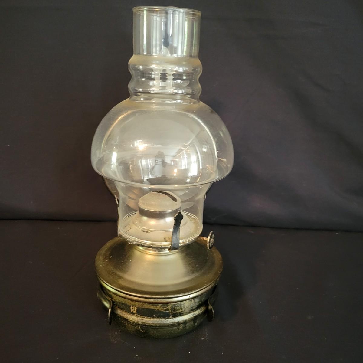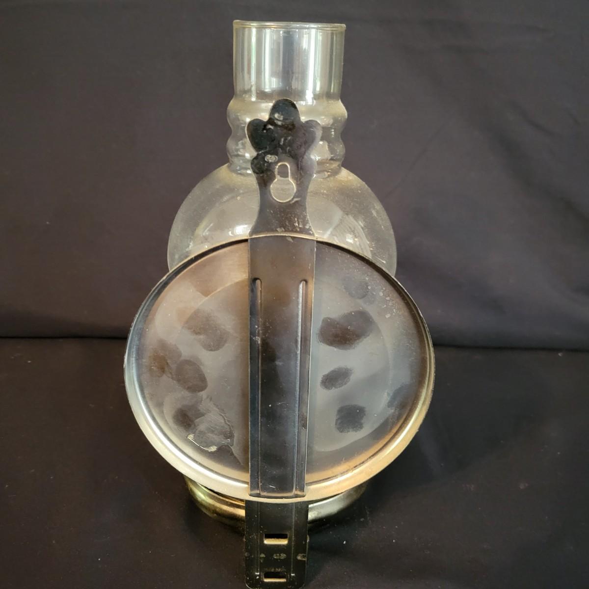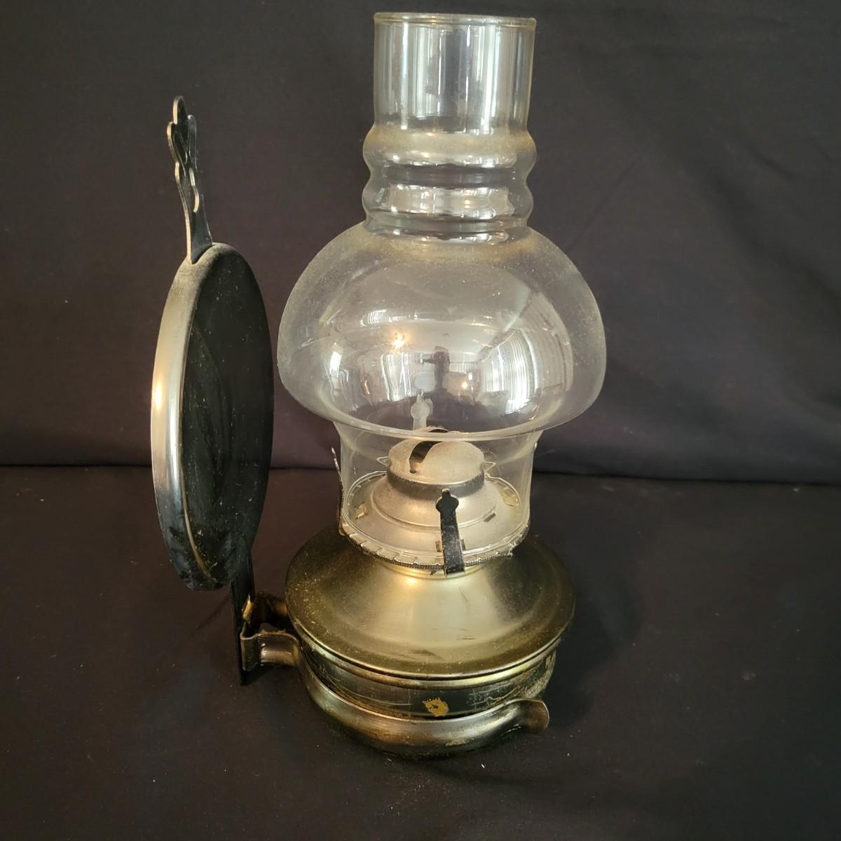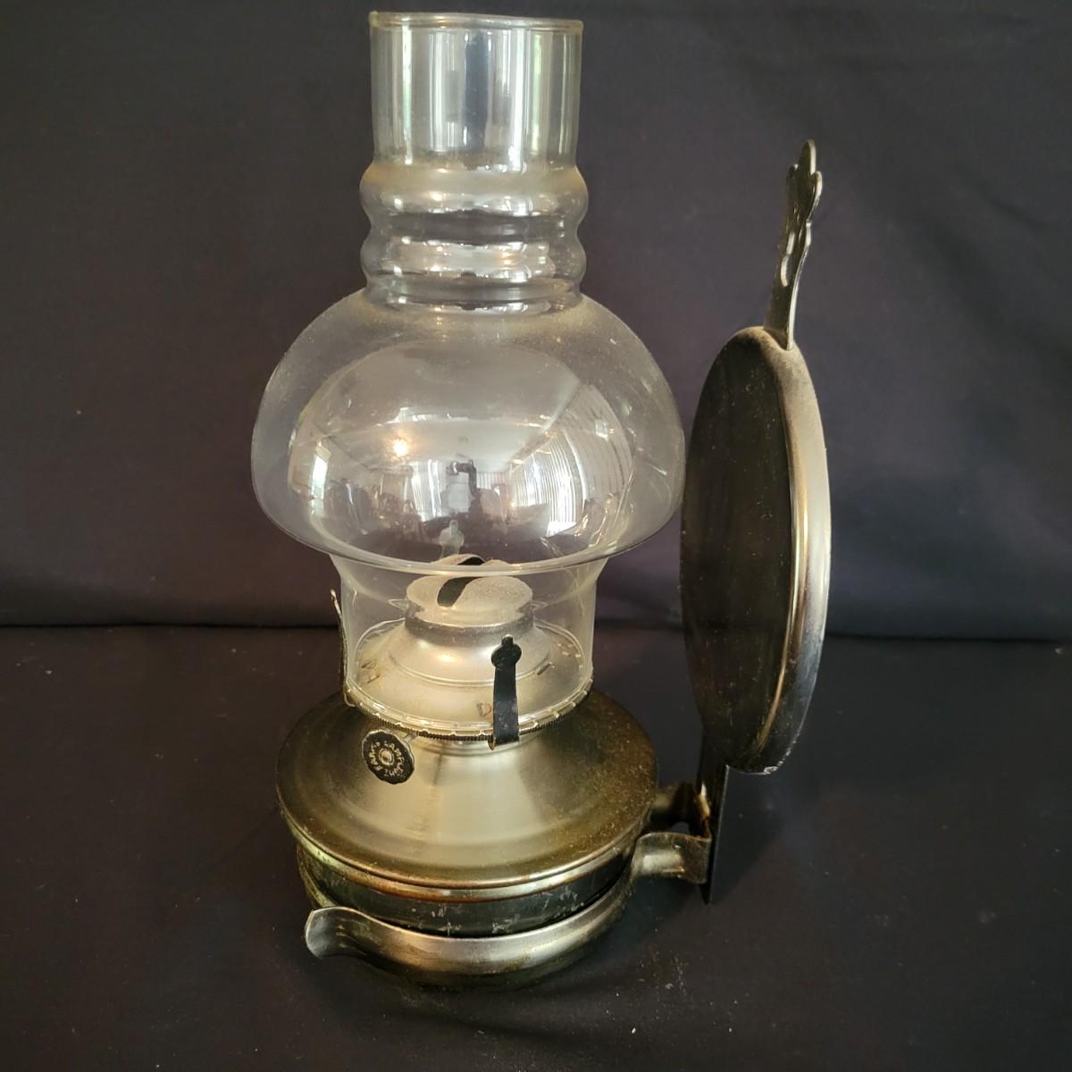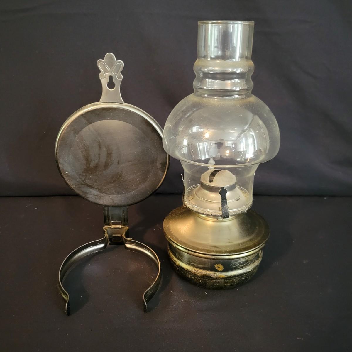 A metal, wall mount glass hurricane lamp with a reflector. It appears to made of thin steel and measures approximately 4.5" x 6" x 11"H. Shipping available