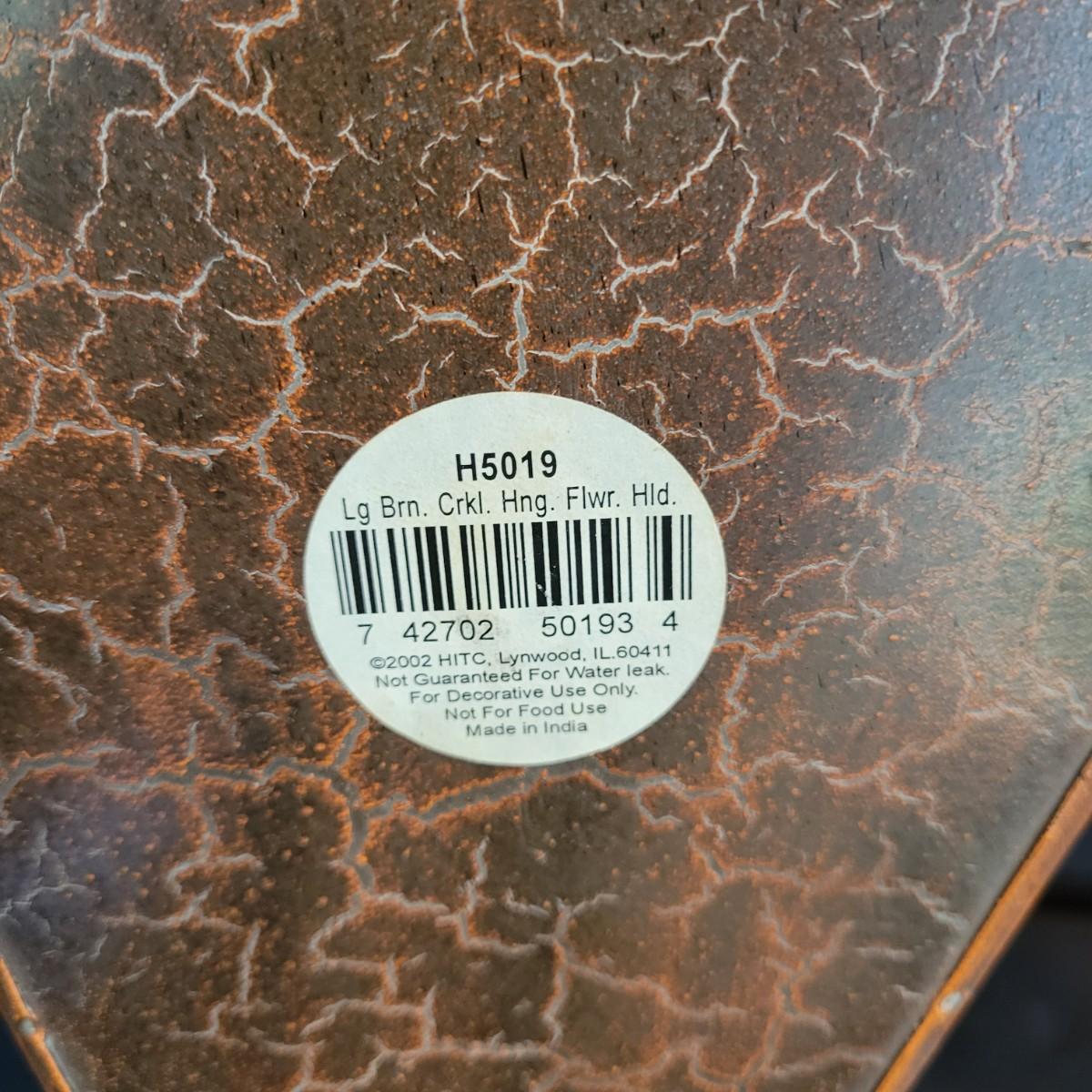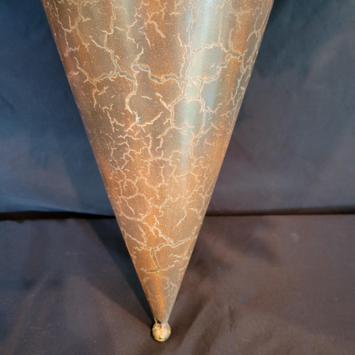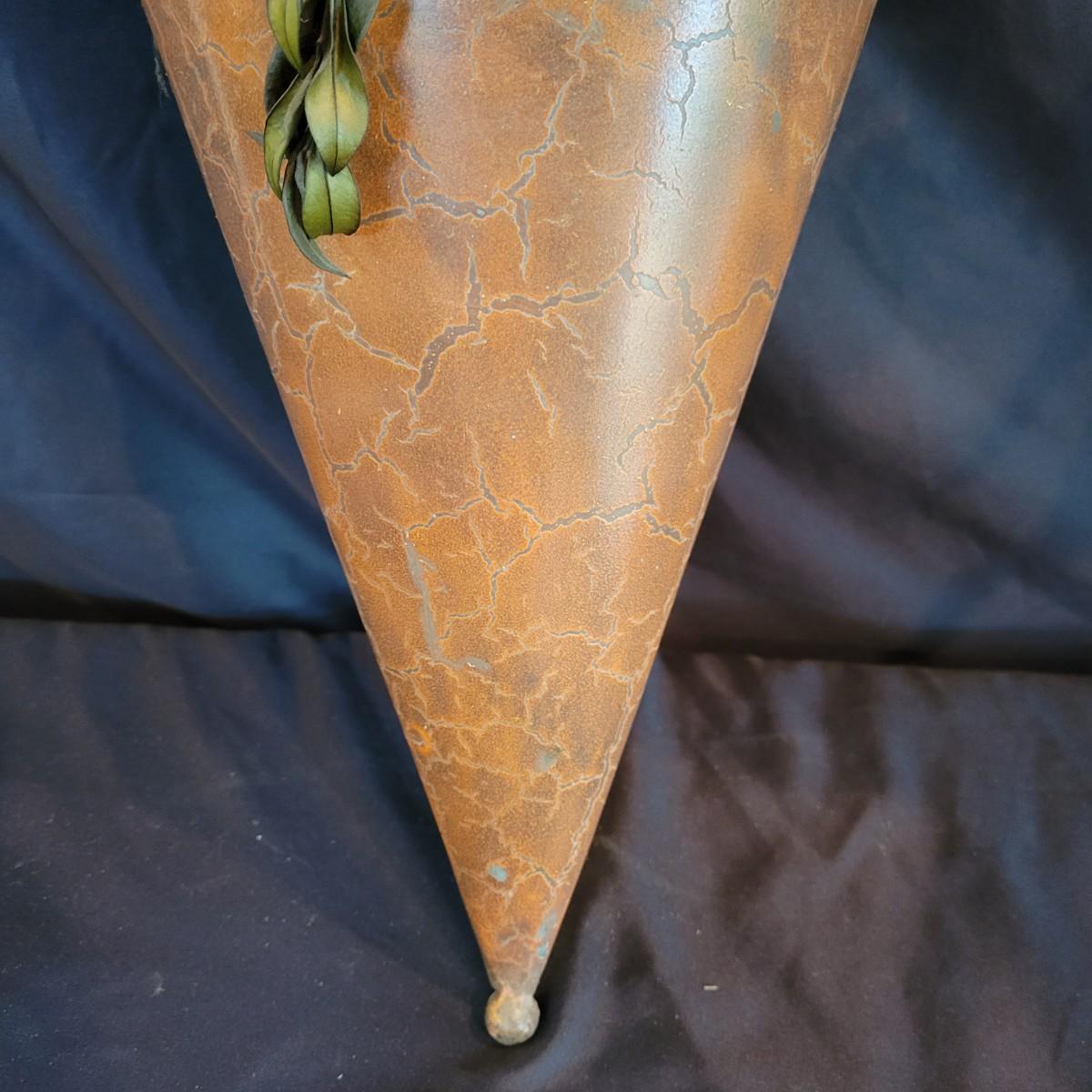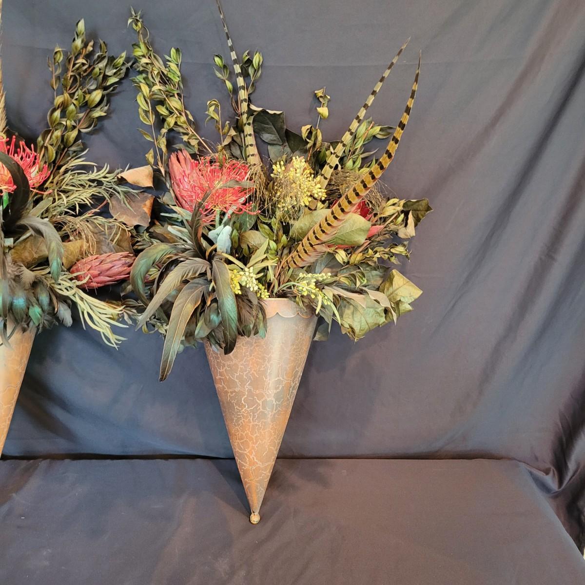 A pair of metal wall vases with a faux crackled finish and a flat back. Included are the silk flower arrangements that include pheasant feathers. They measure approximately 24" x 33"H including the arrangements. Shipping available