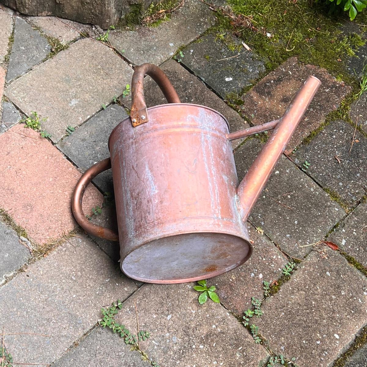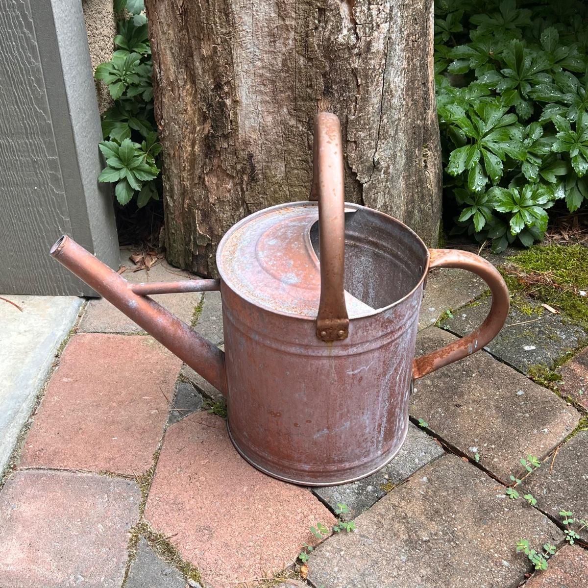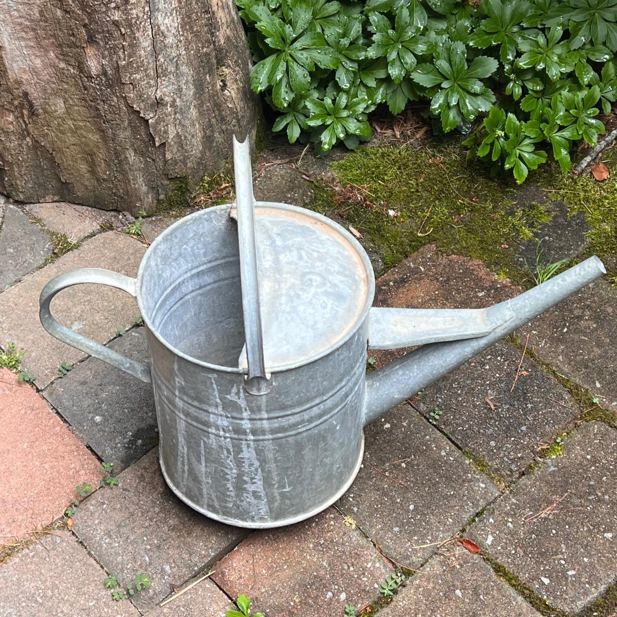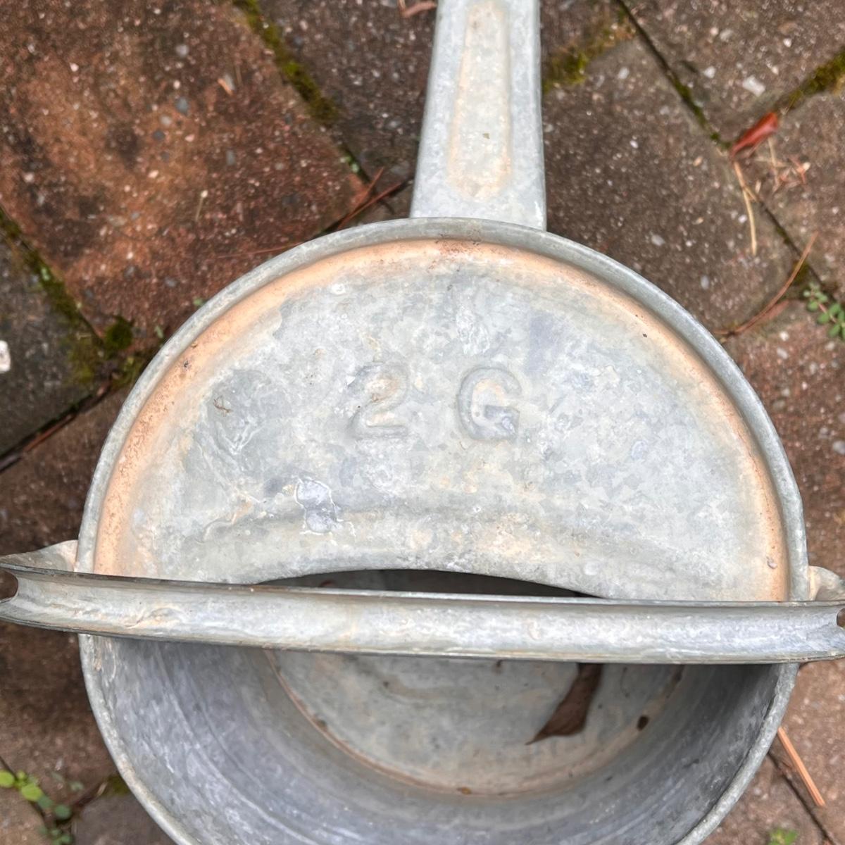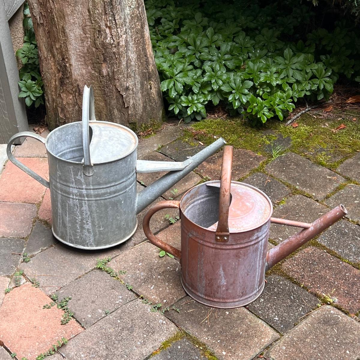 Lot includes two metal watering cans. In sturdy condition but do have some tarnish - see pictures. The silver colored can appears to be able to hold 2 gallons. The larger one (silver) measures 21” x 11”H and the smaller 18” x 14”H. Shipping available.