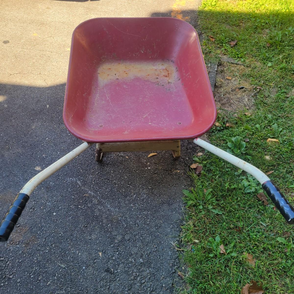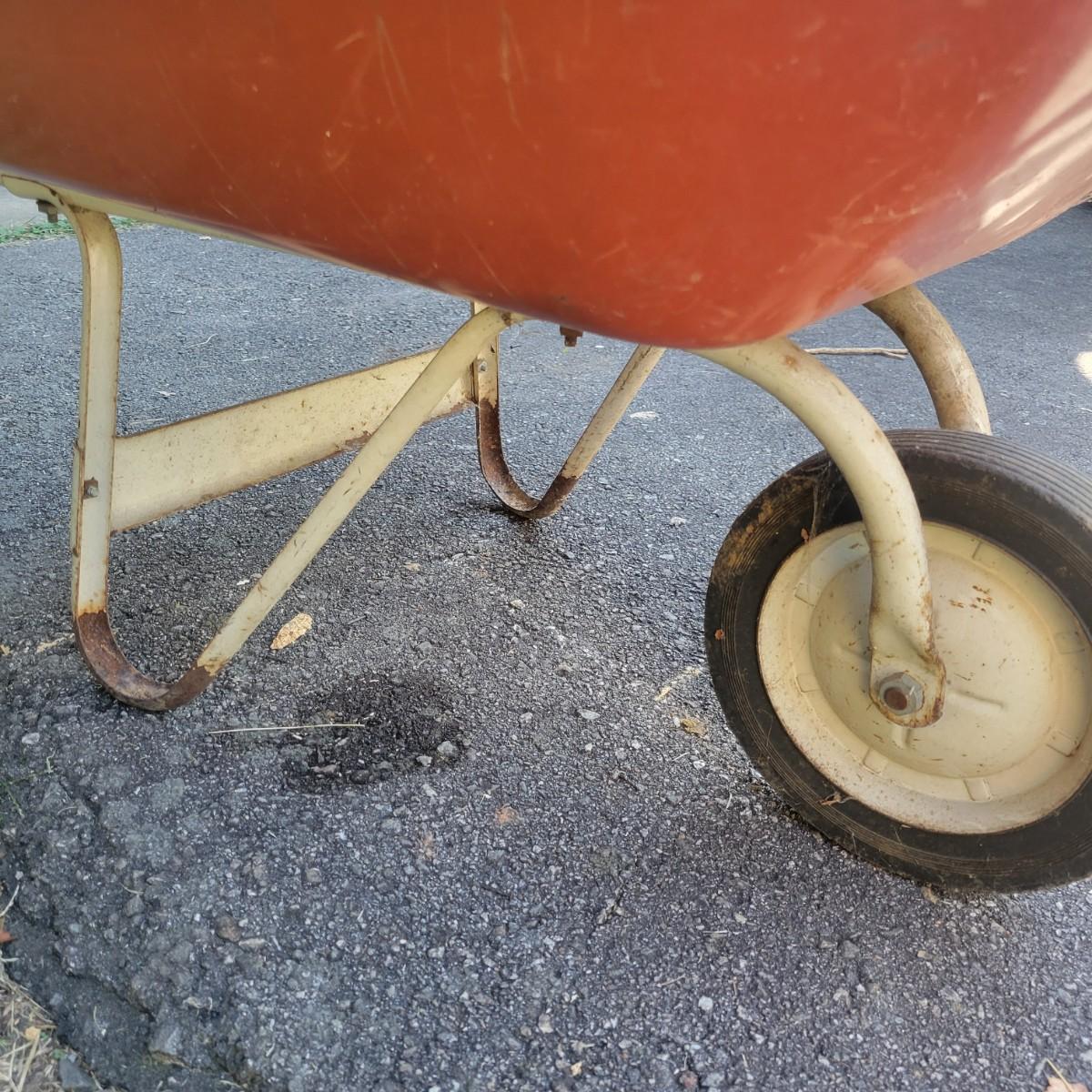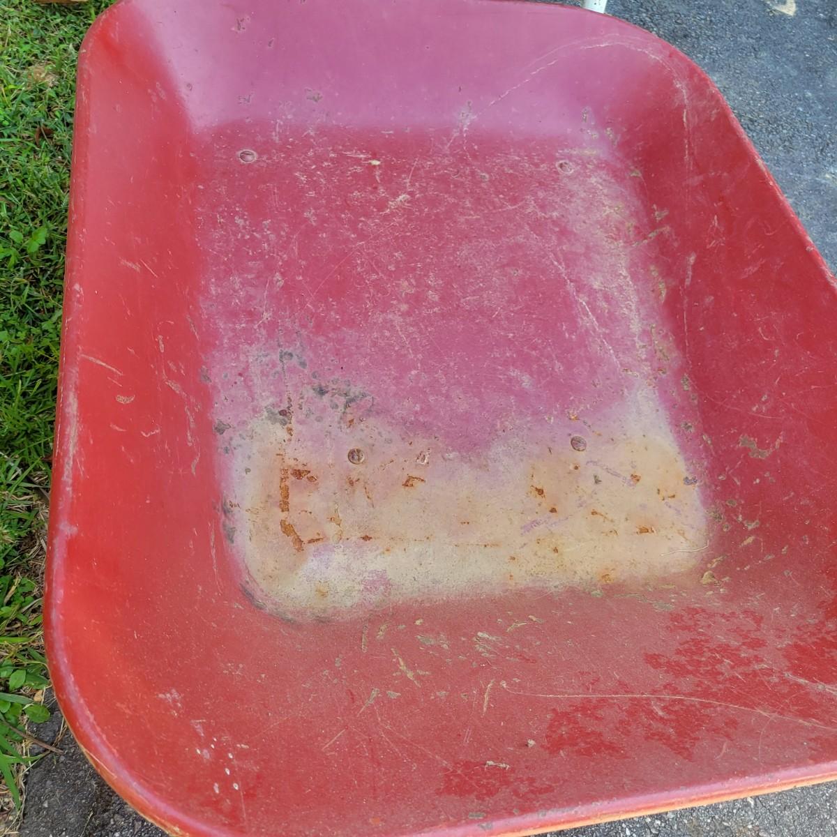 A metal wheelbarrow in good condition with some rust wear and tear from use. This is a shallow wheelbarrow for small chores that features a solid rubber front wheel. No flat tires! Measures approximately 28" x 49" x 25" Local pickup only