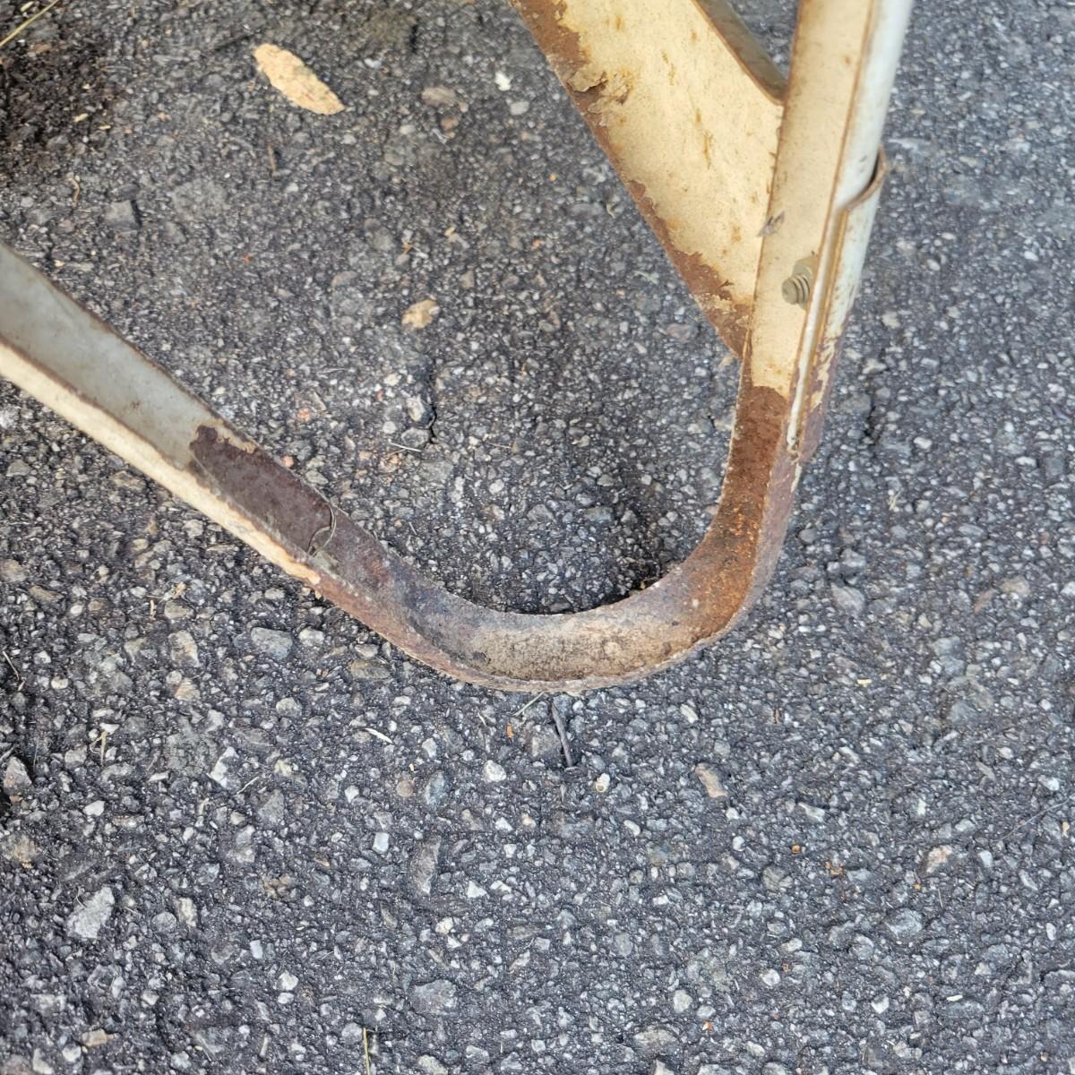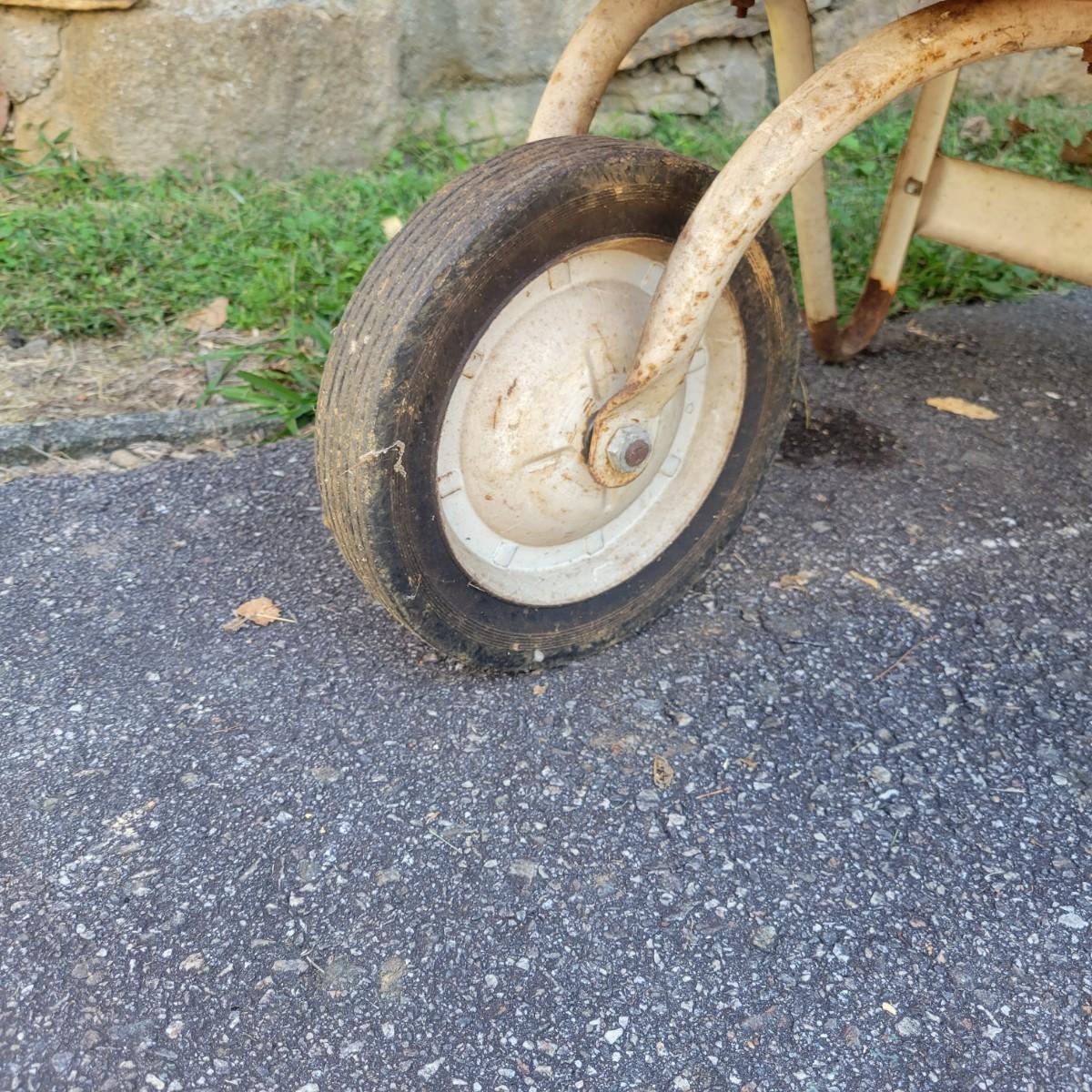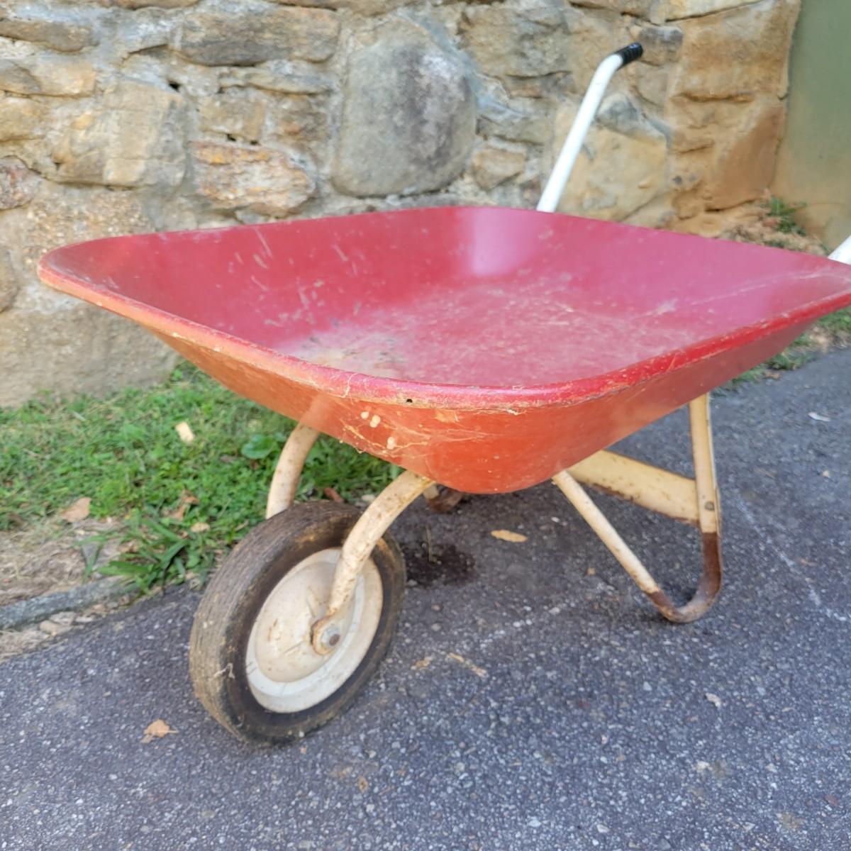 A metal wheelbarrow in good condition with some rust wear and tear from use. This is a shallow wheelbarrow for small chores that features a solid rubber front wheel. No flat tires! Measures approximately 28" x 49" x 25" Local pickup only