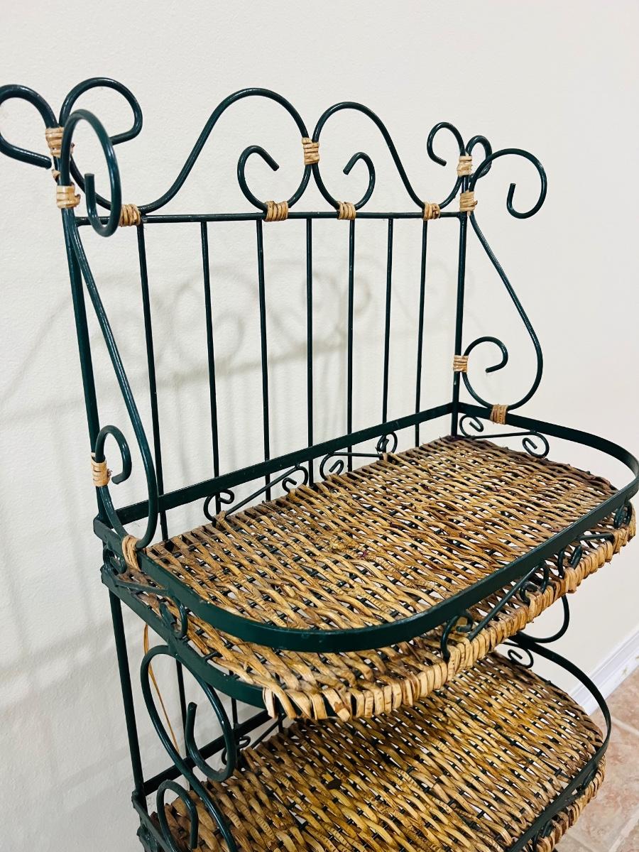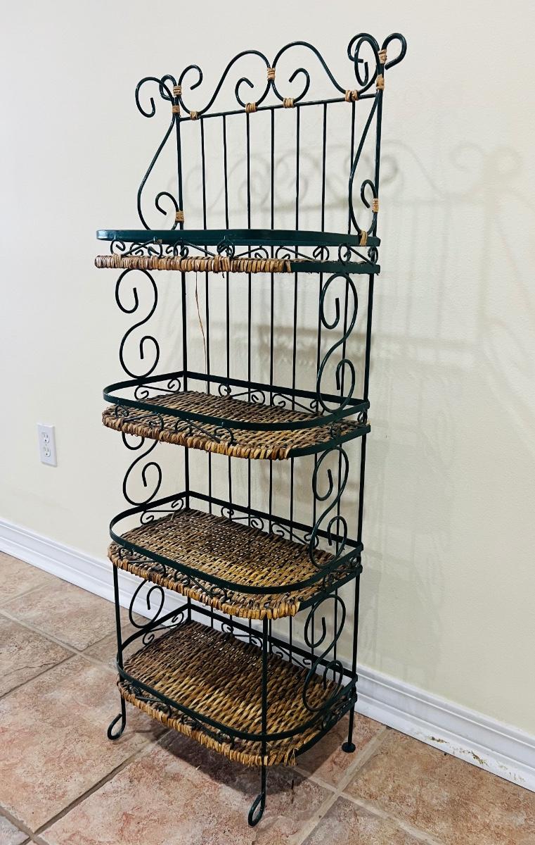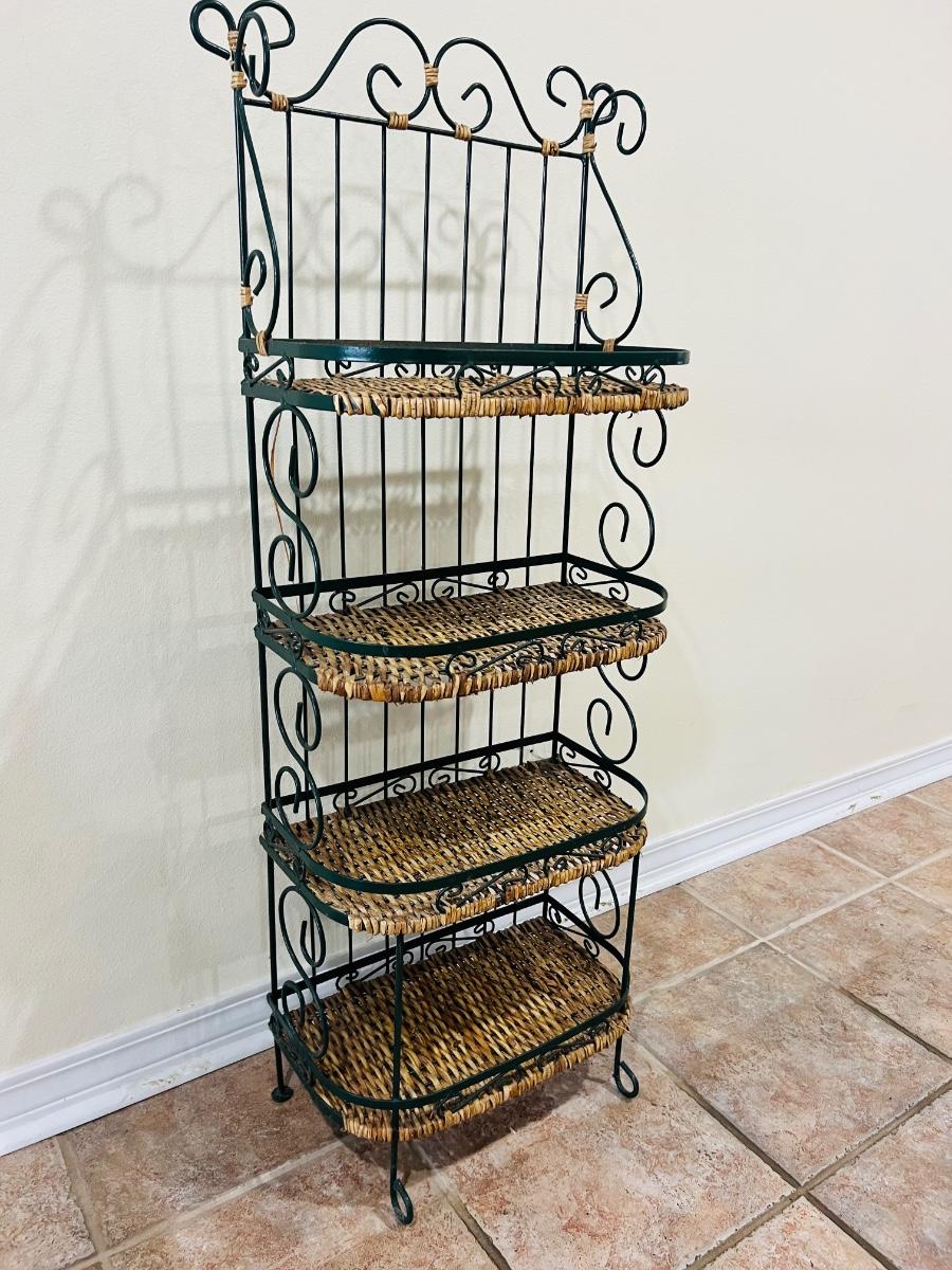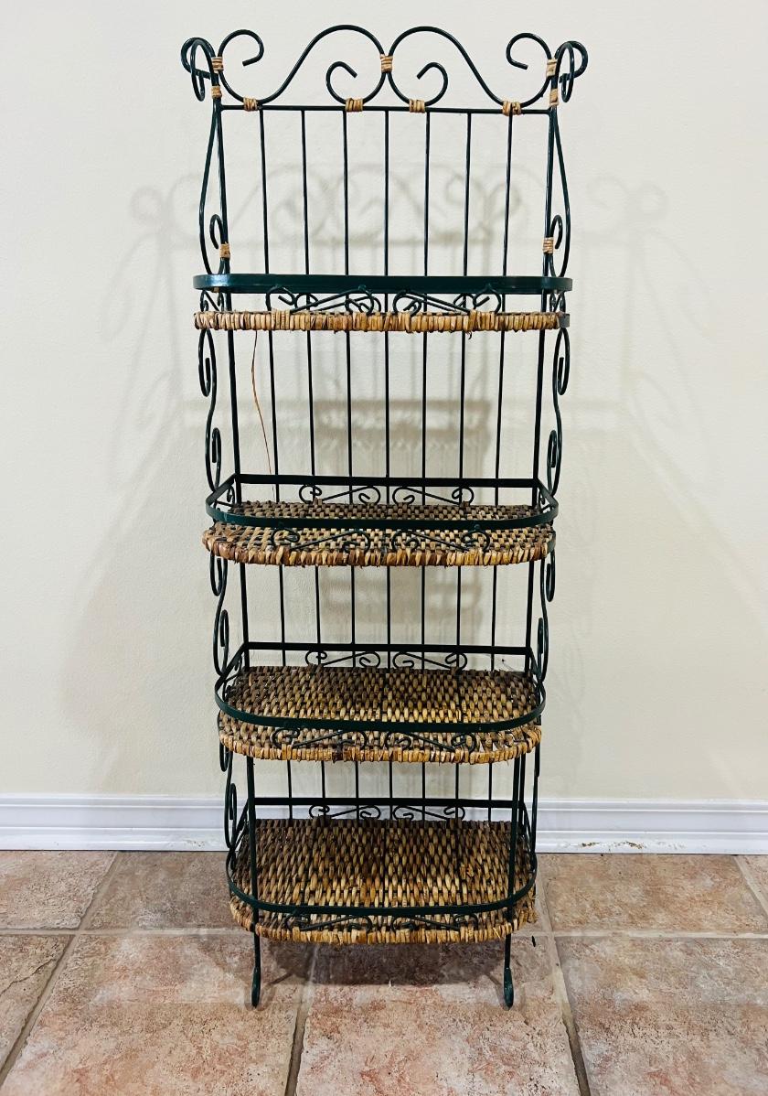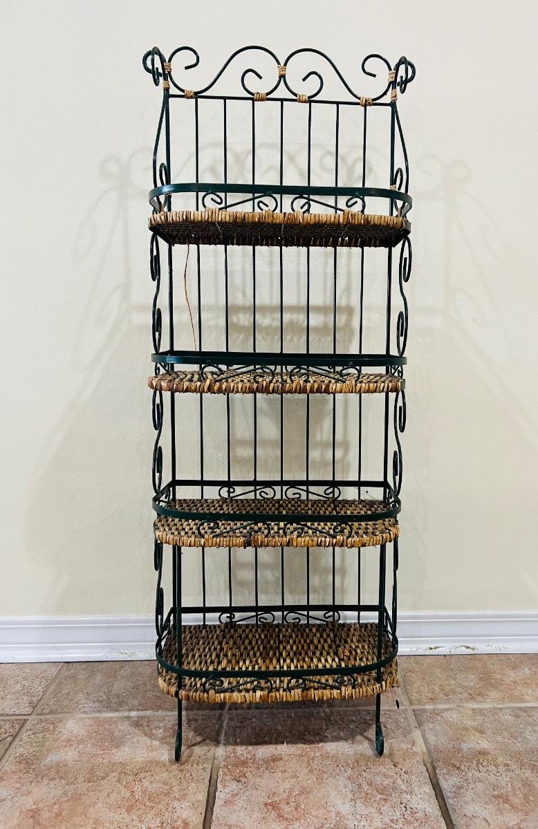 Metal & Whicker Shelf has four shelves. Measures 47 1/2 inches tall, 17 inches wide and approximately 10 inches deep.
