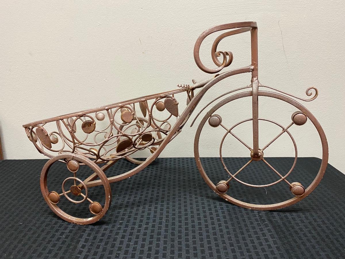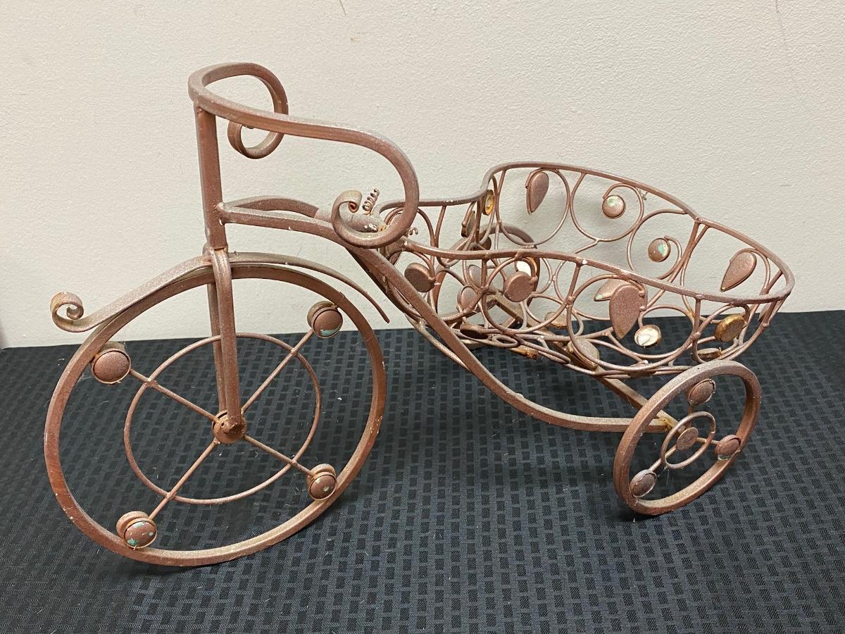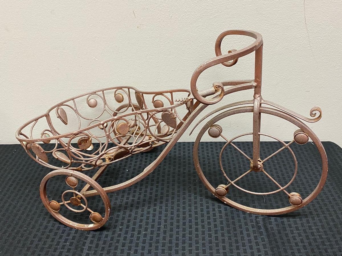 Whimsical metal tricycle bike planter basket. Has a copper color finish. In good outdoor use condition. About 14"x20" size.