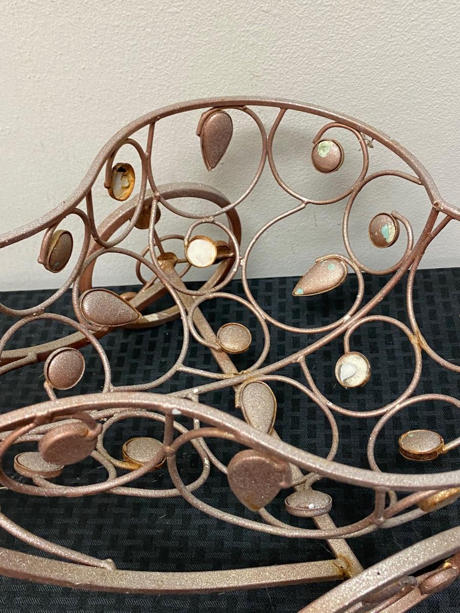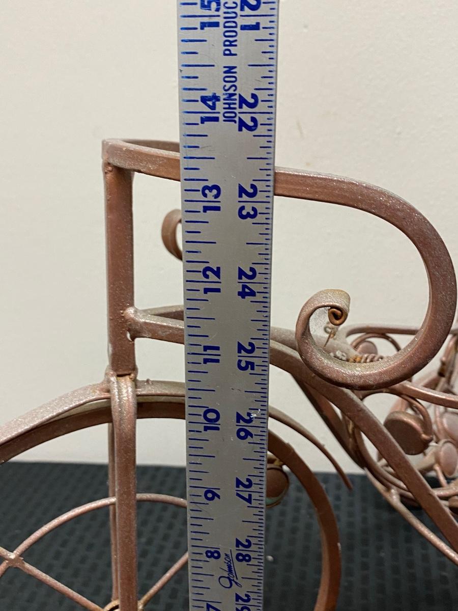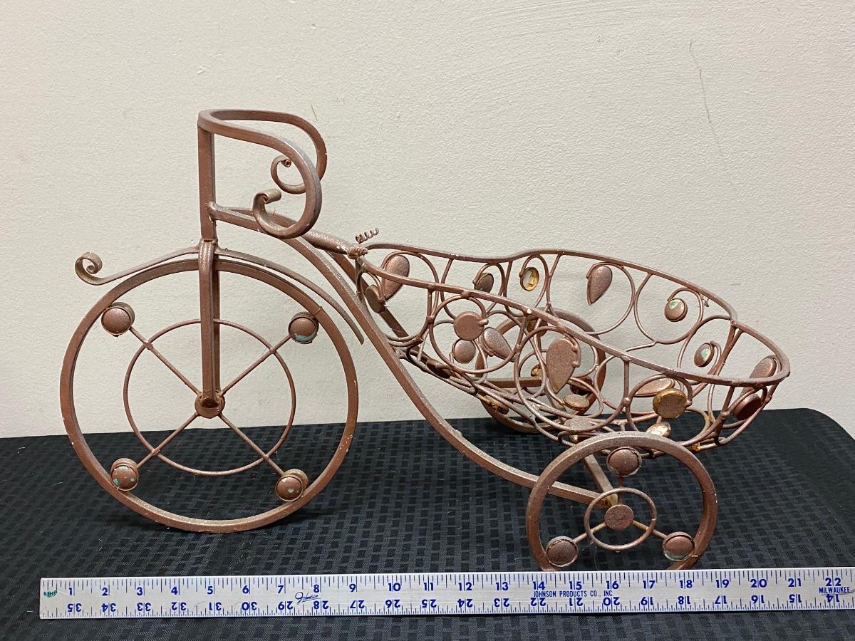 Whimsical metal tricycle bike planter basket. Has a copper color finish. In good outdoor use condition. About 14"x20" size.