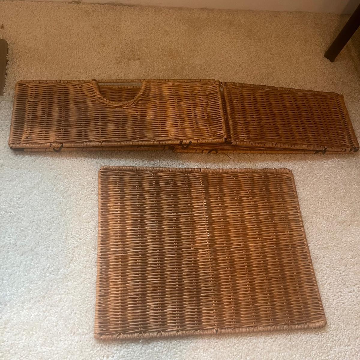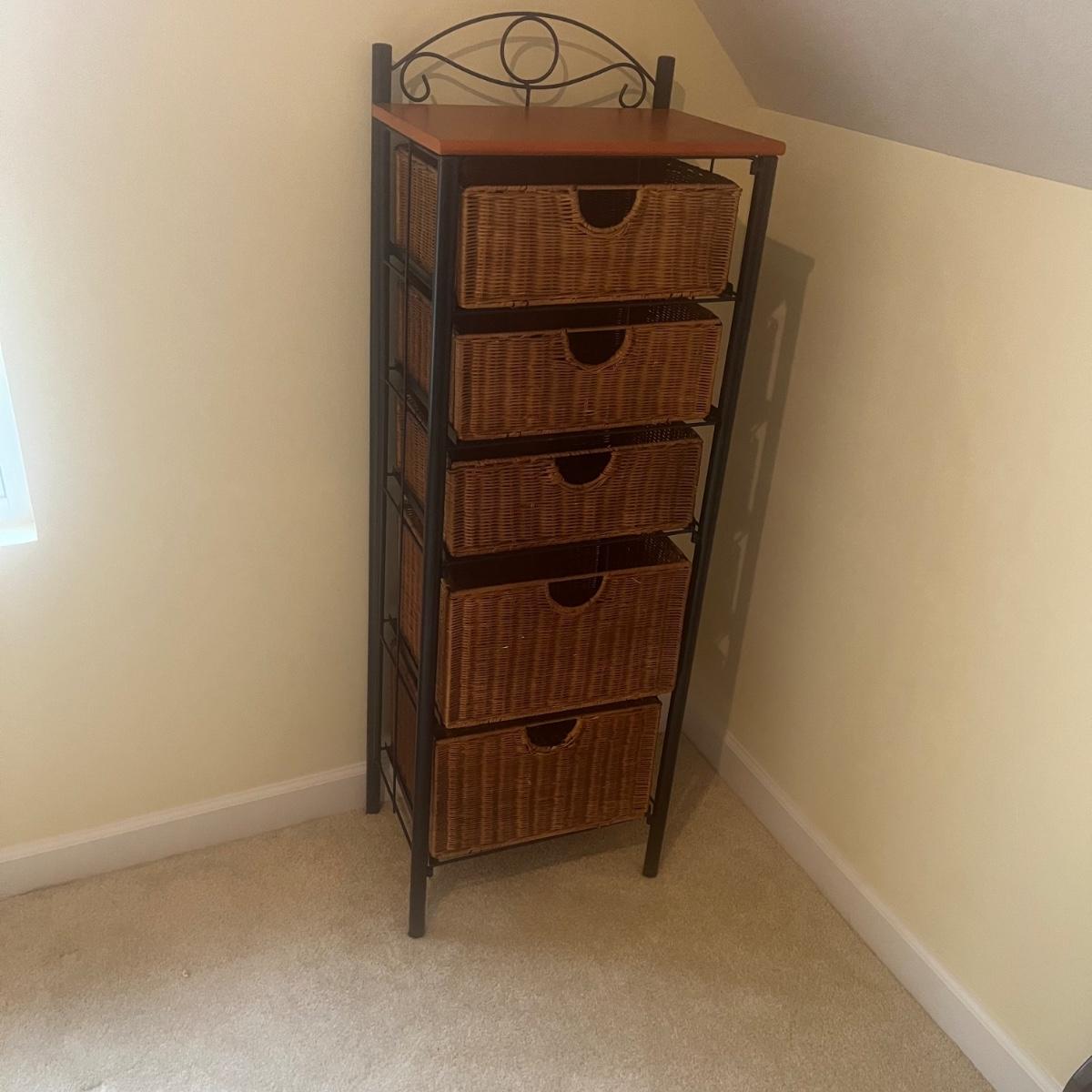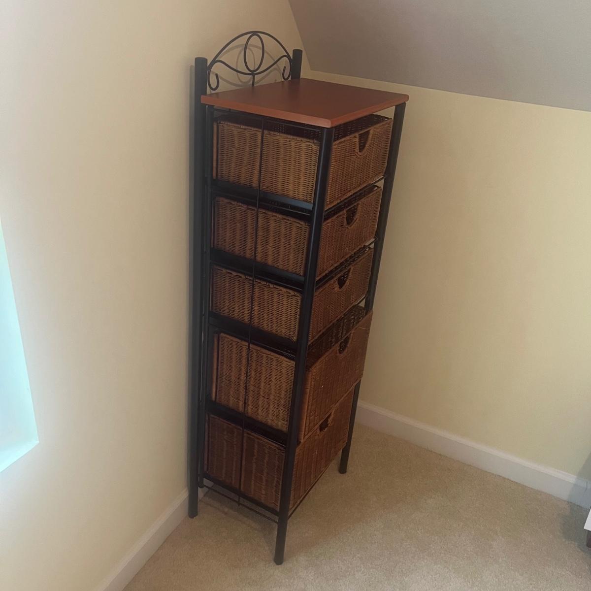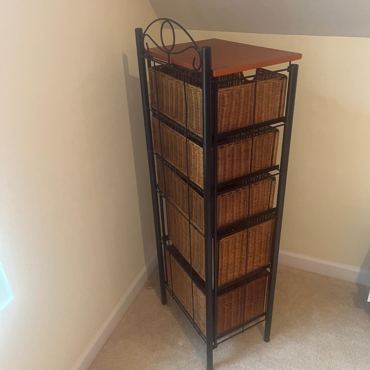 Tall black metal storage unit with five wicker rattan drawers that is collapsible for easy transport. Unit measures 17” x 13” x 52”H when open. Local Pickup Only. Item is located up one flight of stairs.