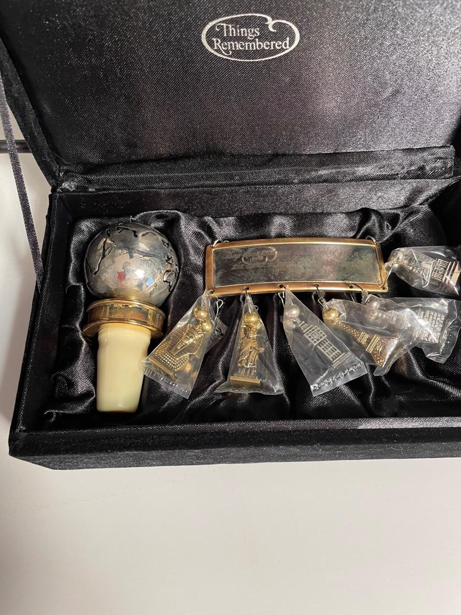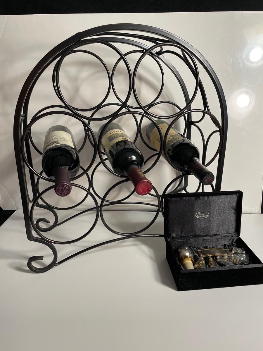 Metal wine rack is in excellent condition. Bottle stopper comes with an engraved bottle label. Wine not included