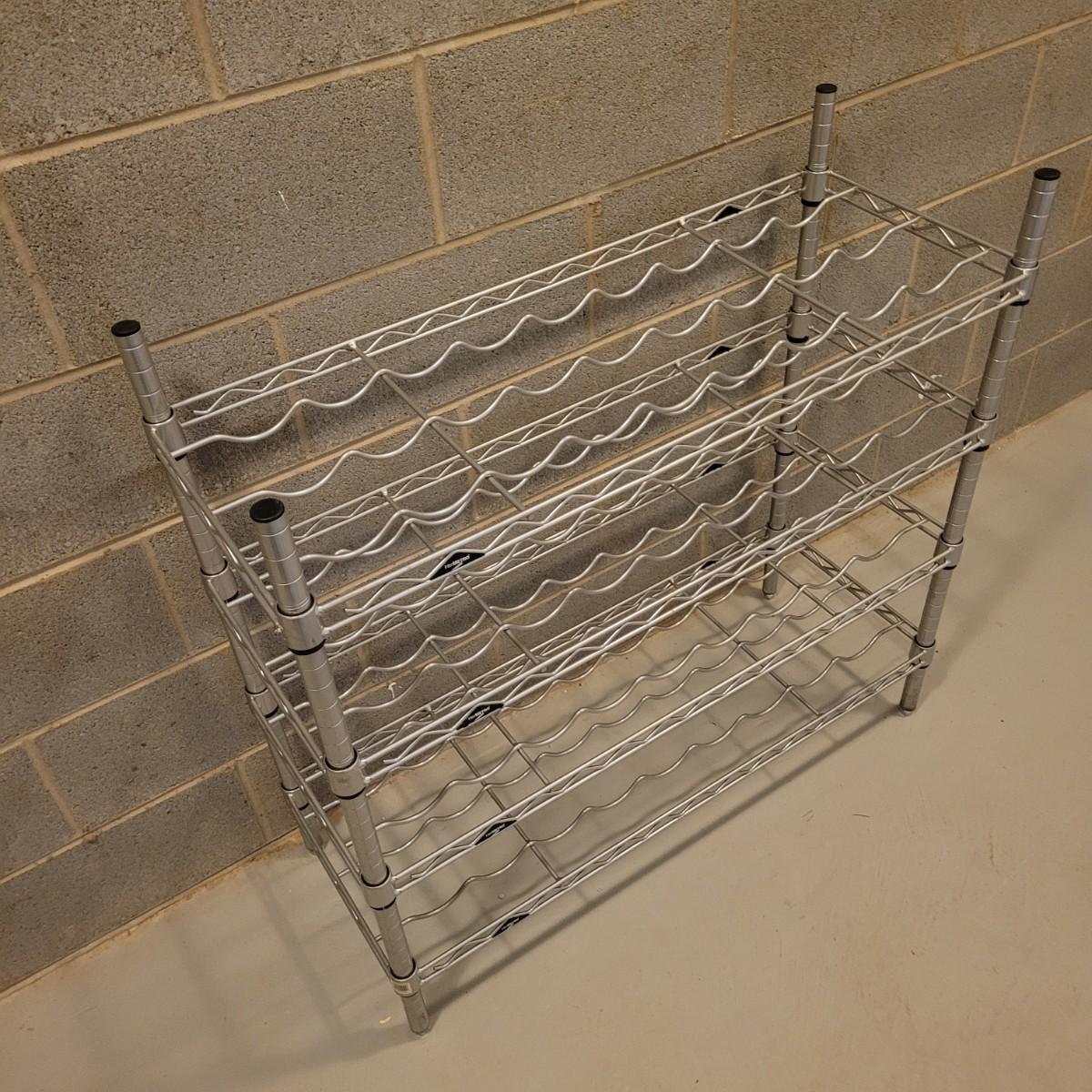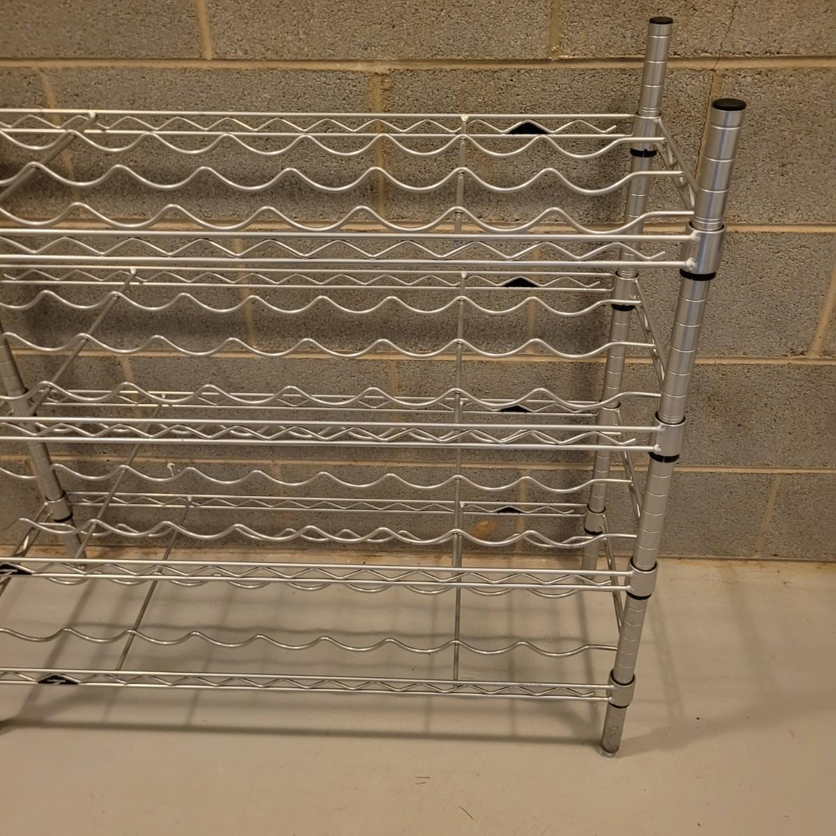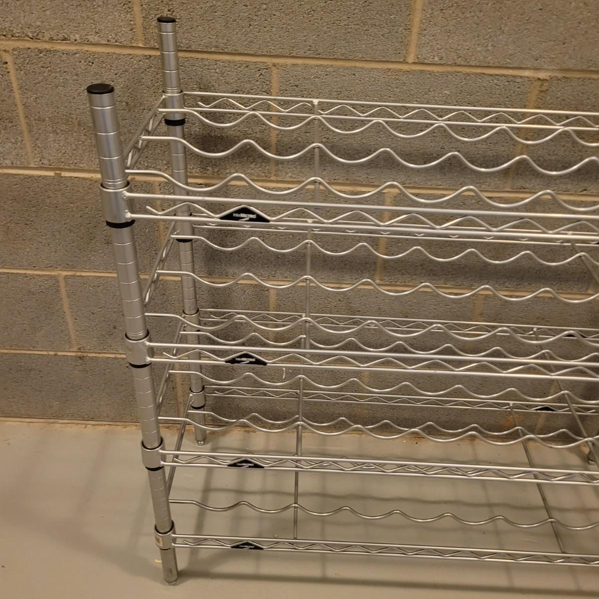 An adjustable metal wire wine rack. InterMetro brand. Includes four tiers of shelving able to hold 36 normal sized wine bottles. Also includes some extra hardware. Item measures 36" x 14" x 35"H.