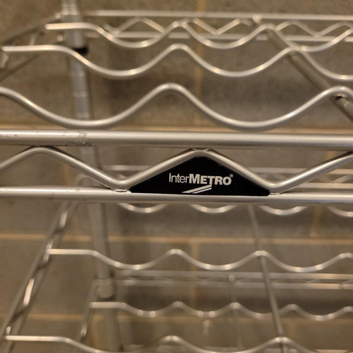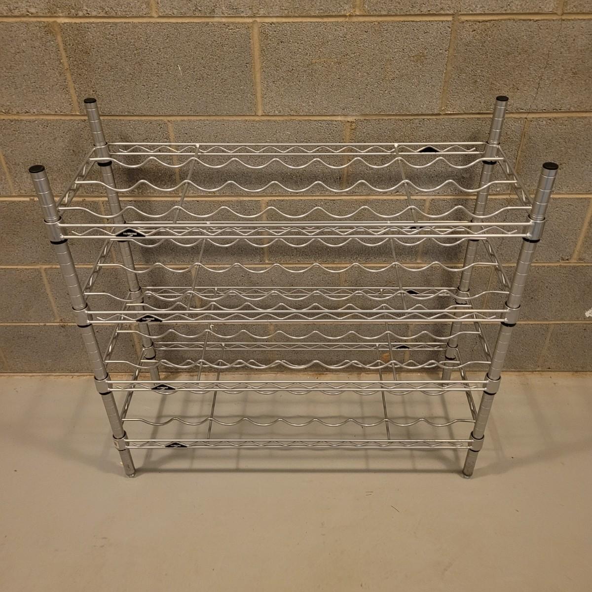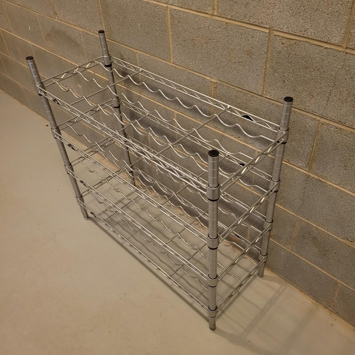 An adjustable metal wire wine rack. InterMetro brand. Includes four tiers of shelving able to hold 36 normal sized wine bottles. Also includes some extra hardware. Item measures 36" x 14" x 35"H.